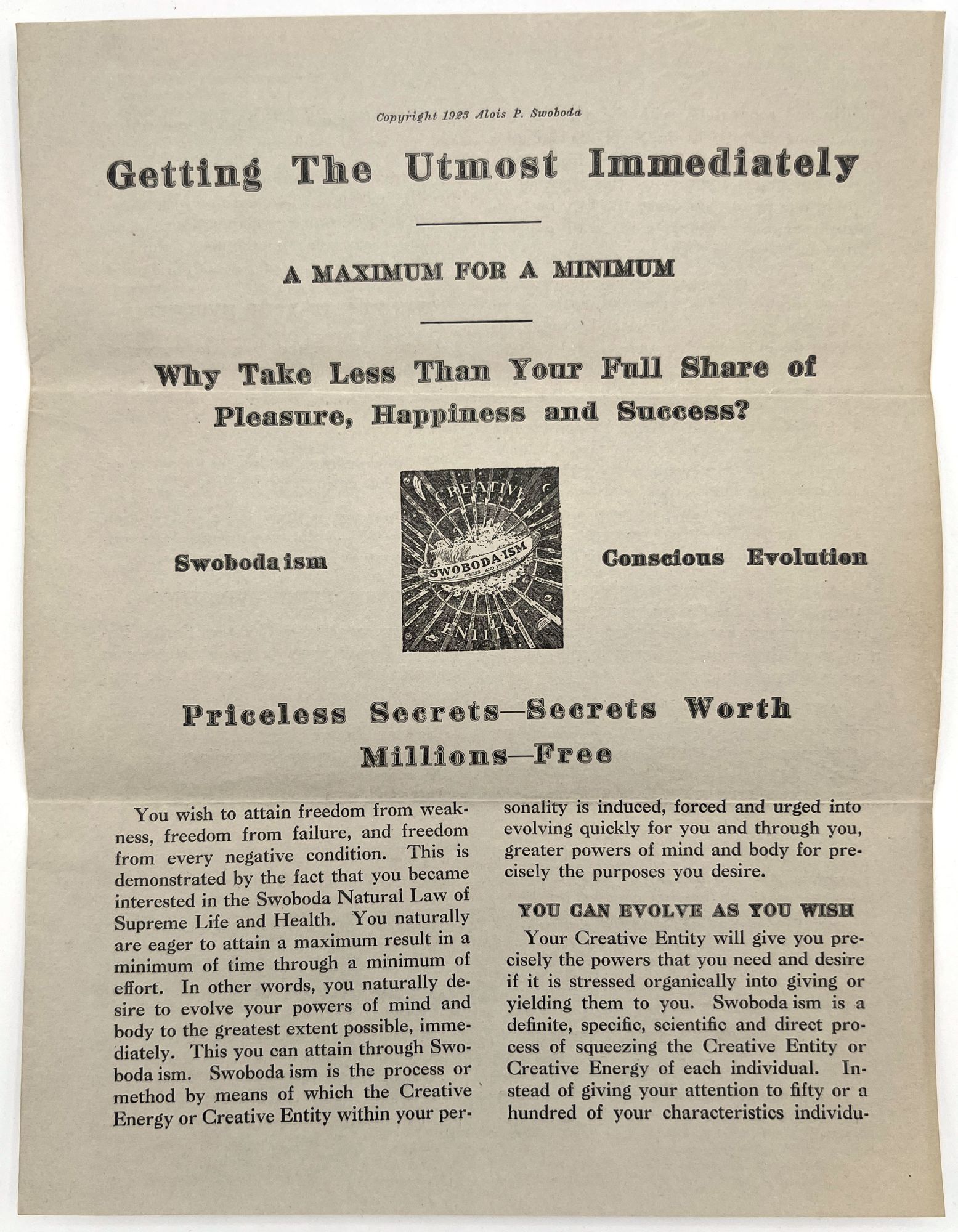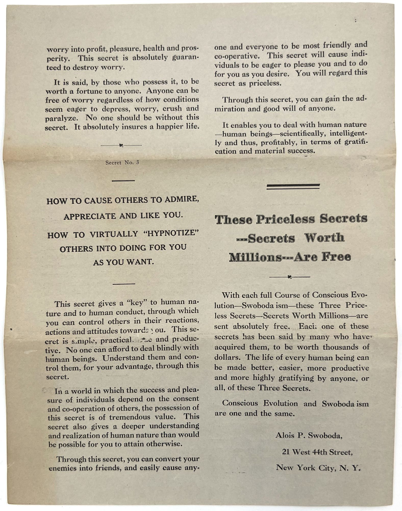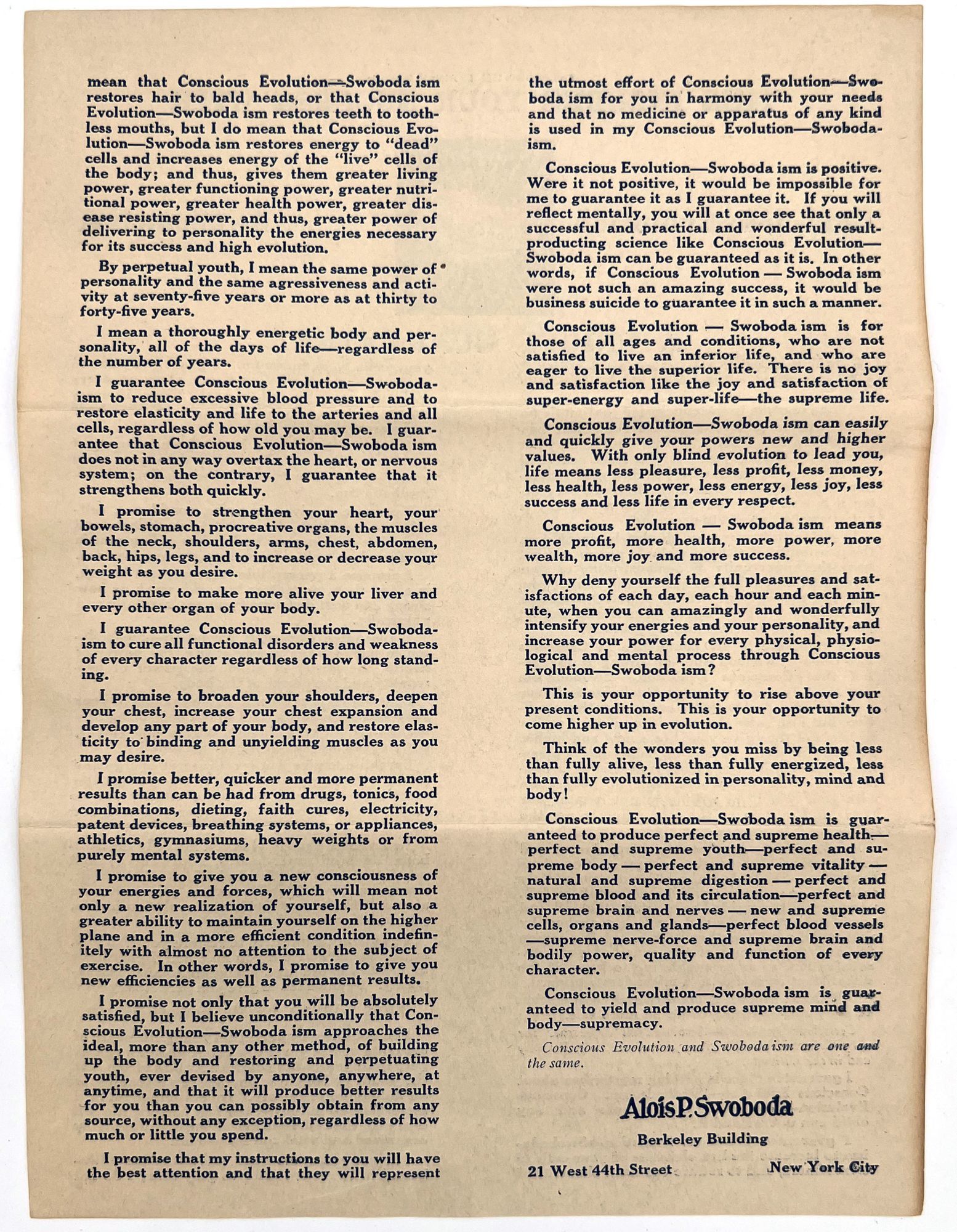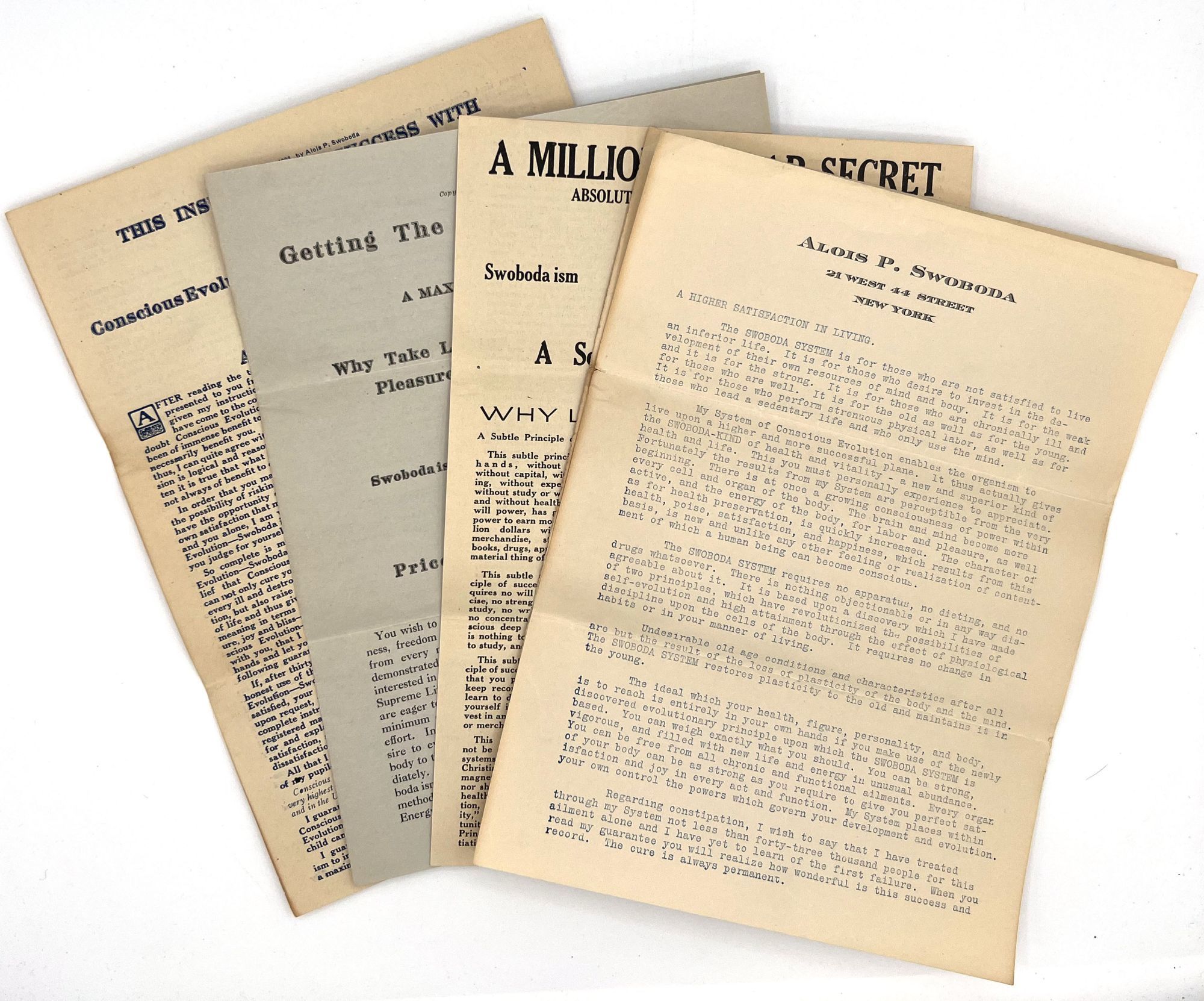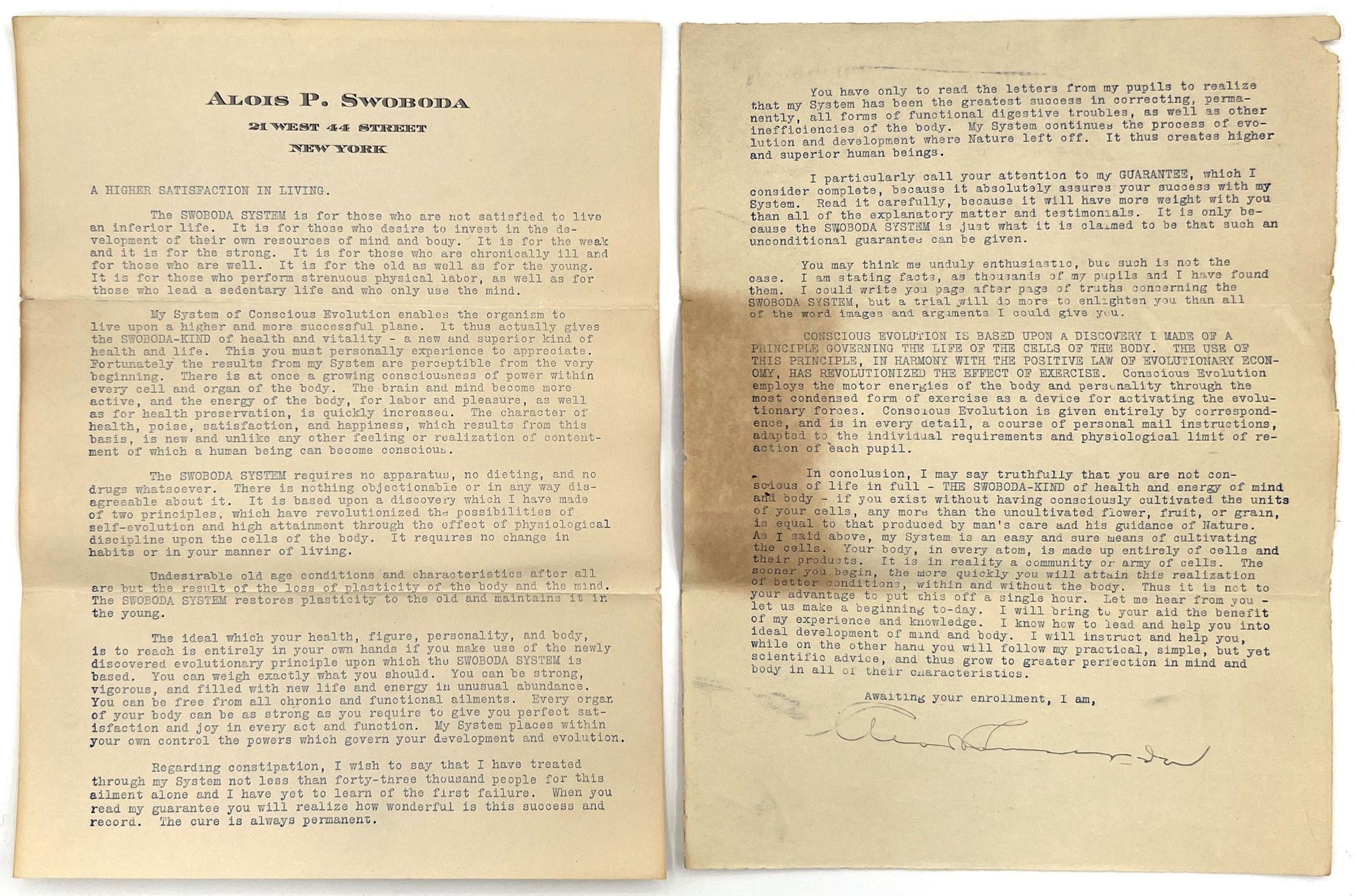 New York, New York, 1923. Very good. Toning, letter folds, a couple short tears and staining to typewritten letter.. Why take less than your full share of pleasure, happiness and success?" asks the creator of Swobodaism, or "Conscious Evolution", a mail-order scheme promising success and good health to customers. The scheme appears to be a glorified introduction to the idea of physical exercise and positive thinking for personal growth. Includes some fantastic sound bytes, such as this gem: "Your Creative Entity will give you precisely the powers that you need and desire if it is stressed organically into giving or yielding them to you." Includes three (3) printed handbills advertising the scheme, each approx. 11.5" by 8", and one two-page typewritten advertising letter (11.5" by 8.5") on letterhead signed by the creator of the scheme, Alois P. Swoboda (1873-1938).