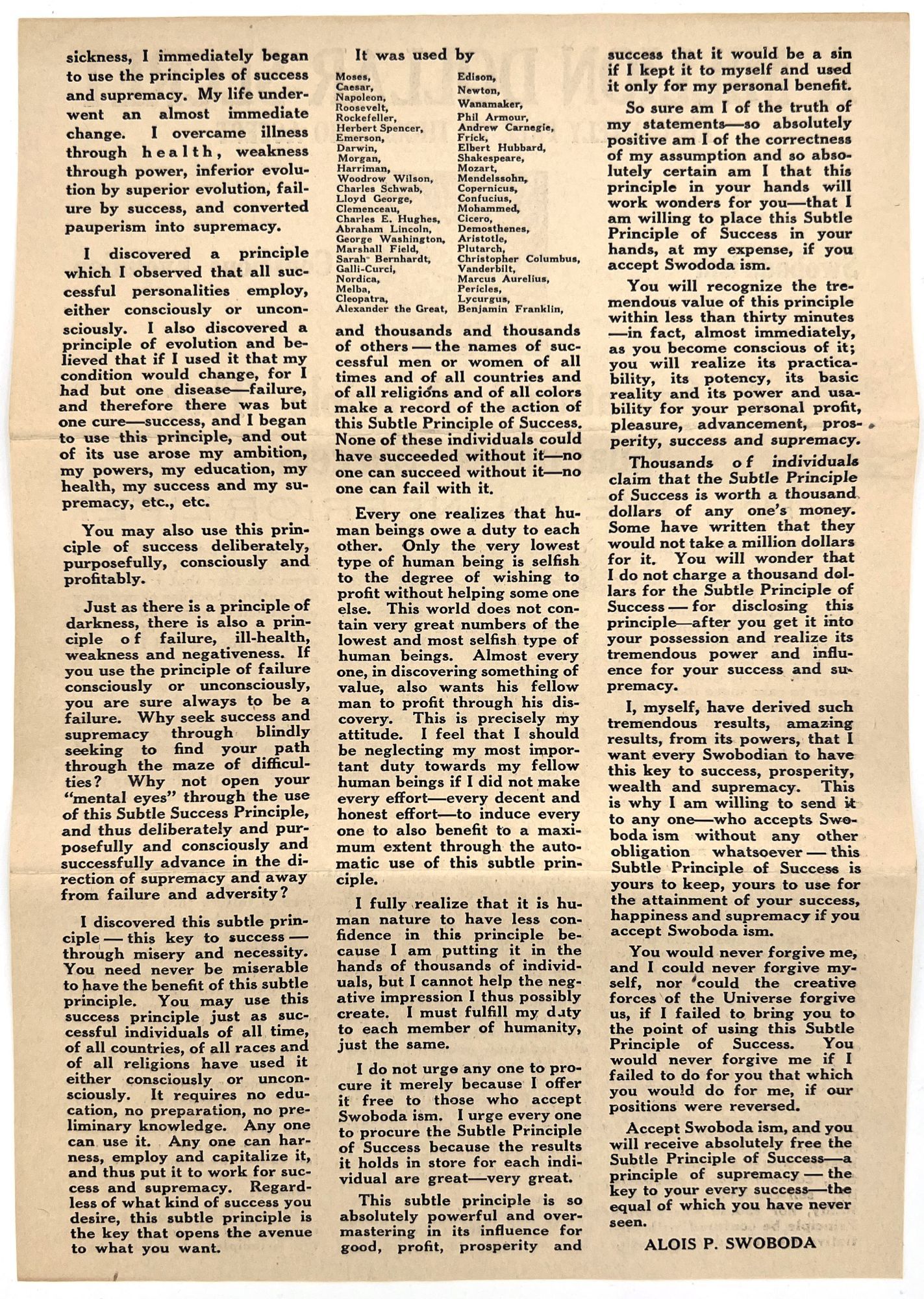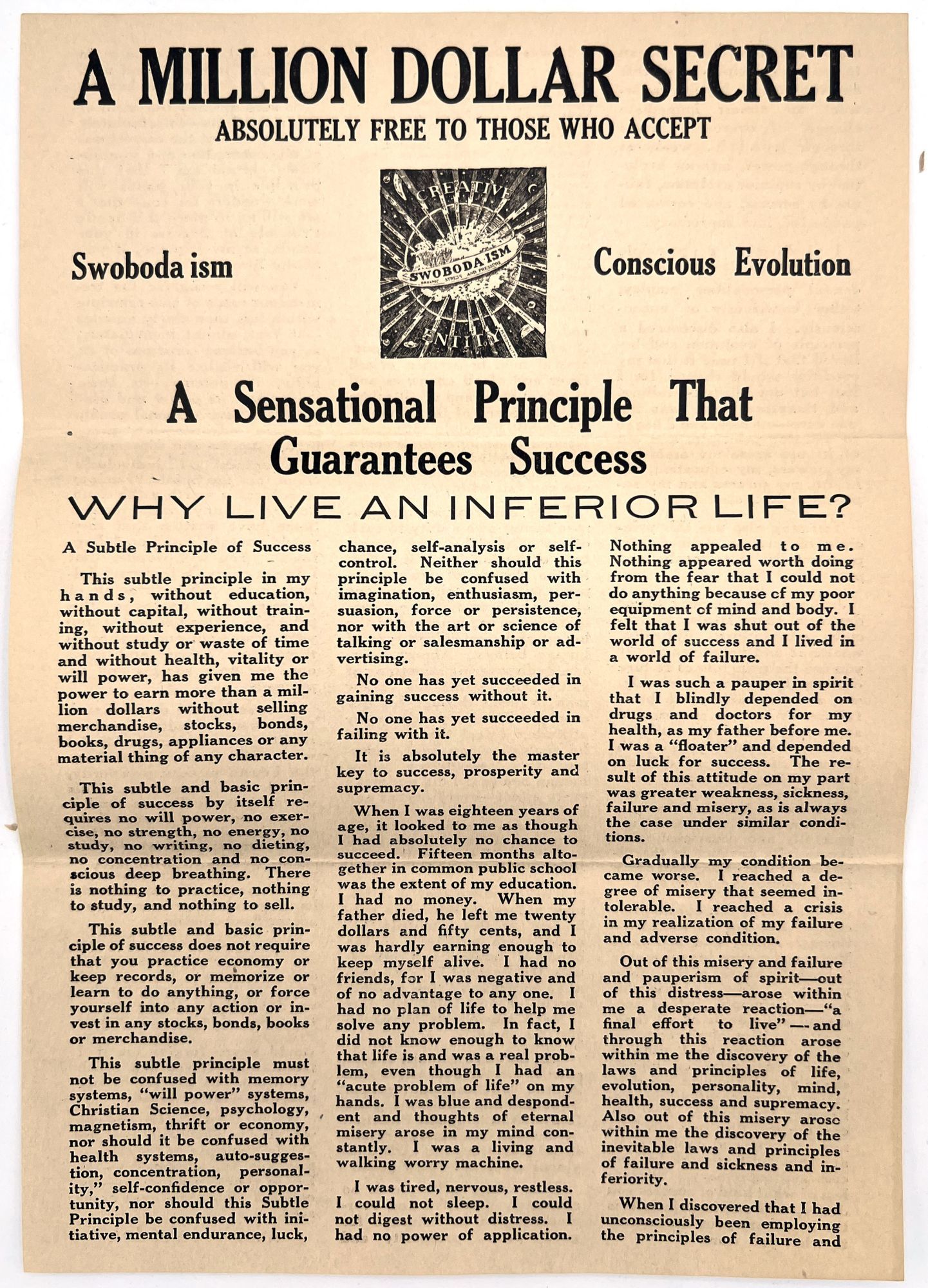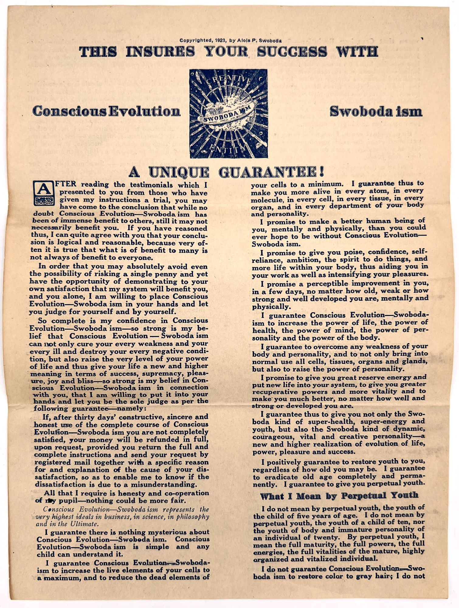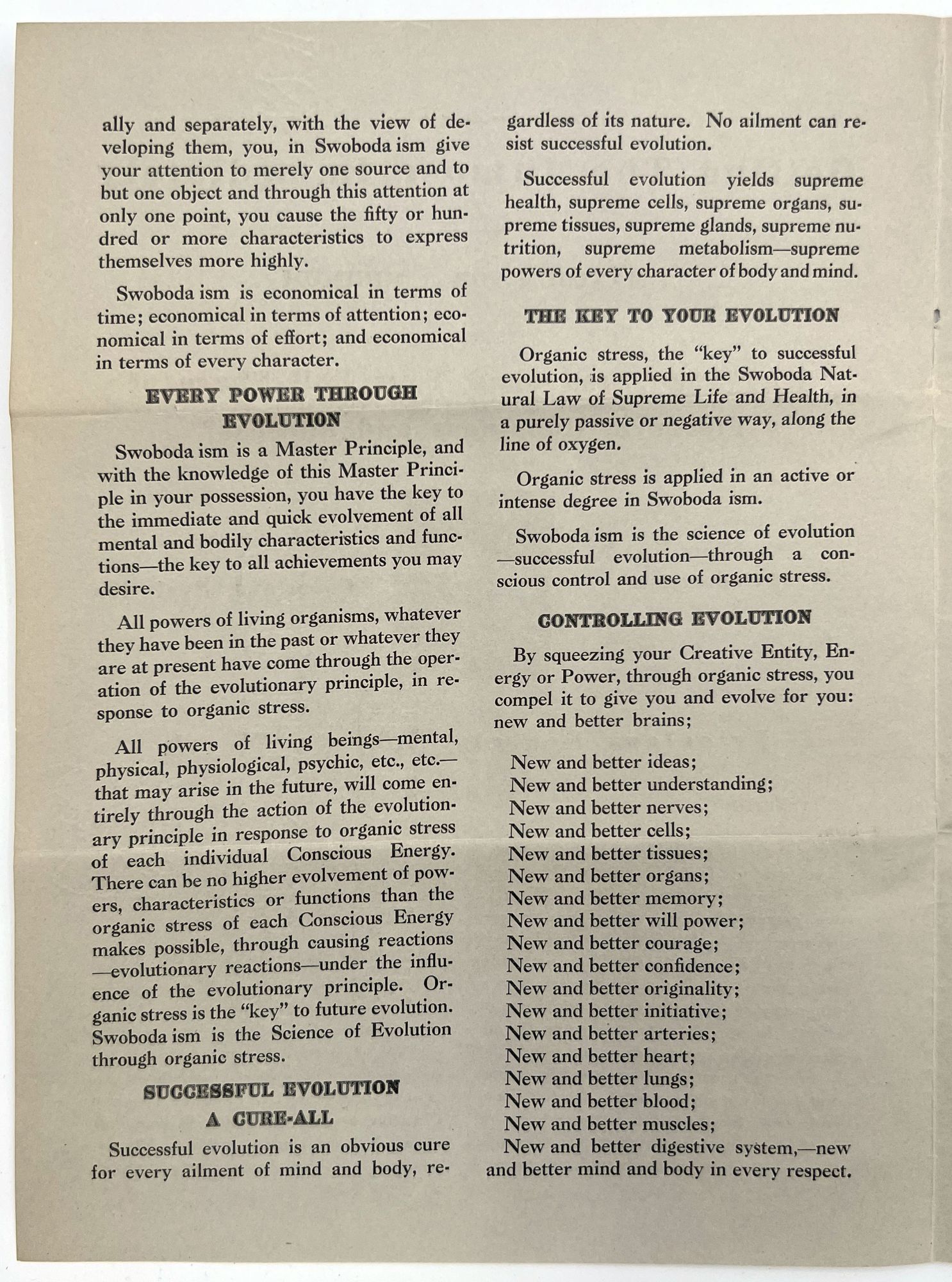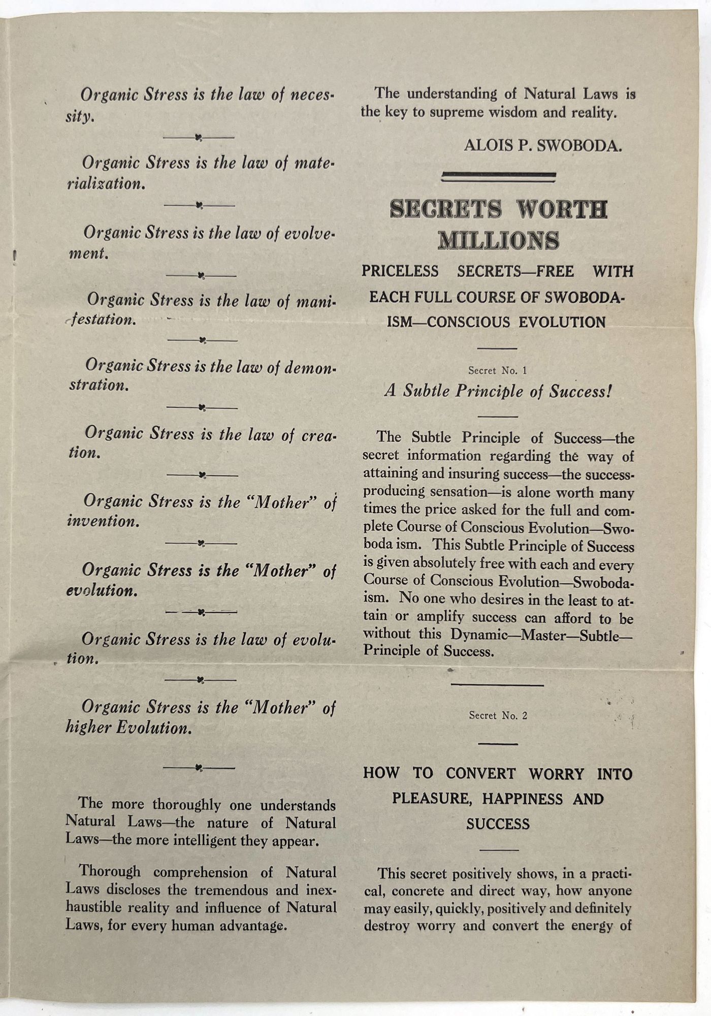 New York, New York, 1923. Very good. Toning, letter folds, a couple short tears and staining to typewritten letter.. Why take less than your full share of pleasure, happiness and success?" asks the creator of Swobodaism, or "Conscious Evolution", a mail-order scheme promising success and good health to customers. The scheme appears to be a glorified introduction to the idea of physical exercise and positive thinking for personal growth. Includes some fantastic sound bytes, such as this gem: "Your Creative Entity will give you precisely the powers that you need and desire if it is stressed organically into giving or yielding them to you." Includes three (3) printed handbills advertising the scheme, each approx. 11.5" by 8", and one two-page typewritten advertising letter (11.5" by 8.5") on letterhead signed by the creator of the scheme, Alois P. Swoboda (1873-1938).