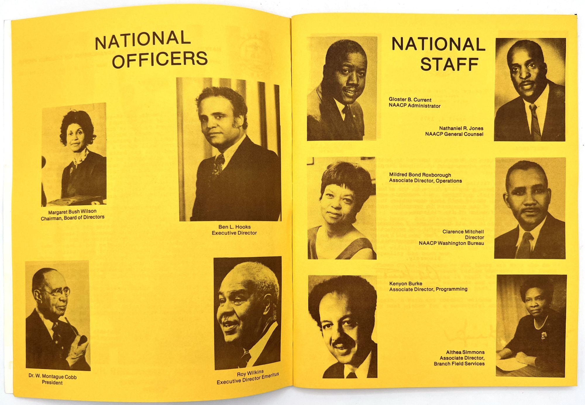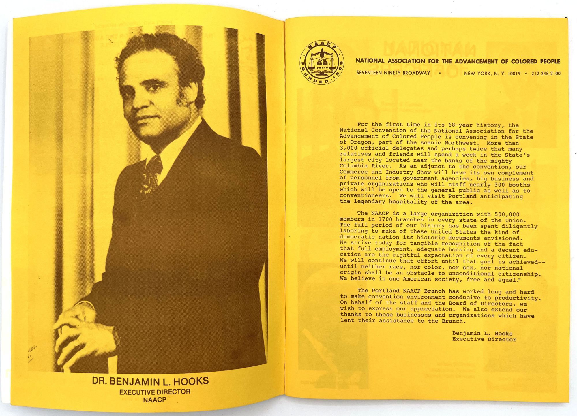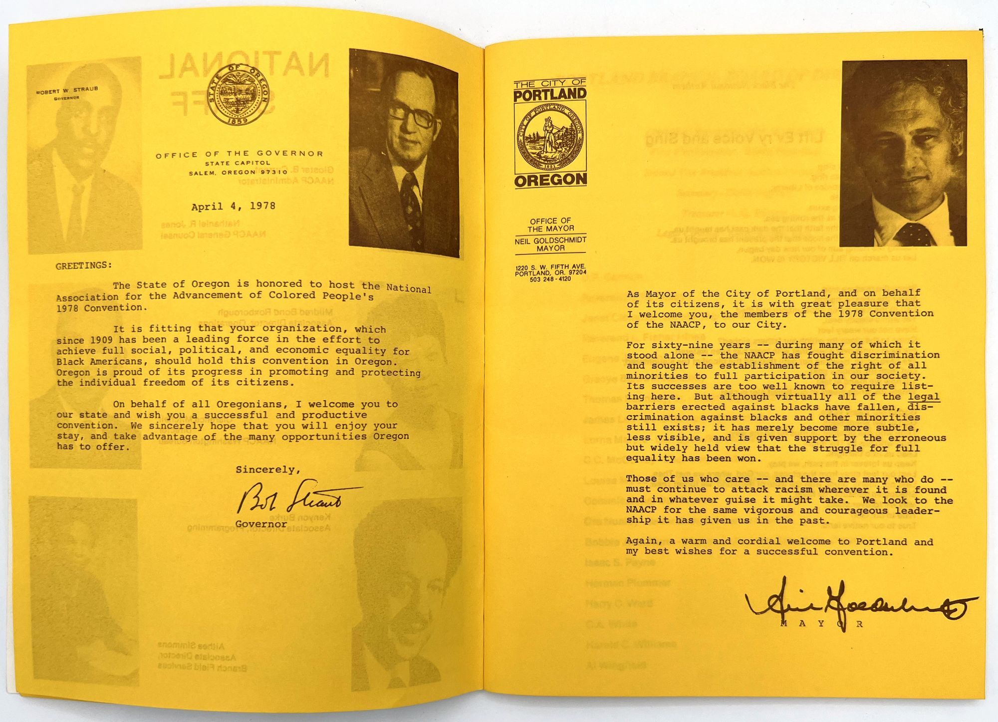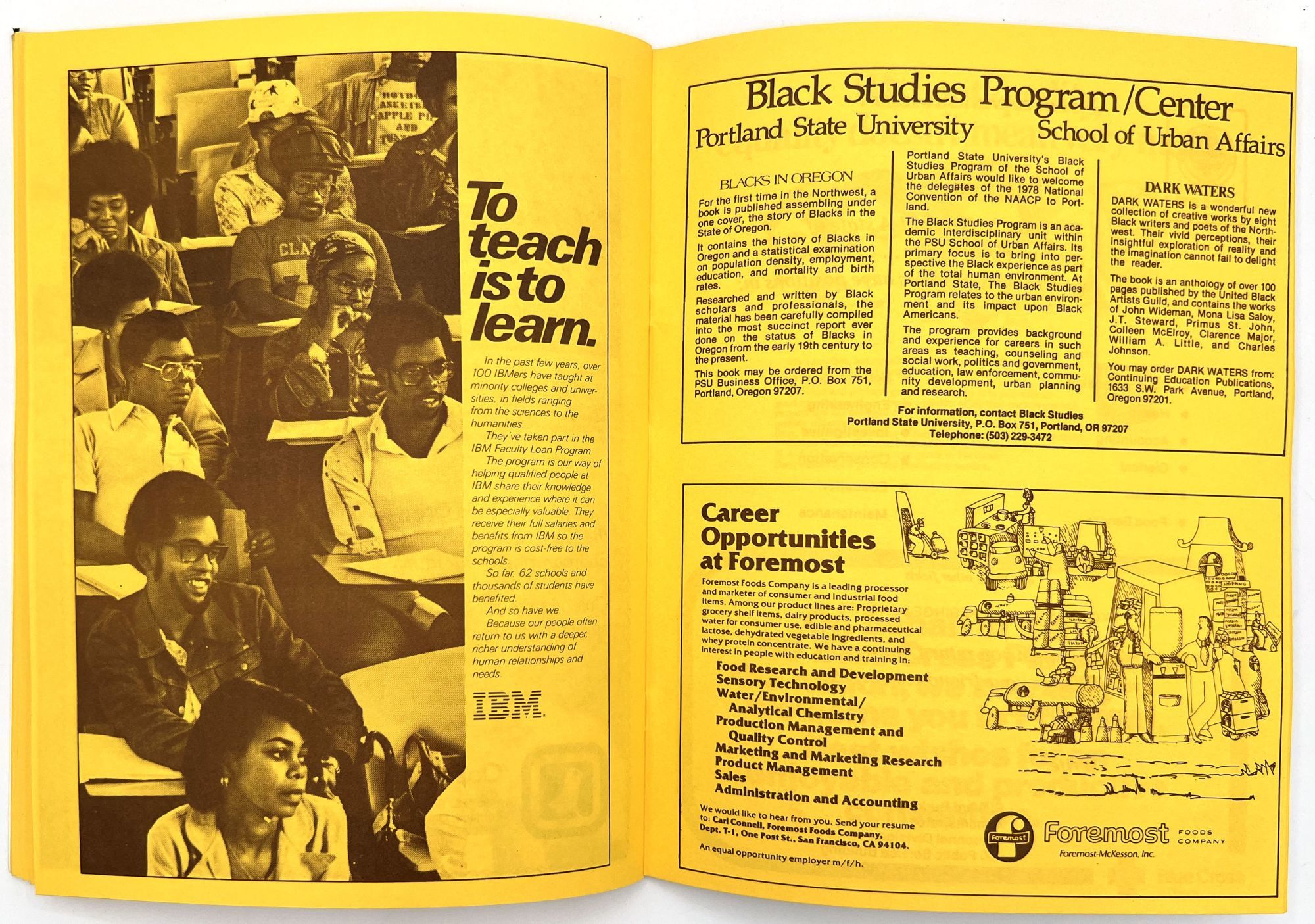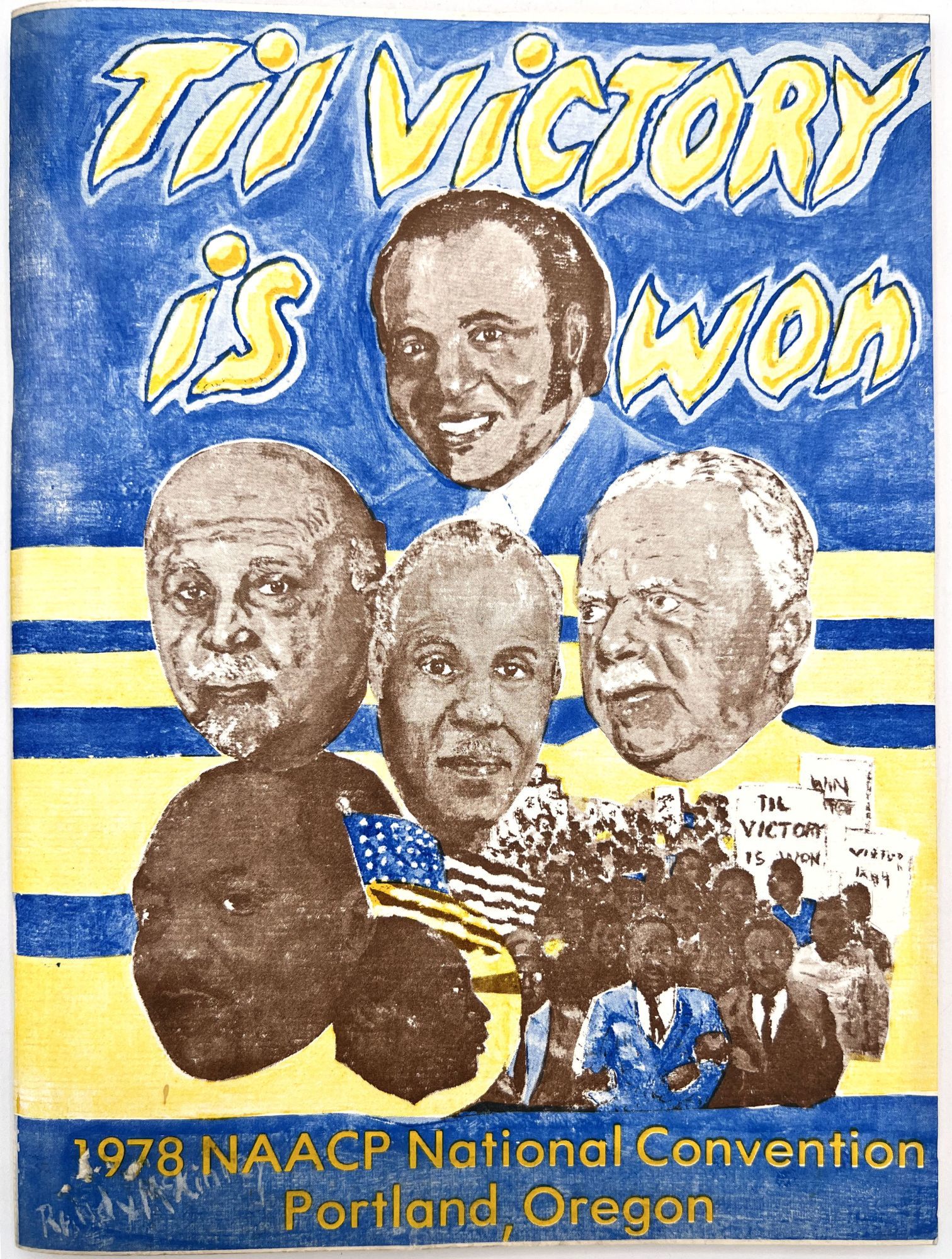 Portland, Oregon: NAACP, 1978. Near-fine.. The official booklet published for 1978 National Convention of the NAACP, hosted by its Portland branch between July 3rd and July 7th of that year. Features artwork by a local high school senior, Marcus Randy McKinley, utilizing the organization's colors of blue and gold. Includes letters from the Portland branch President, the Governor, and Mayor, as well as lists of important NAACP staff and board members. Key features of the booklet include: the lyrics to "Lift Ev'ry Voice and Sing"; photos of staff and planning committee members; a brief history of the NAACP; the convention schedule; a list of patrons; and several pages of advertisements in the rear. Note the advertisements, such as one by IBM, market products toward the Black community specifically.