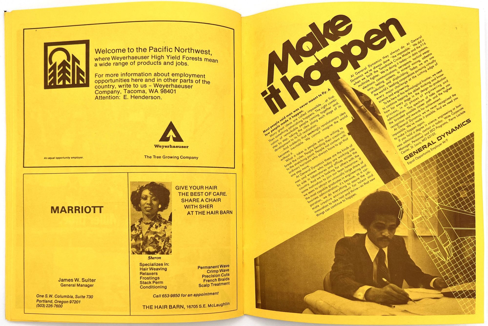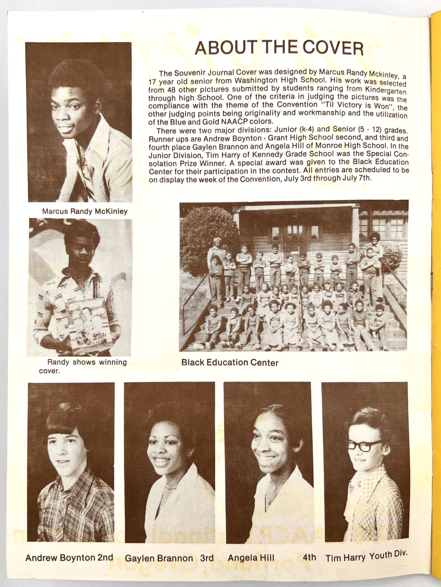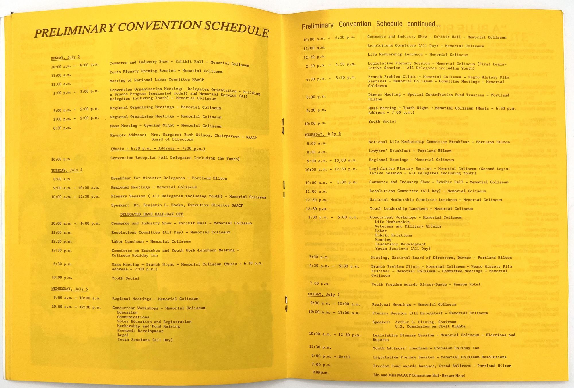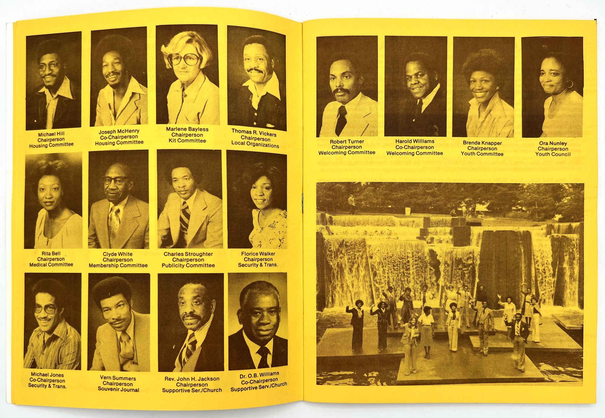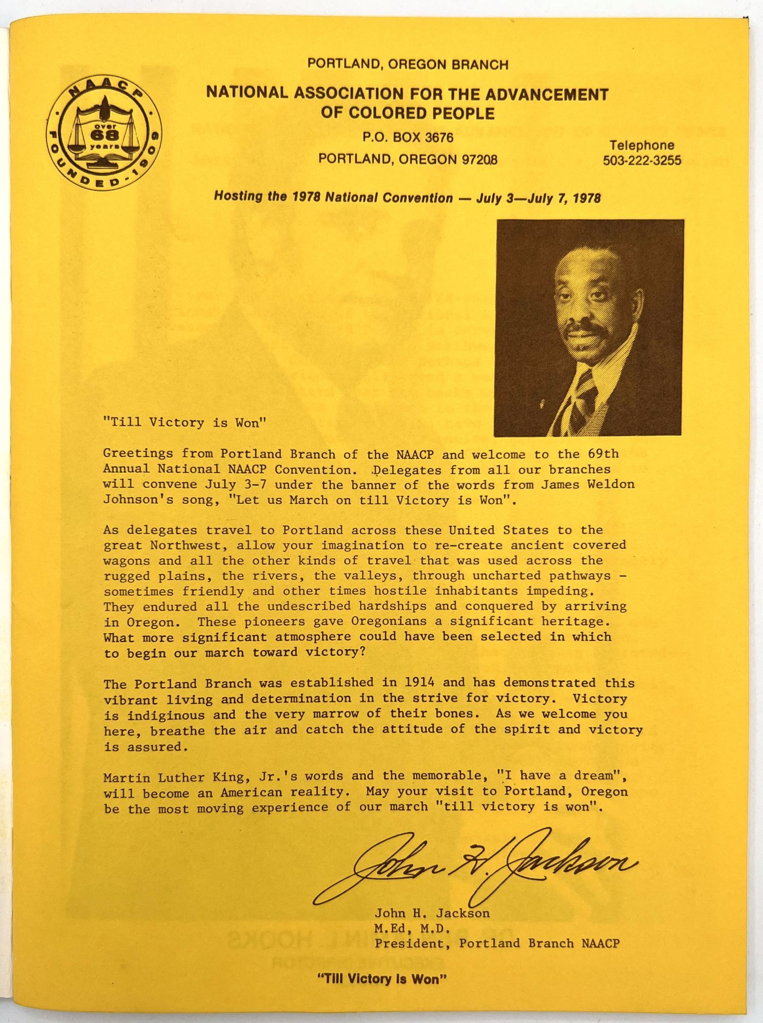 Portland, Oregon: NAACP, 1978. Near-fine.. The official booklet published for 1978 National Convention of the NAACP, hosted by its Portland branch between July 3rd and July 7th of that year. Features artwork by a local high school senior, Marcus Randy McKinley, utilizing the organization's colors of blue and gold. Includes letters from the Portland branch President, the Governor, and Mayor, as well as lists of important NAACP staff and board members. Key features of the booklet include: the lyrics to "Lift Ev'ry Voice and Sing"; photos of staff and planning committee members; a brief history of the NAACP; the convention schedule; a list of patrons; and several pages of advertisements in the rear. Note the advertisements, such as one by IBM, market products toward the Black community specifically.