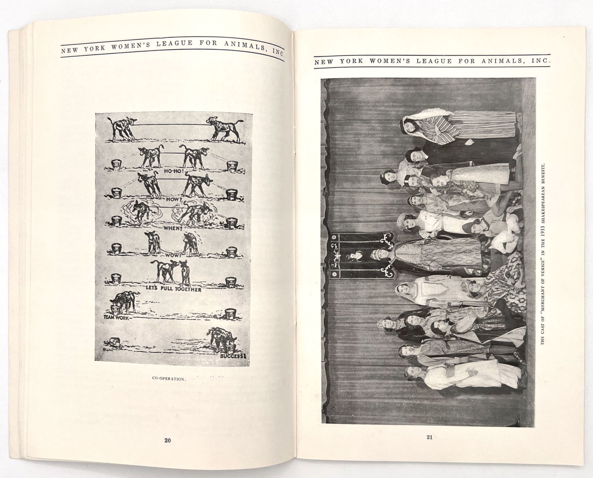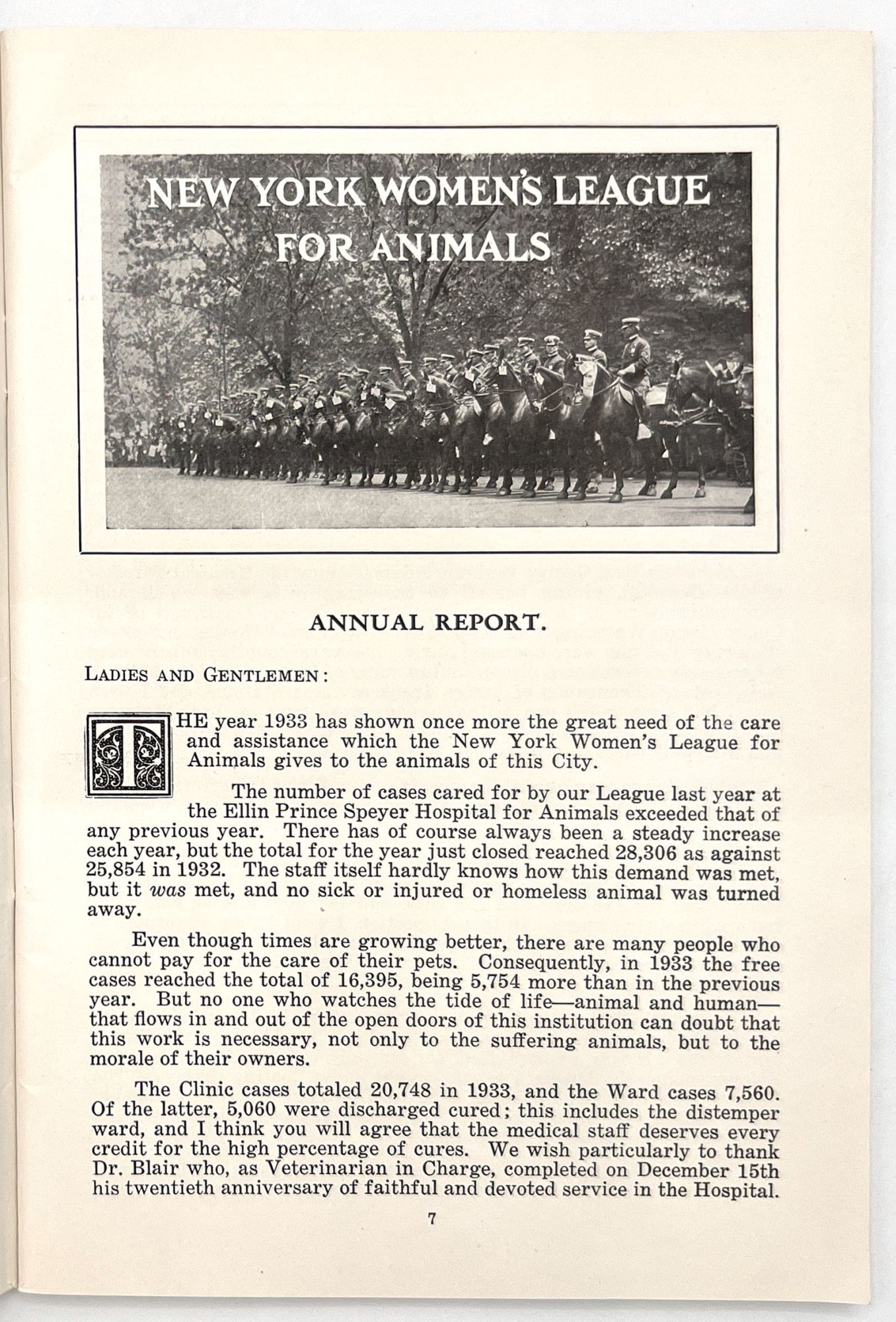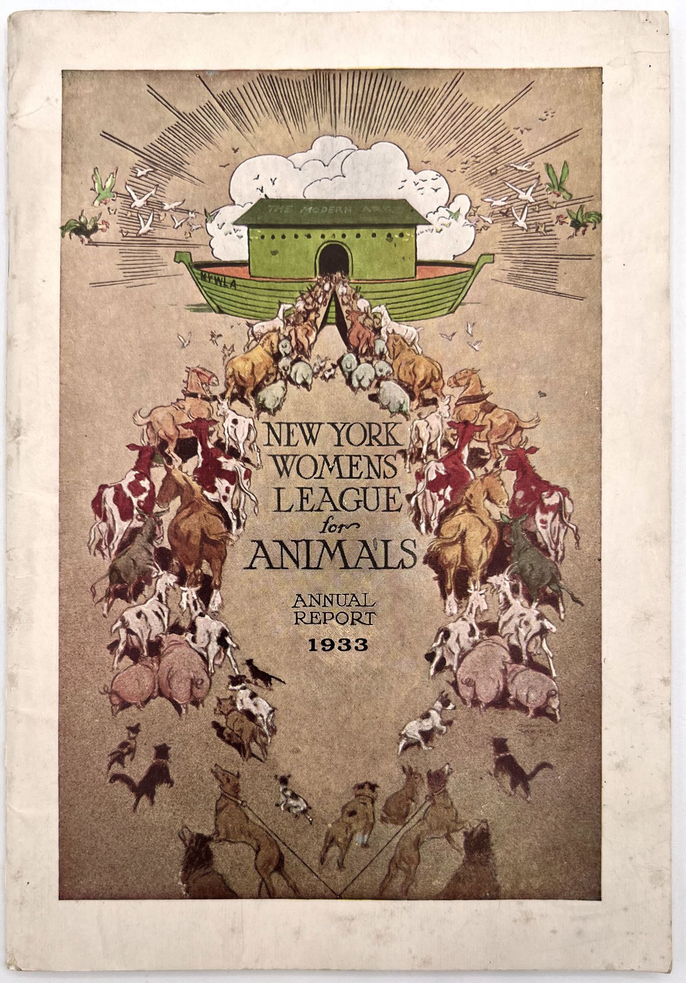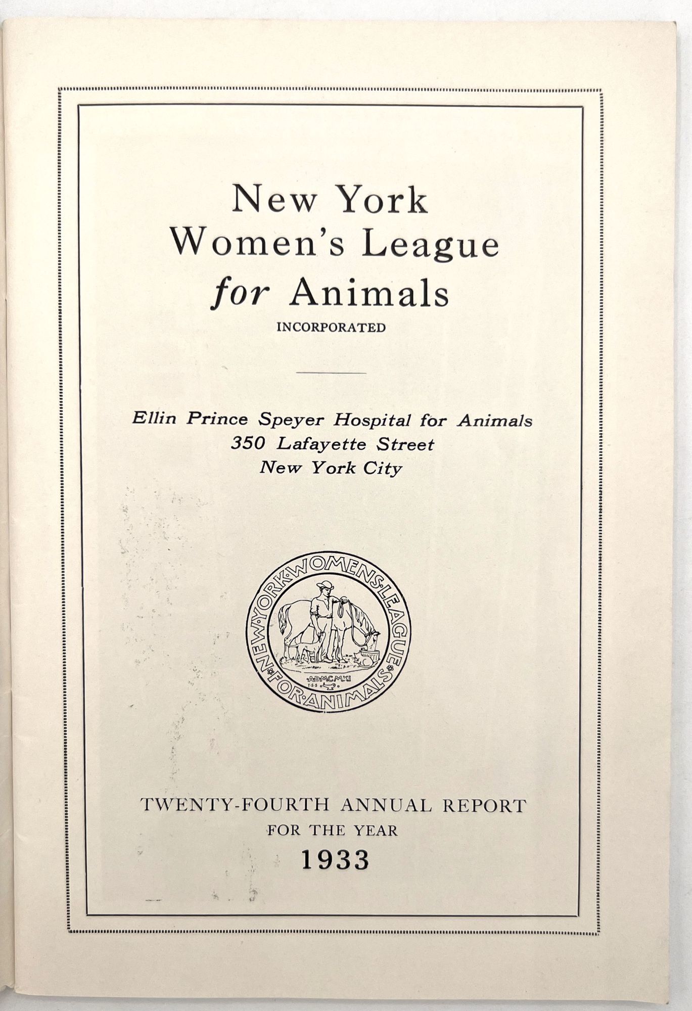 New York, New York: New York Women's League for Animals, Inc, 1933. Very good. Minor dust soiling.. The 1933 annual report for the New York Women's League for Animals, an animal welfare organization founded and run by women founded in 1910 by Mrs. Ellin Prince Speyer. Includes a full listing of officers and committee members, including the veterinarians employed by the Ellin Prince Speyer Hospital for Animals. Also includes officers' reports, a table of cases and operations performed, fiscal reports, a list of donors and subscribing members (including some in the "dogs' brigade" or "cats' brigade". Notable for the sheer number of donors and subscribers, which spans many pages, some offering donations "in memory of" pets such as "Wuzzie" or "Pussy Purr-Mew" (p. 63). Illustrated with photos of pets and the hospital throughout. Illustration on upper wrapper depicts Noah's Ark.