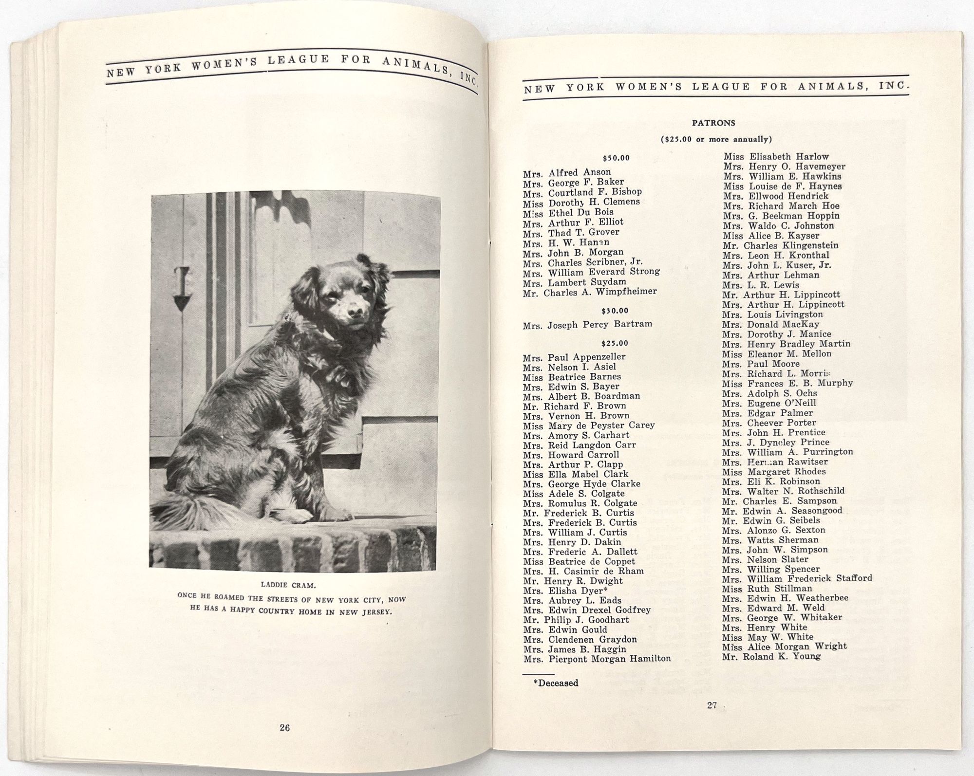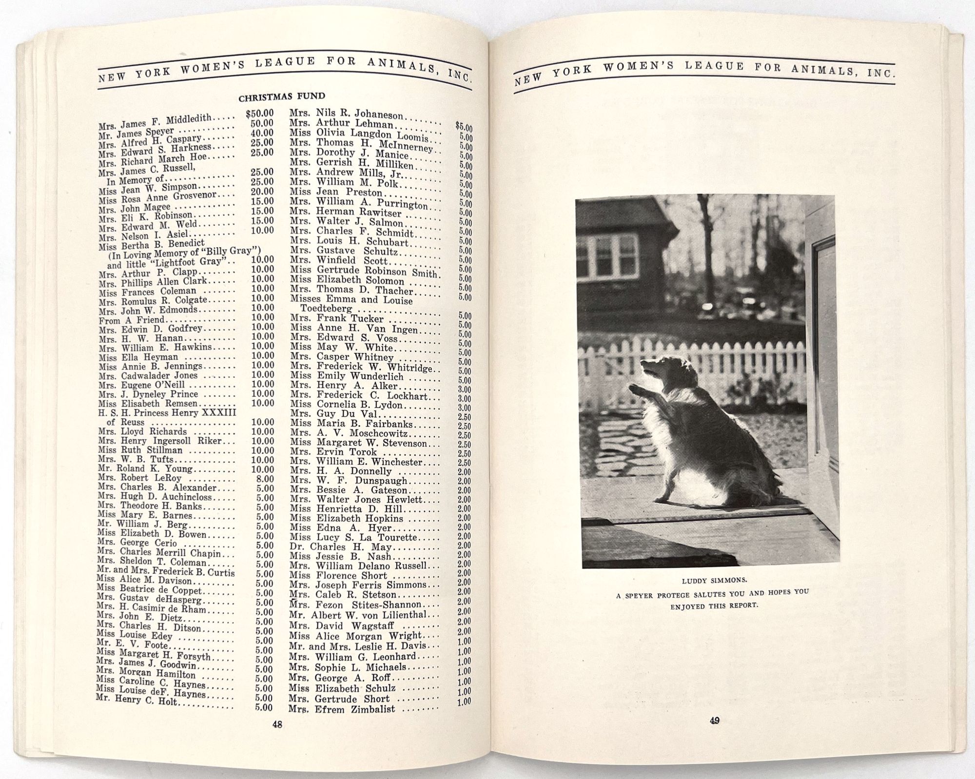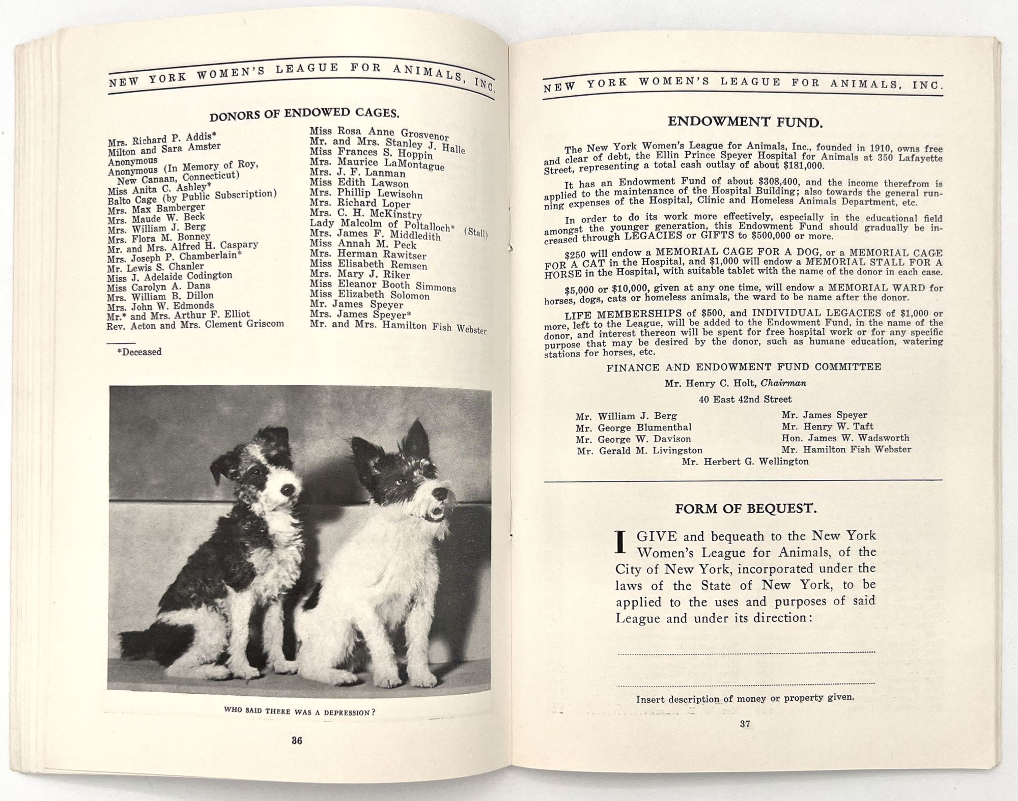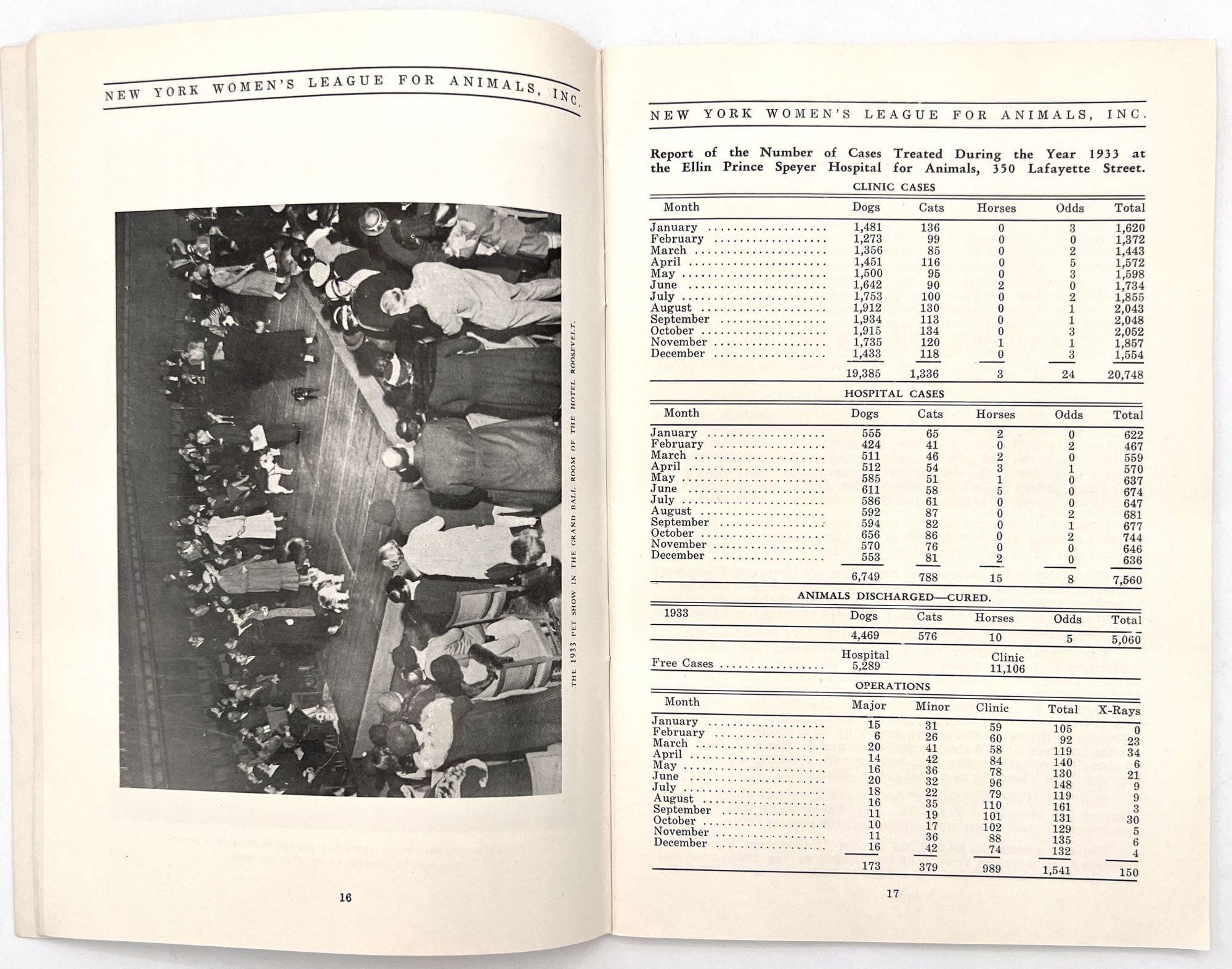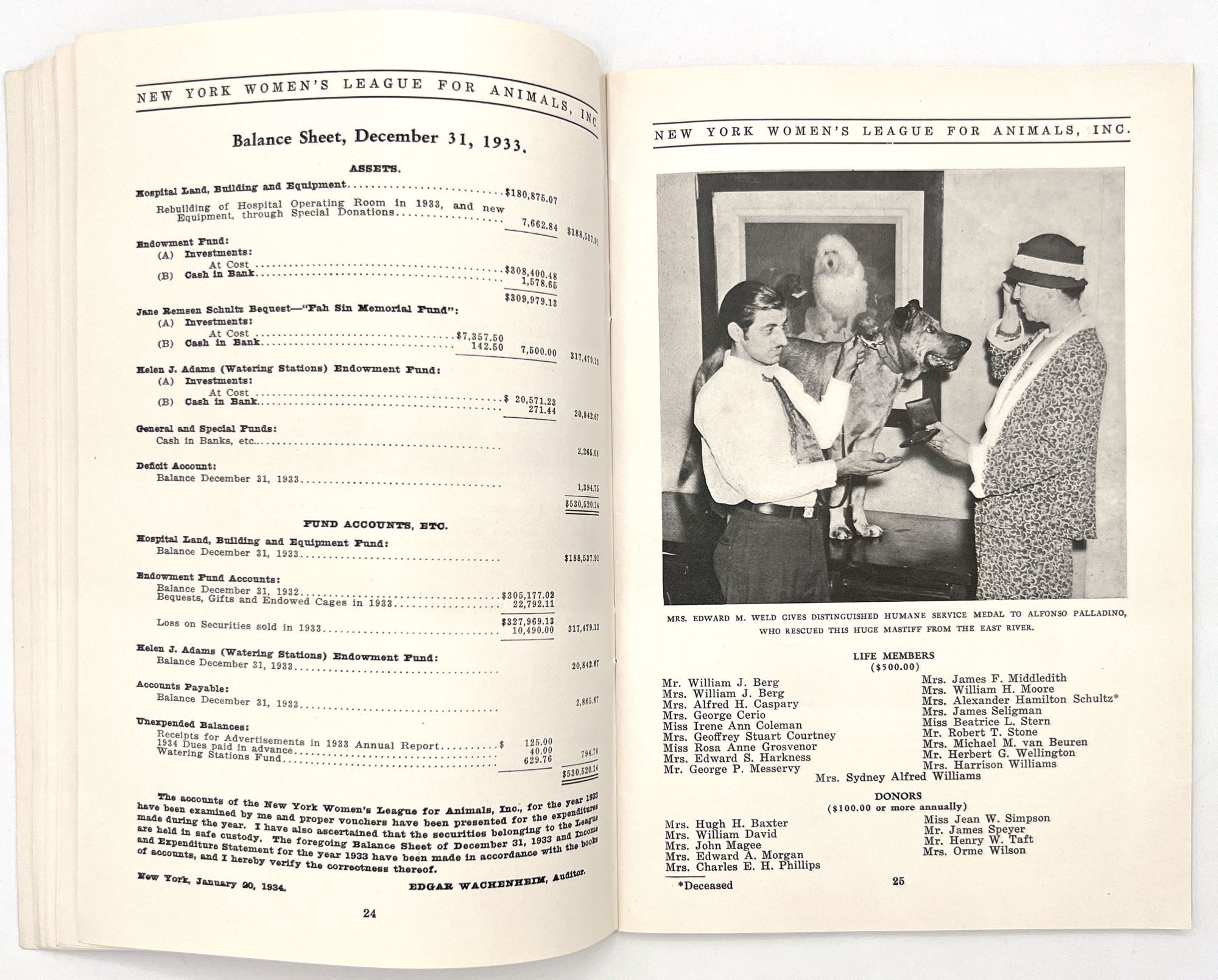 New York, New York: New York Women's League for Animals, Inc, 1933. Very good. Minor dust soiling.. The 1933 annual report for the New York Women's League for Animals, an animal welfare organization founded and run by women founded in 1910 by Mrs. Ellin Prince Speyer. Includes a full listing of officers and committee members, including the veterinarians employed by the Ellin Prince Speyer Hospital for Animals. Also includes officers' reports, a table of cases and operations performed, fiscal reports, a list of donors and subscribing members (including some in the "dogs' brigade" or "cats' brigade". Notable for the sheer number of donors and subscribers, which spans many pages, some offering donations "in memory of" pets such as "Wuzzie" or "Pussy Purr-Mew" (p. 63). Illustrated with photos of pets and the hospital throughout. Illustration on upper wrapper depicts Noah's Ark.