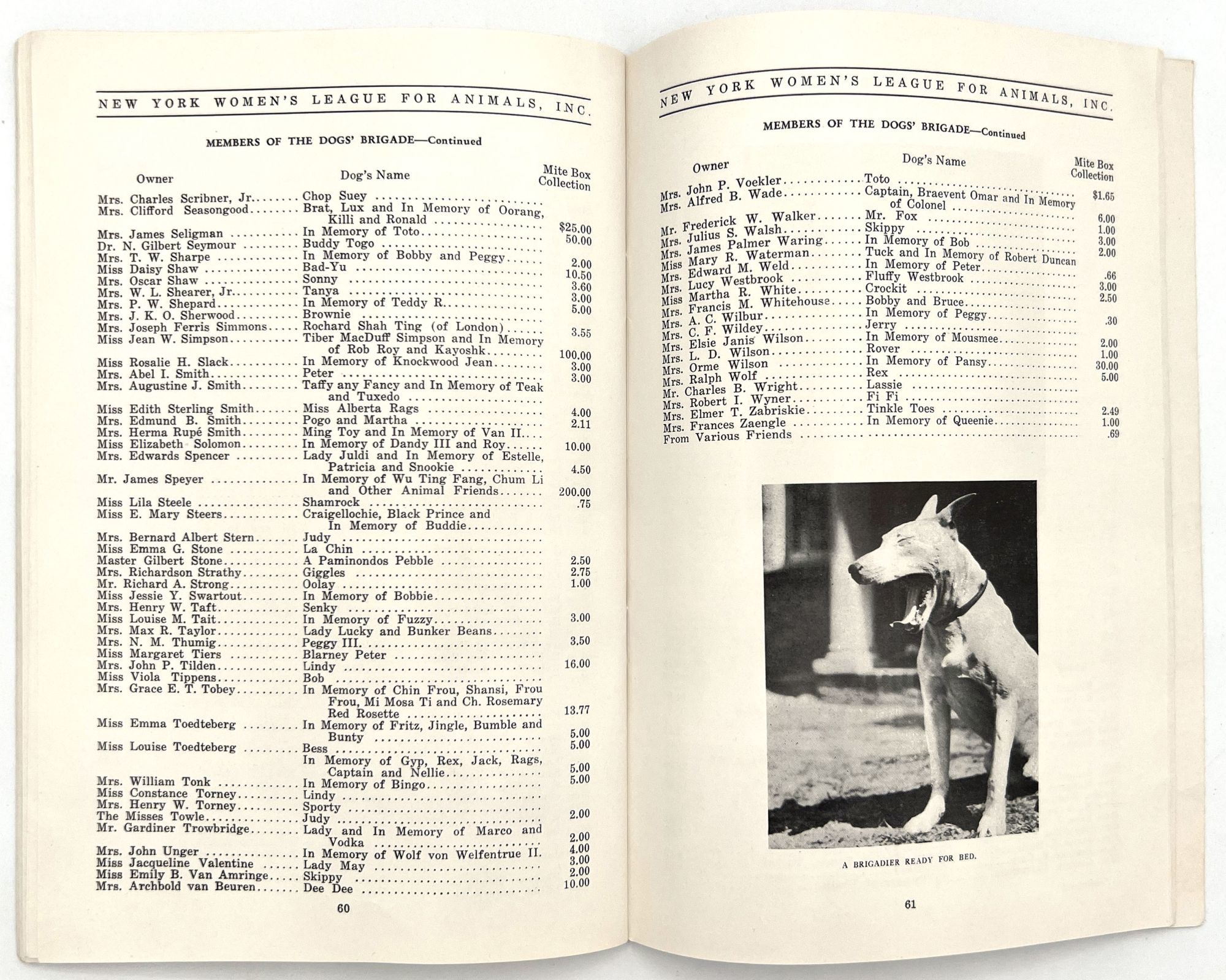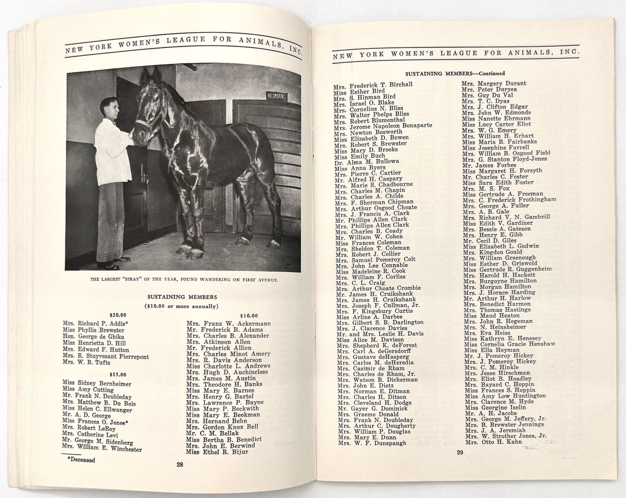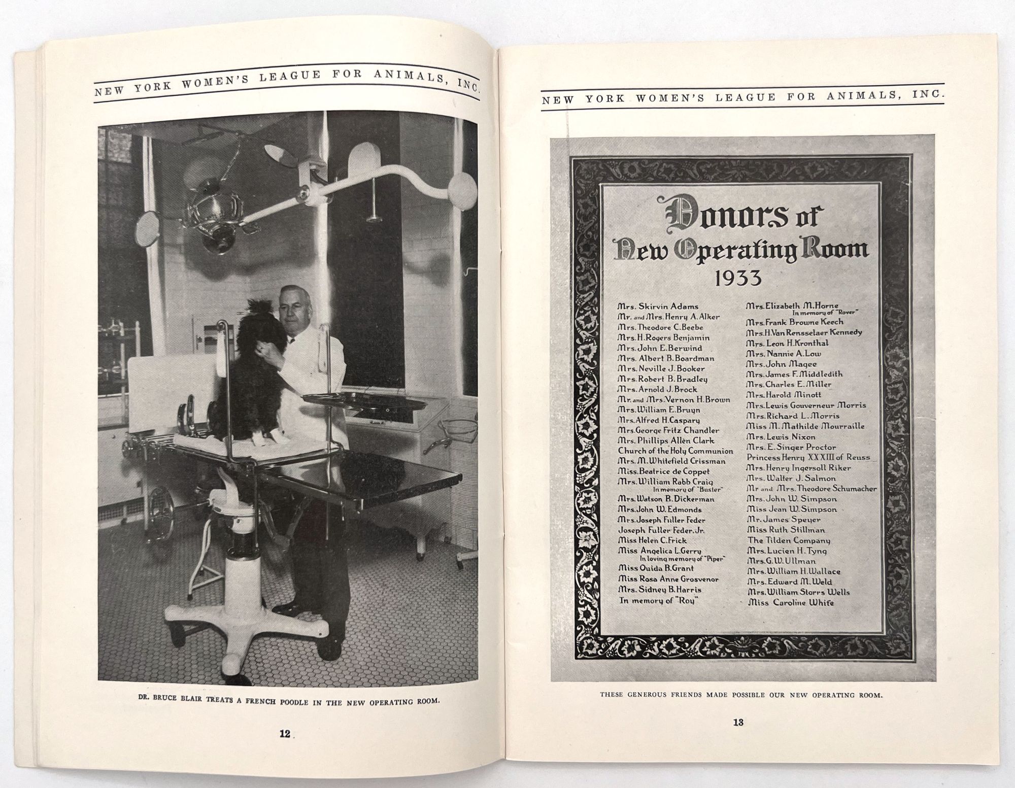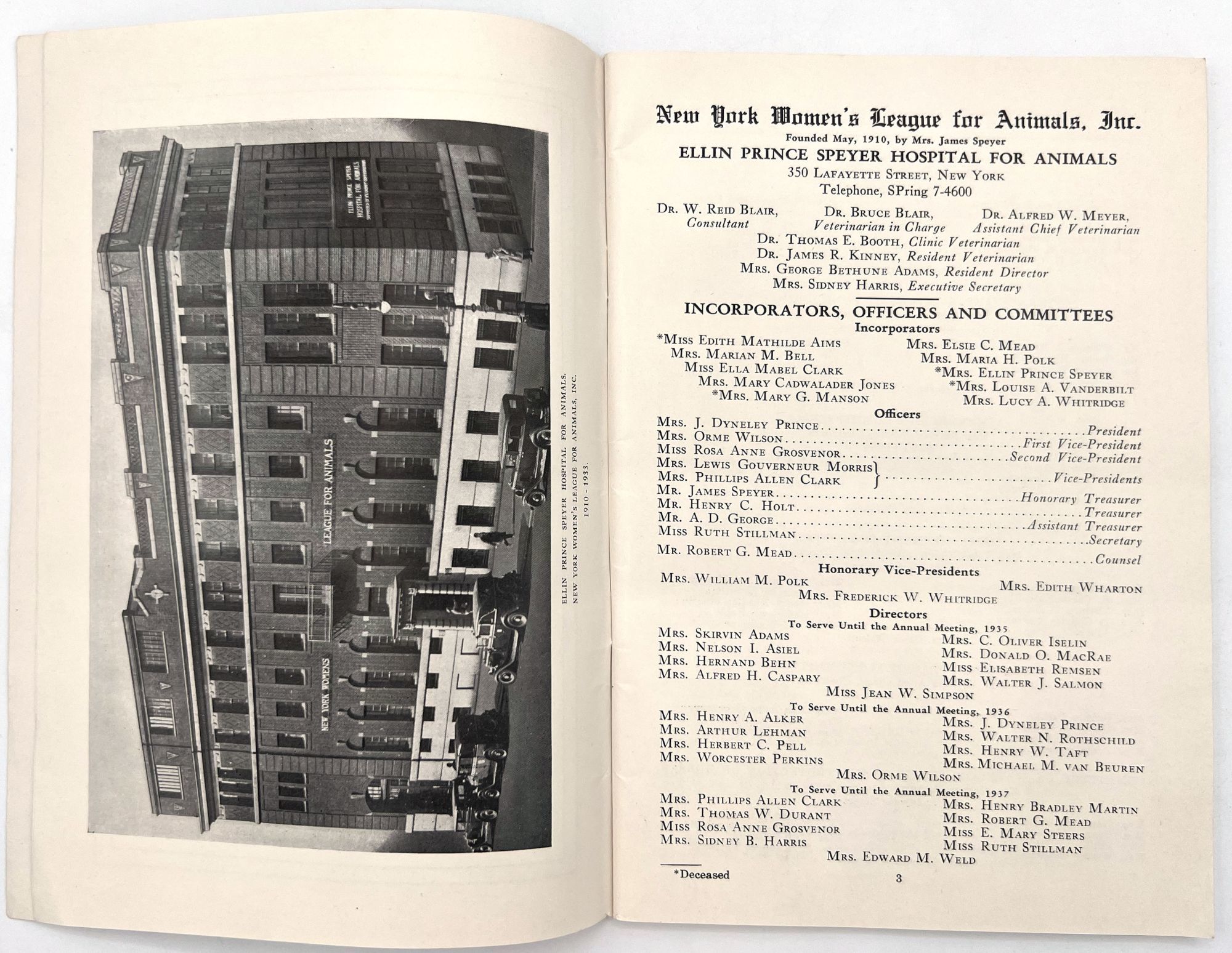 New York, New York: New York Women's League for Animals, Inc, 1933. Very good. Minor dust soiling.. The 1933 annual report for the New York Women's League for Animals, an animal welfare organization founded and run by women founded in 1910 by Mrs. Ellin Prince Speyer. Includes a full listing of officers and committee members, including the veterinarians employed by the Ellin Prince Speyer Hospital for Animals. Also includes officers' reports, a table of cases and operations performed, fiscal reports, a list of donors and subscribing members (including some in the "dogs' brigade" or "cats' brigade". Notable for the sheer number of donors and subscribers, which spans many pages, some offering donations "in memory of" pets such as "Wuzzie" or "Pussy Purr-Mew" (p. 63). Illustrated with photos of pets and the hospital throughout. Illustration on upper wrapper depicts Noah's Ark.