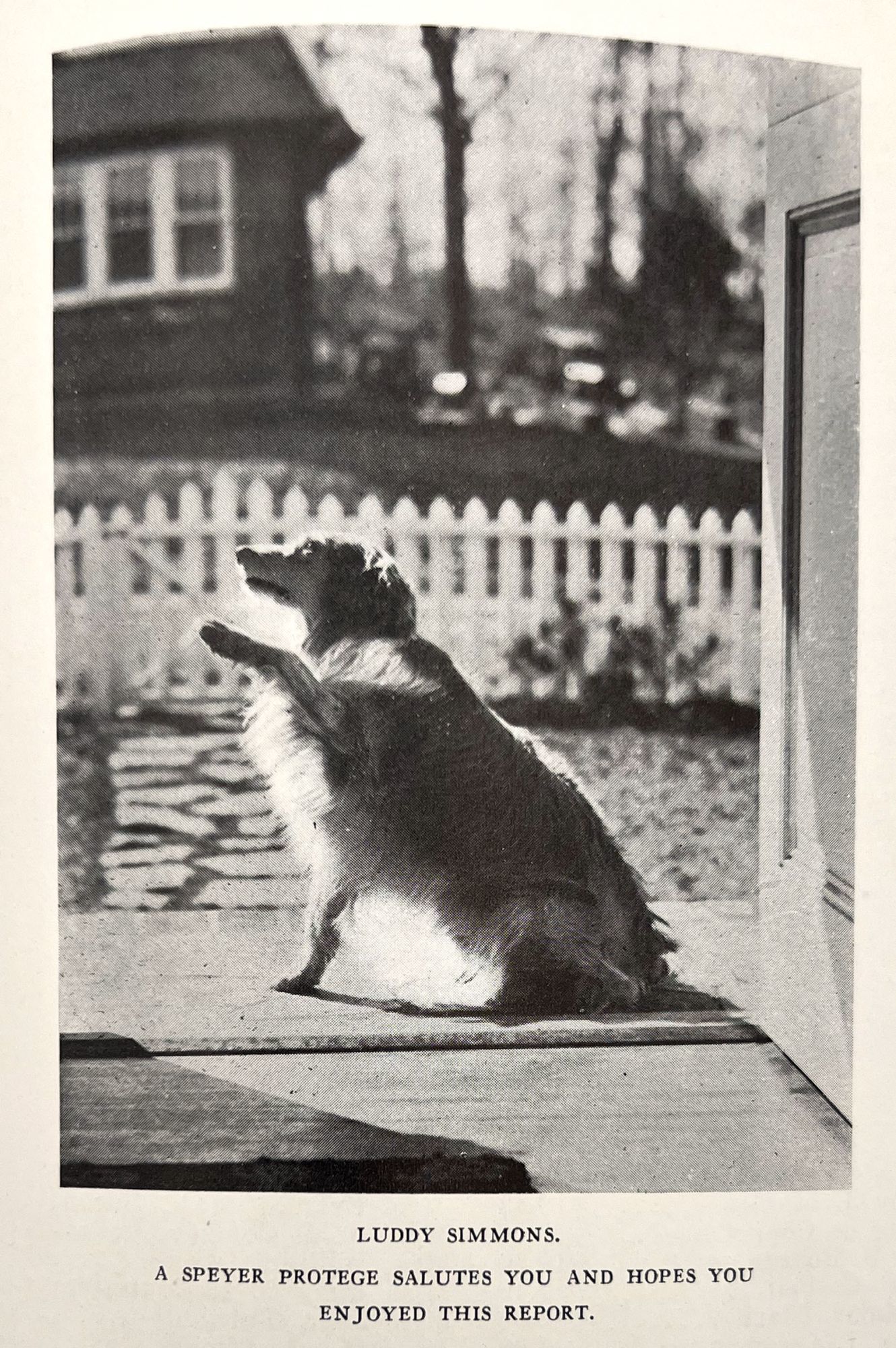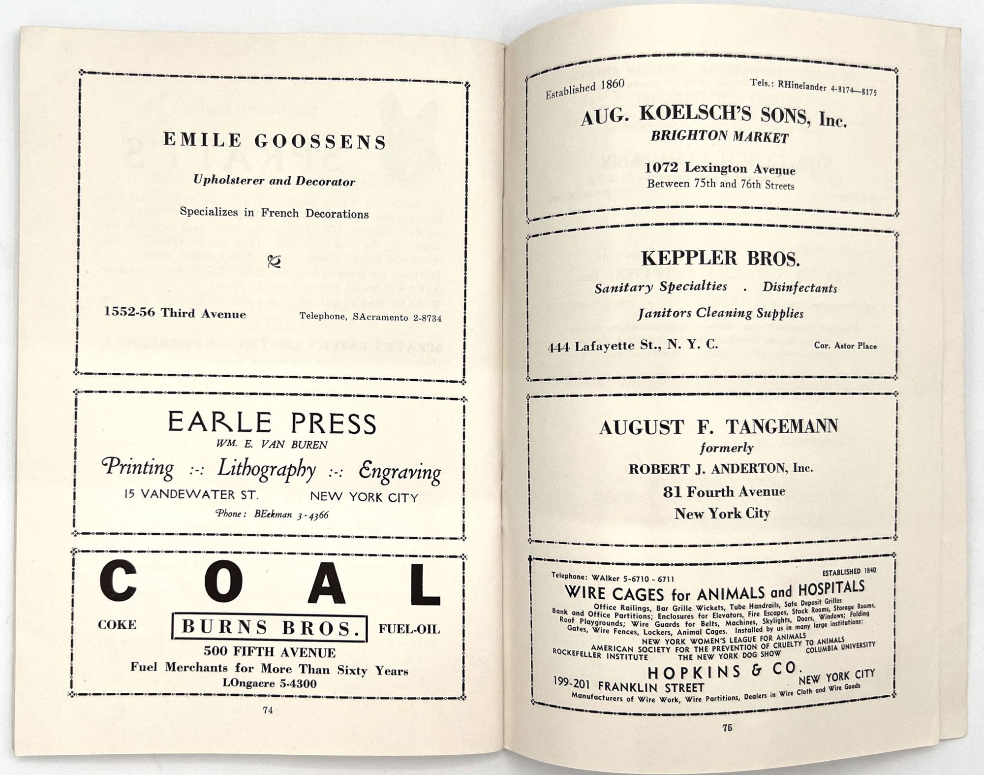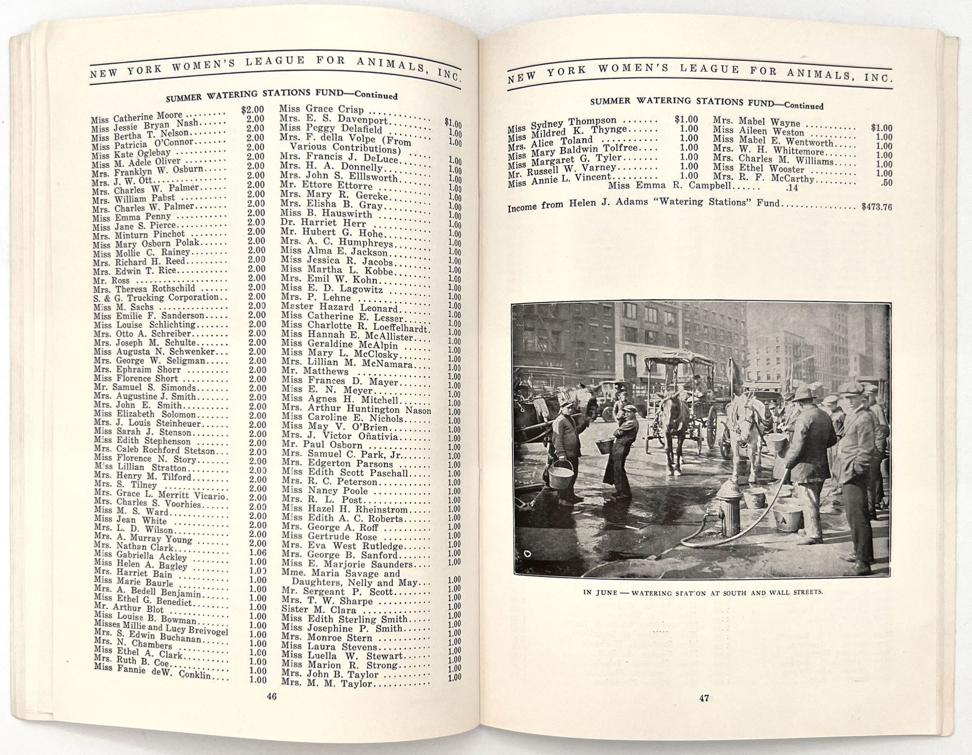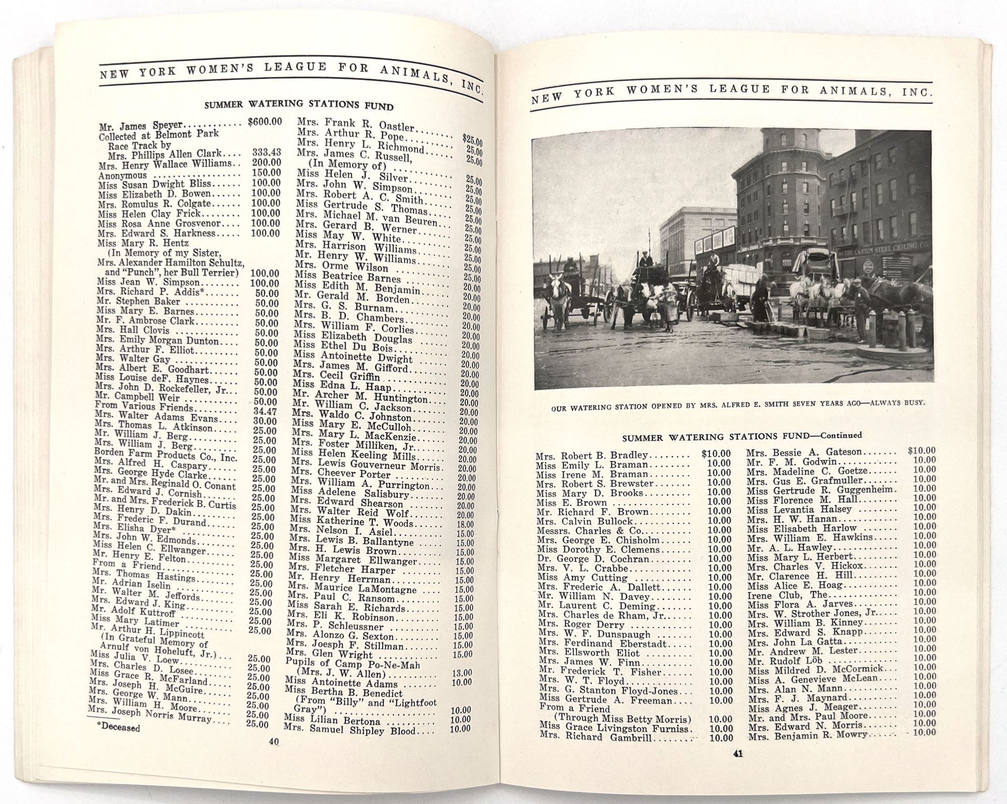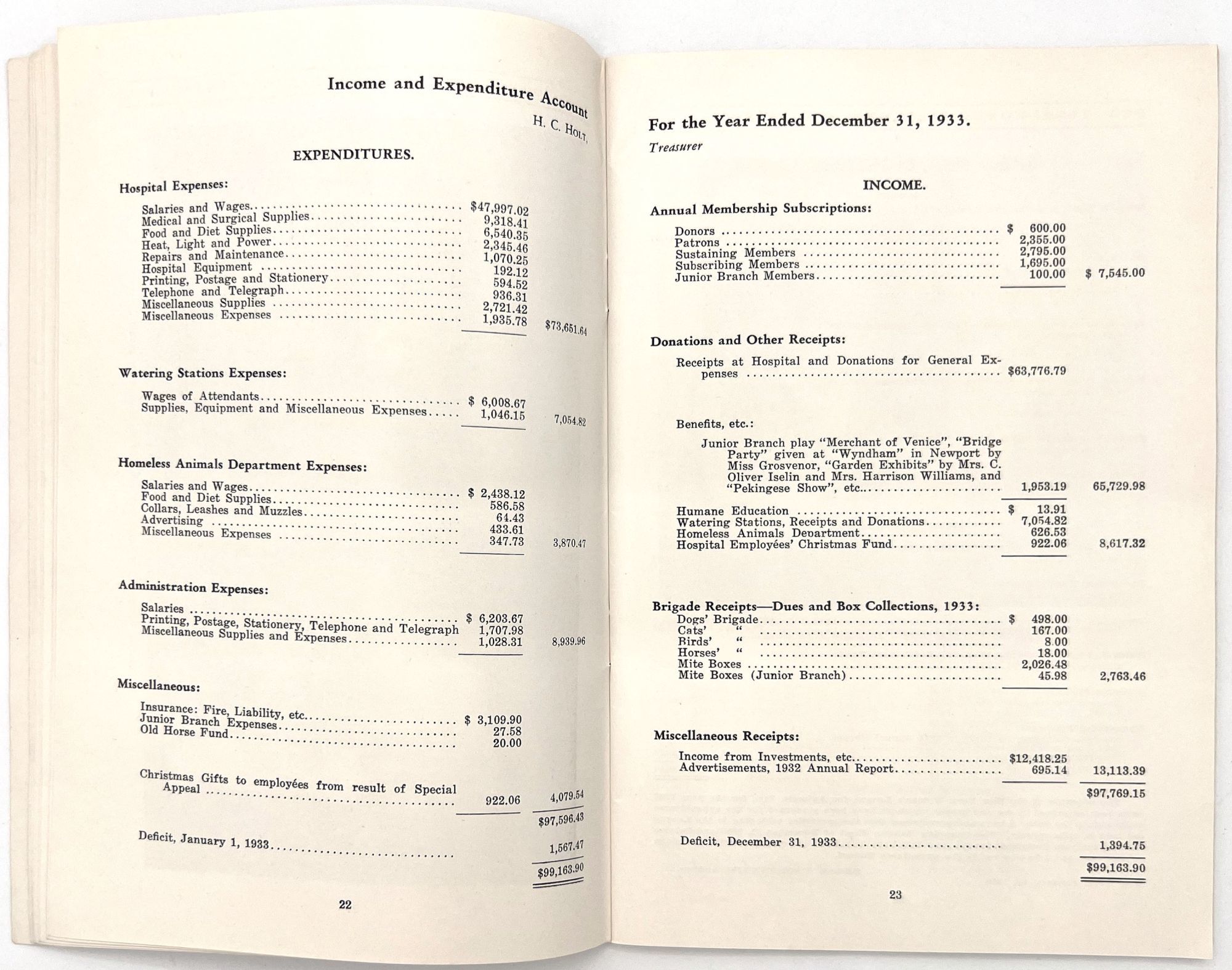 New York, New York: New York Women's League for Animals, Inc, 1933. Very good. Minor dust soiling.. The 1933 annual report for the New York Women's League for Animals, an animal welfare organization founded and run by women founded in 1910 by Mrs. Ellin Prince Speyer. Includes a full listing of officers and committee members, including the veterinarians employed by the Ellin Prince Speyer Hospital for Animals. Also includes officers' reports, a table of cases and operations performed, fiscal reports, a list of donors and subscribing members (including some in the "dogs' brigade" or "cats' brigade". Notable for the sheer number of donors and subscribers, which spans many pages, some offering donations "in memory of" pets such as "Wuzzie" or "Pussy Purr-Mew" (p. 63). Illustrated with photos of pets and the hospital throughout. Illustration on upper wrapper depicts Noah's Ark.