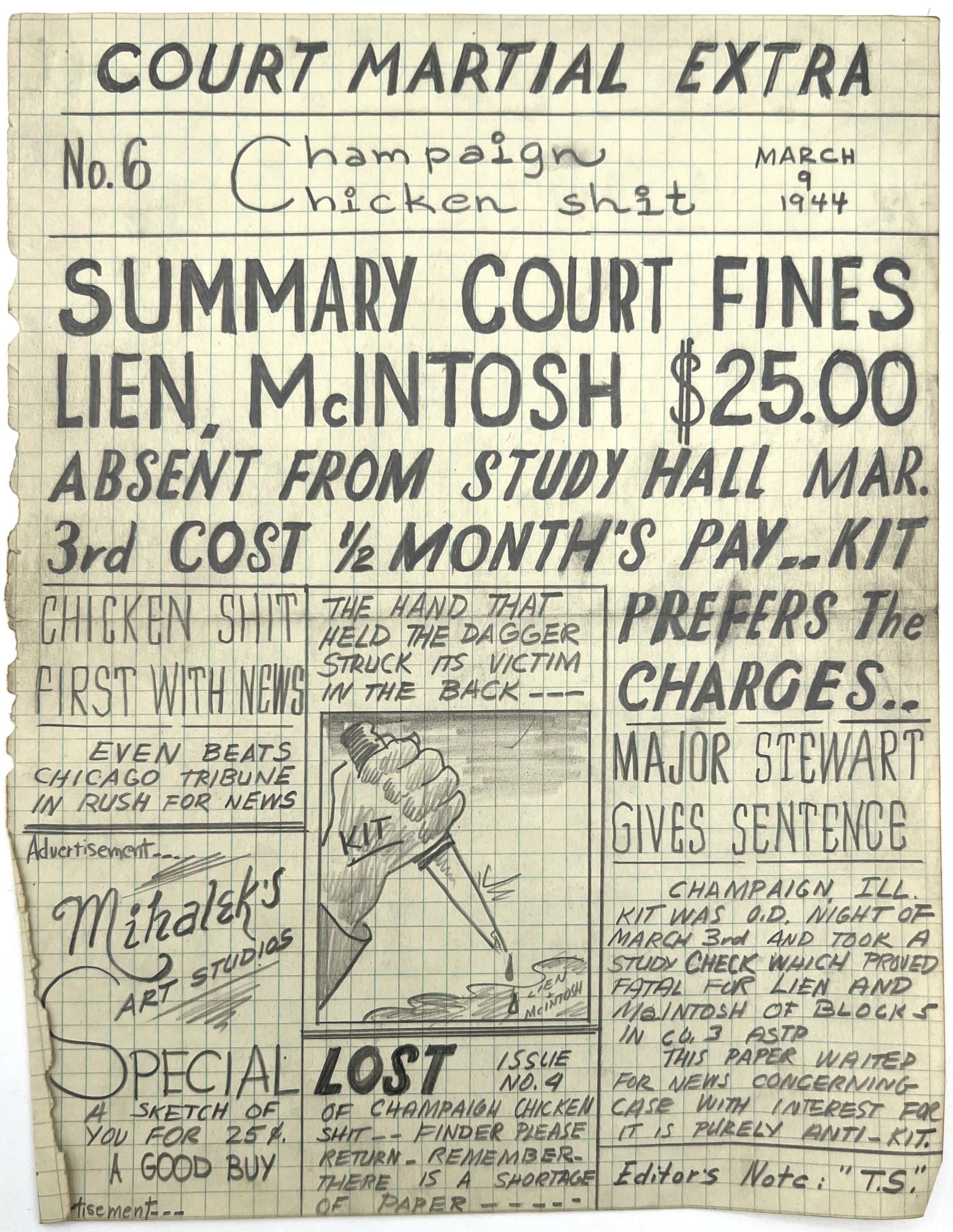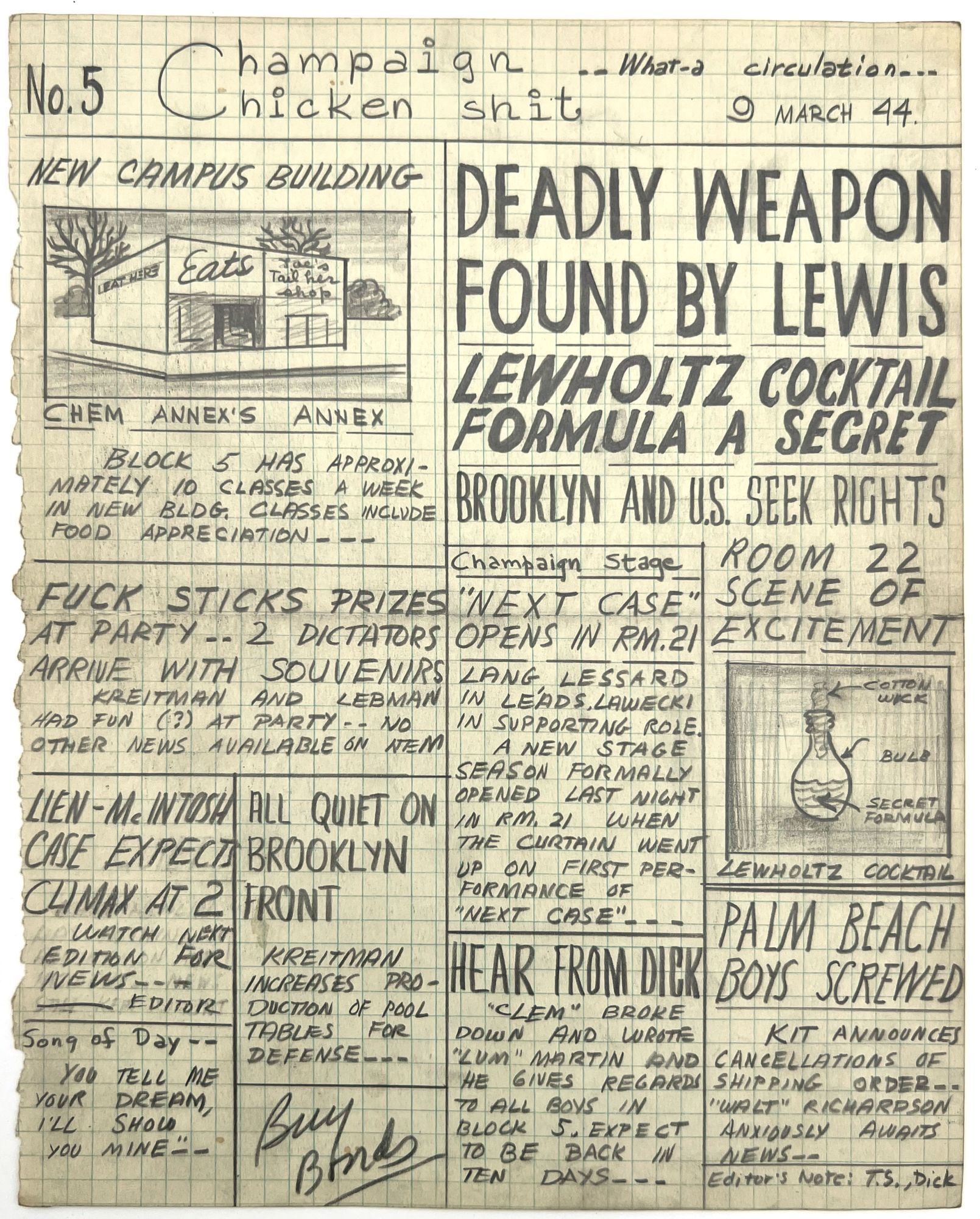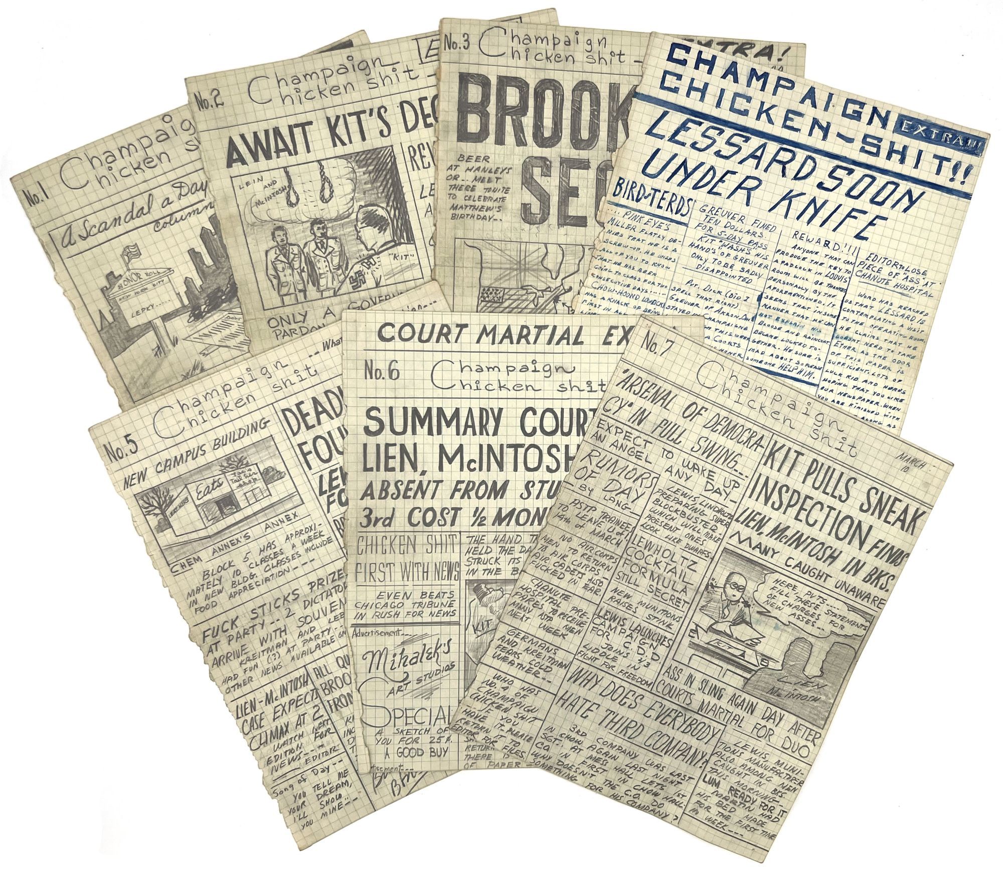[Champaign, Illinois], 1944. Very good. Some dust soiling, toning, occasional small water stain.. Seven mock-up leaves in pencil and ink manuscript for an unpublished, unrecorded WWII-era satirical serial that appears to have been created by and for a group of college-aged students at the University of Illinois, rife with inside jokes and tongue-in-cheek humor. Includes humorous faux headlines such as "LOST Issue No. 4 ... There is a shortage of paper" and "Summary court fines Lien, McIntosh $25.00 [for being] absent from study hall March 3rd". Includes faux adverts and headlines relevant to the friend group (e.g. "Don't Miss Matthew's Birthday Celebration at Hanley's TONITE").