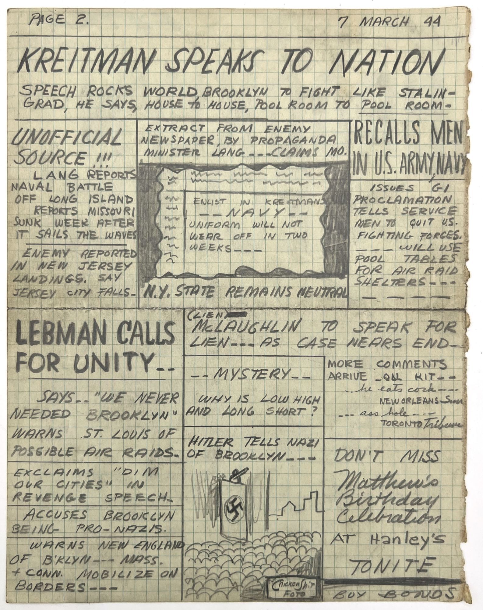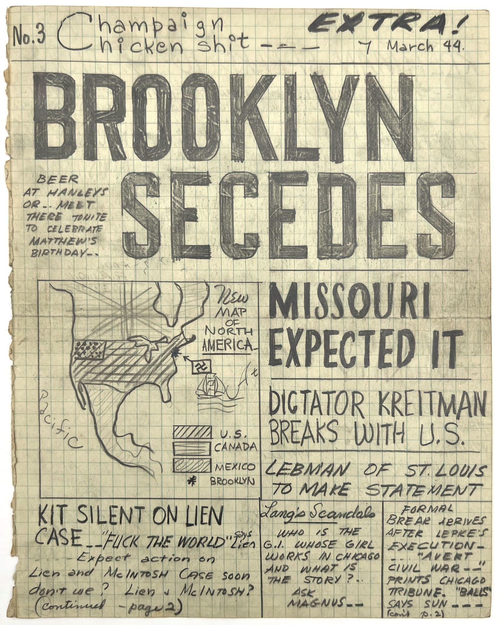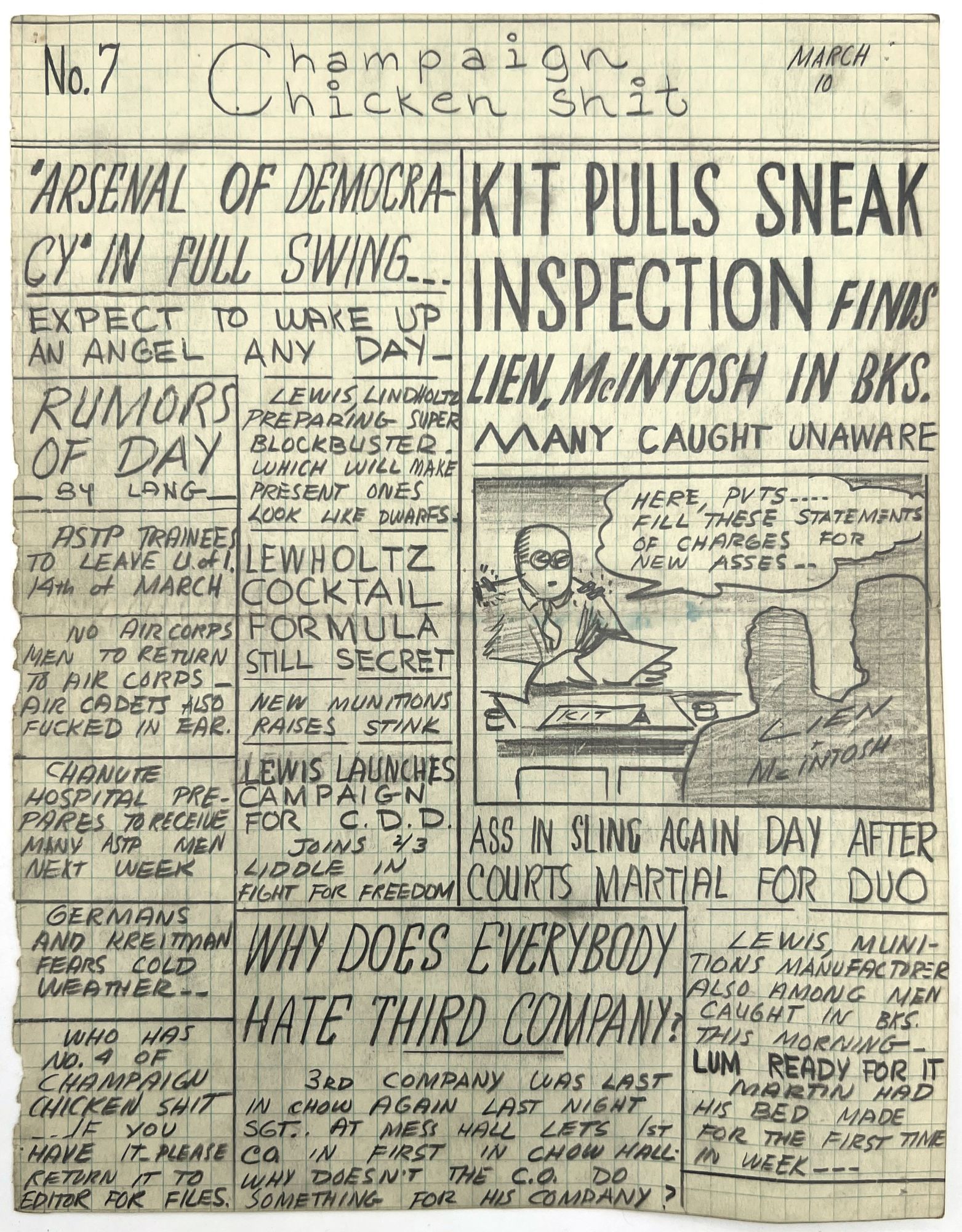 [Champaign, Illinois], 1944. Very good. Some dust soiling, toning, occasional small water stain.. Seven mock-up leaves in pencil and ink manuscript for an unpublished, unrecorded WWII-era satirical serial that appears to have been created by and for a group of college-aged students at the University of Illinois, rife with inside jokes and tongue-in-cheek humor. Includes humorous faux headlines such as "LOST Issue No. 4 ... There is a shortage of paper" and "Summary court fines Lien, McIntosh $25.00 [for being] absent from study hall March 3rd". Includes faux adverts and headlines relevant to the friend group (e.g. "Don't Miss Matthew's Birthday Celebration at Hanley's TONITE").