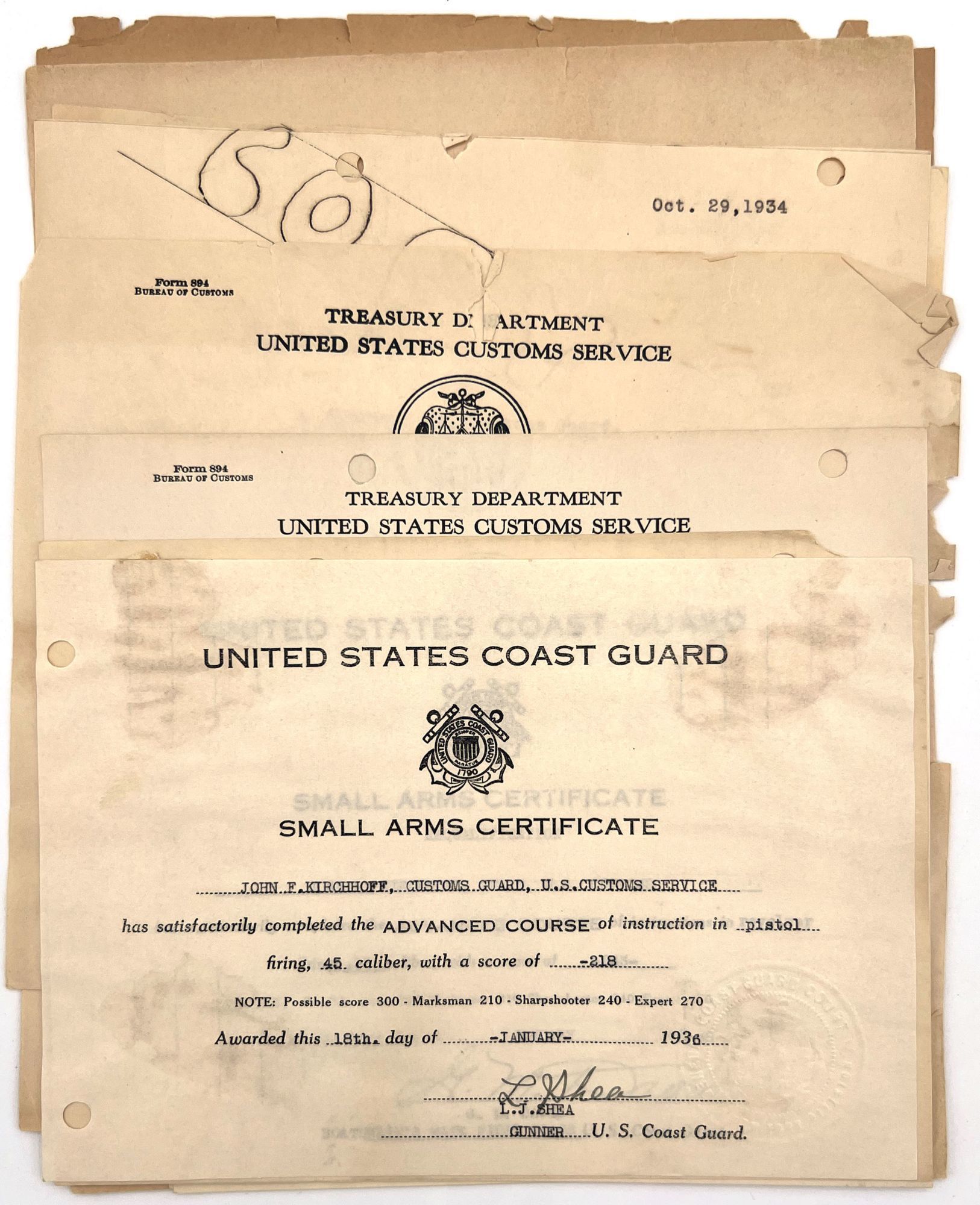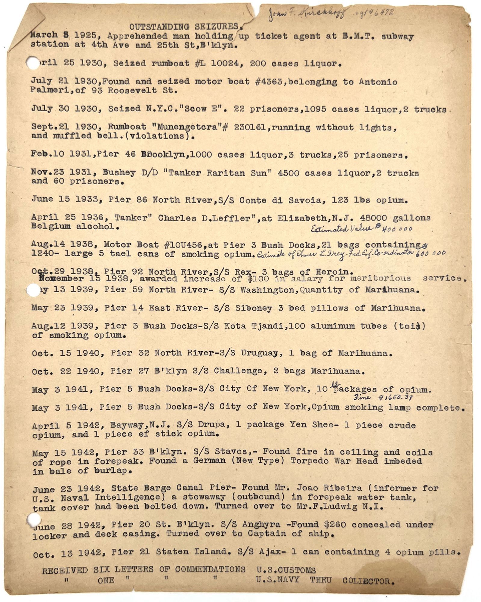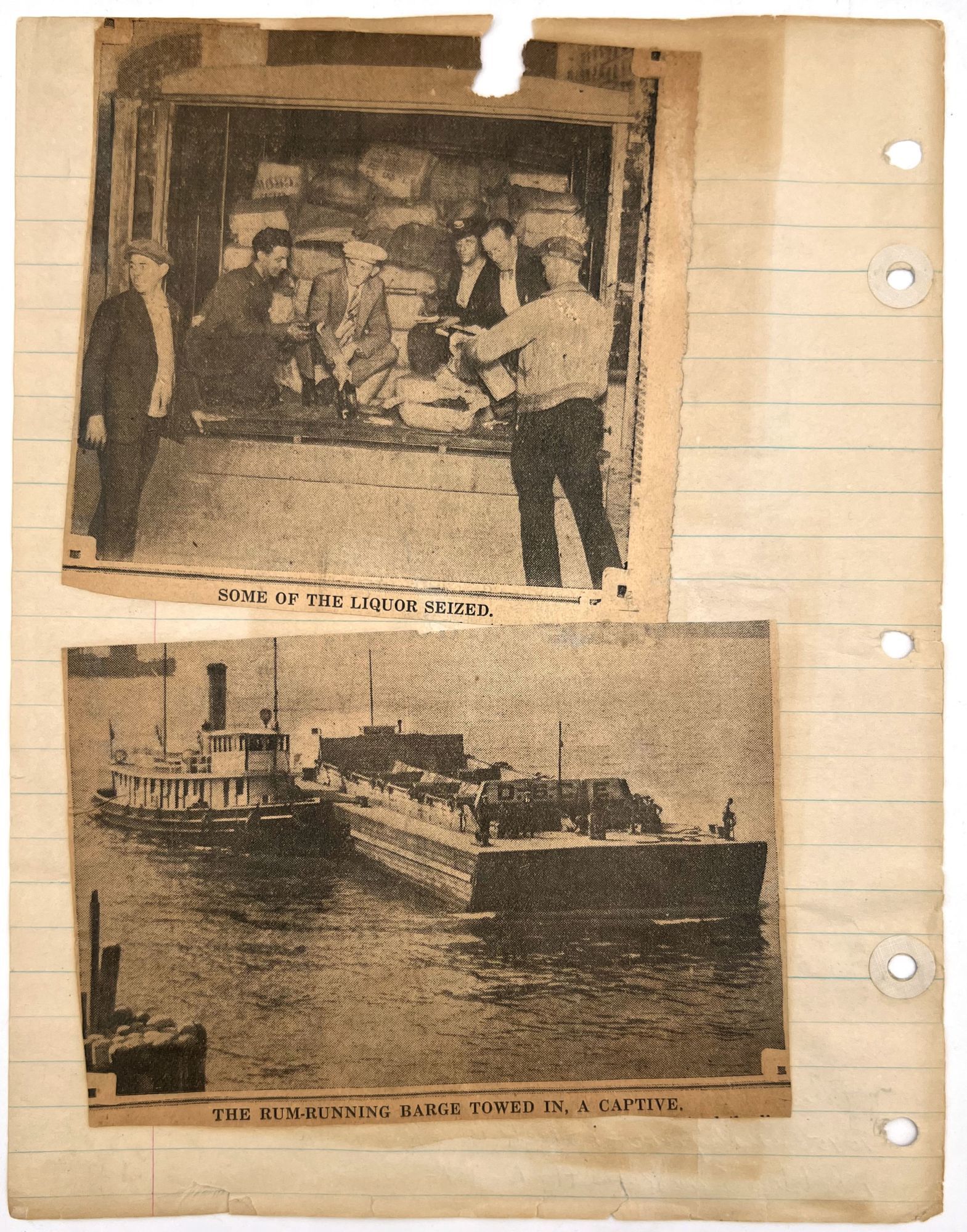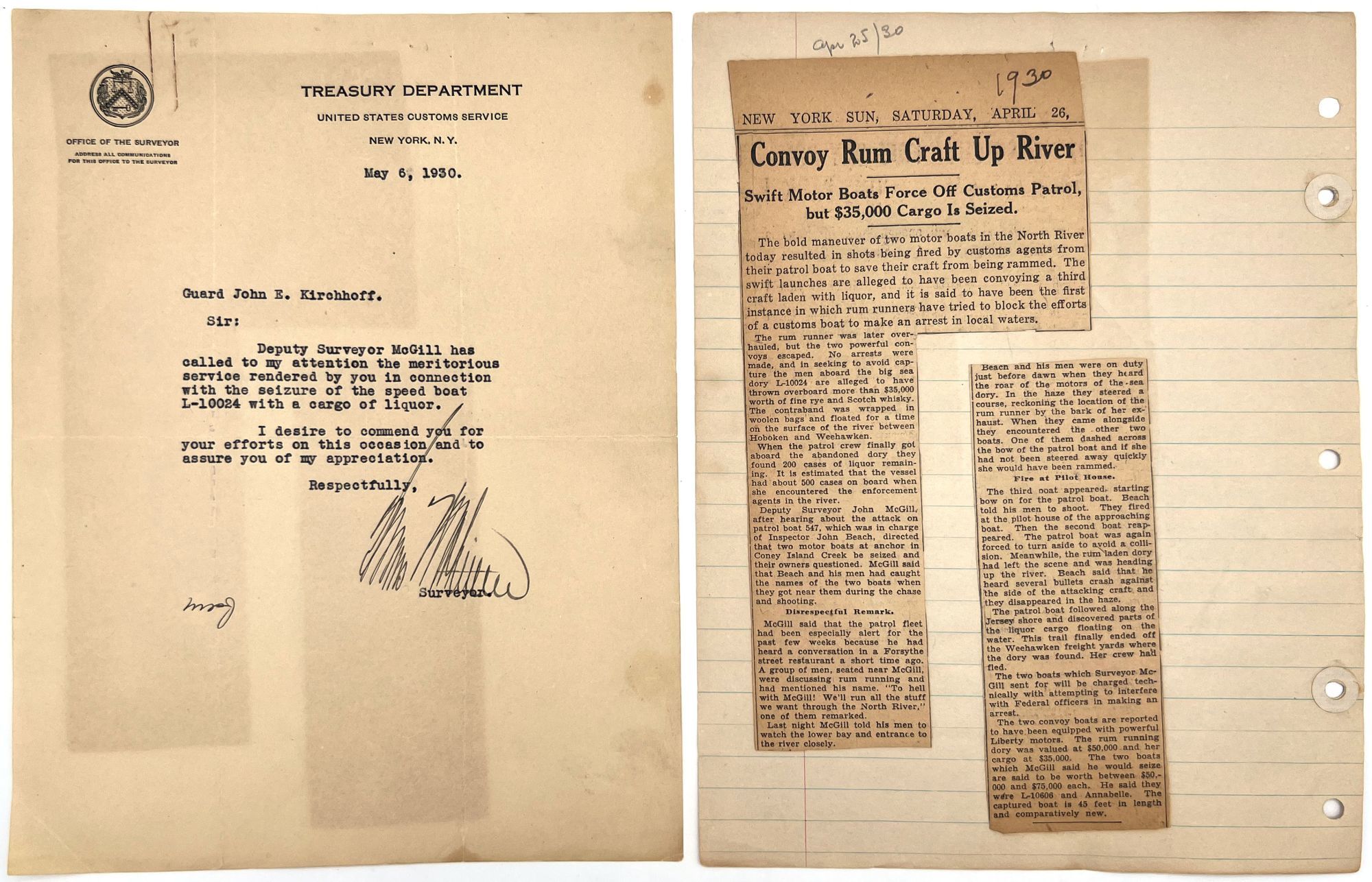 New York, New York, 1954. Very good. Toned, minor short tears, letter folds, or. An archive of original materials relating to customs seizures of alcohol, opium, and other illegal goods in New York City by customs guard John F. Kirschhoff between 1925 and 1954. Includes typewritten lists of harbor patrol raids, correspondence, subpoenas, newspaper clippings, and an original handwritten account of a 1930 liquor raid seizing 1,095 cases of liquor in the East River. At least one of the clippings depicts Kirschhoff in action. The archive appears to have been assembled by Kirschhoff himself, and includes letters to him praising the efforts of him and his colleagues from government officials. Also includes modern (1990s?) photographic reproductions of c.1920s photos of seizures/prohibition protests. An extraordinary archive spanning the entirety of a man's career fighting crime and smuggling in New York, begging for a Hollywood adaptation. Archive is housed in modern white binder. Includes approximately 100 different documents. Many of the accounts read like a dramatic Hollywood movie: "We took up position on the end of B.&O.R.R. Cinder Dock on Staten Island at dusk ... We passed a Tanker slowly ... A man appeared on dock, asked if we were coast guard. Wanted to speak to man in charge, Conroy stepped on dock and spoke to him. After a few minutes Kirchhoff jumped on dock, rubbed his hand on connection of electric pump and hose that was connected with Tanker and smelled alcohol, called engineer Warner and told him to smell my hand, he agreed it was alcohol. I turned around and called to Conroy 'You got it, it's alcohol-- grab him'. There was a scuffle ... I put twisters on his wrist and told Harrison to put him on Patrol boat" (Typewritten account of 1936 seizure of the Tanker Charles D. Leffler).