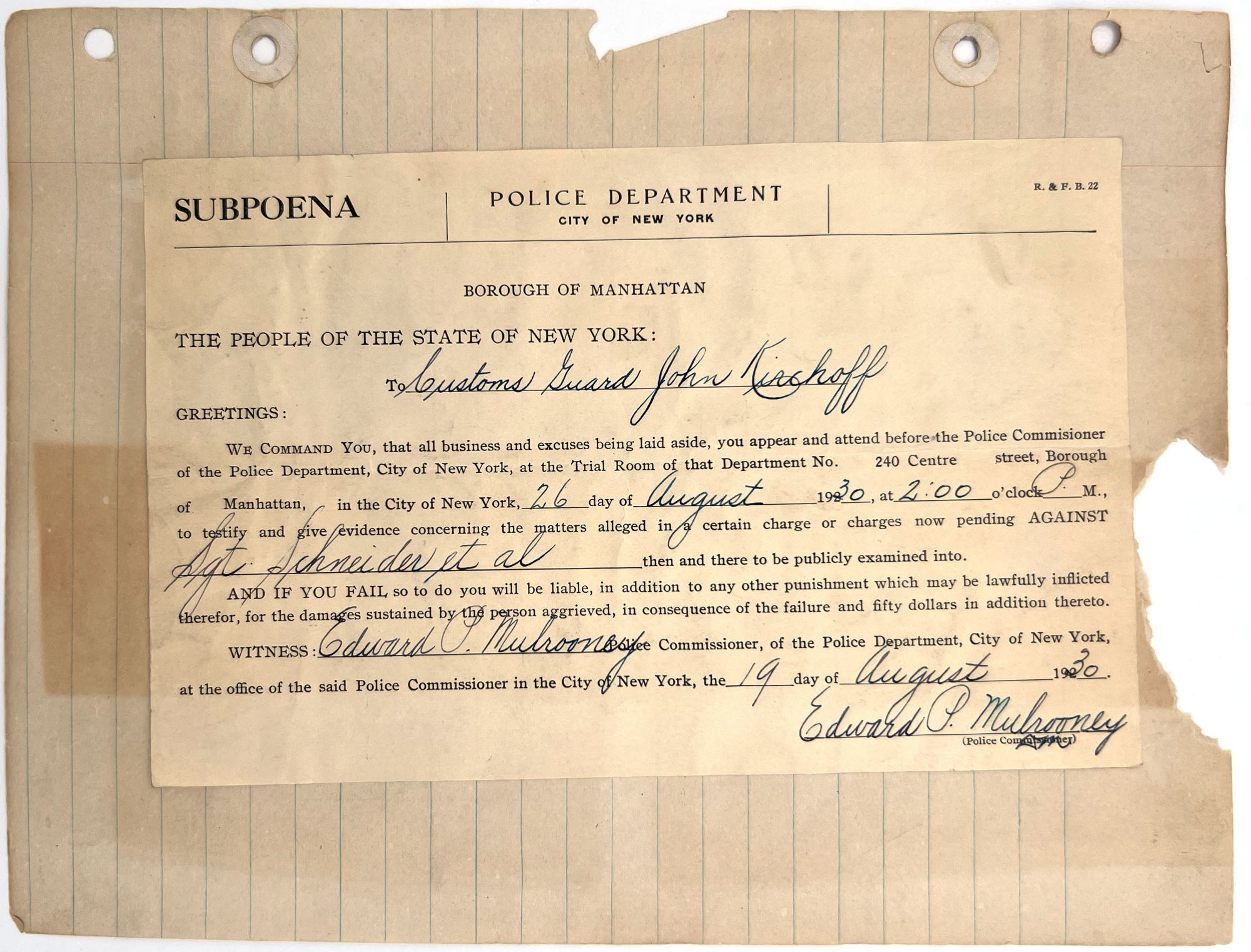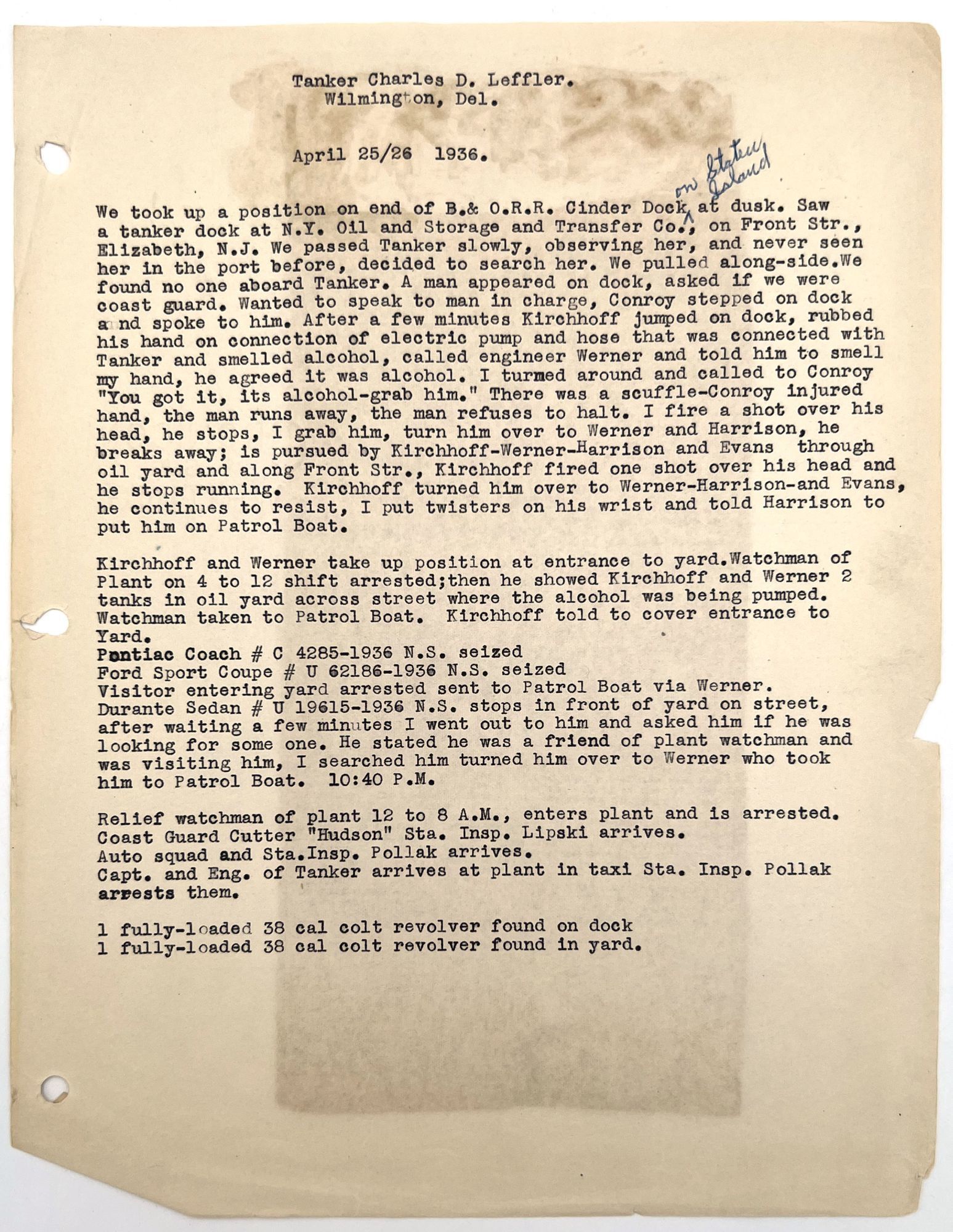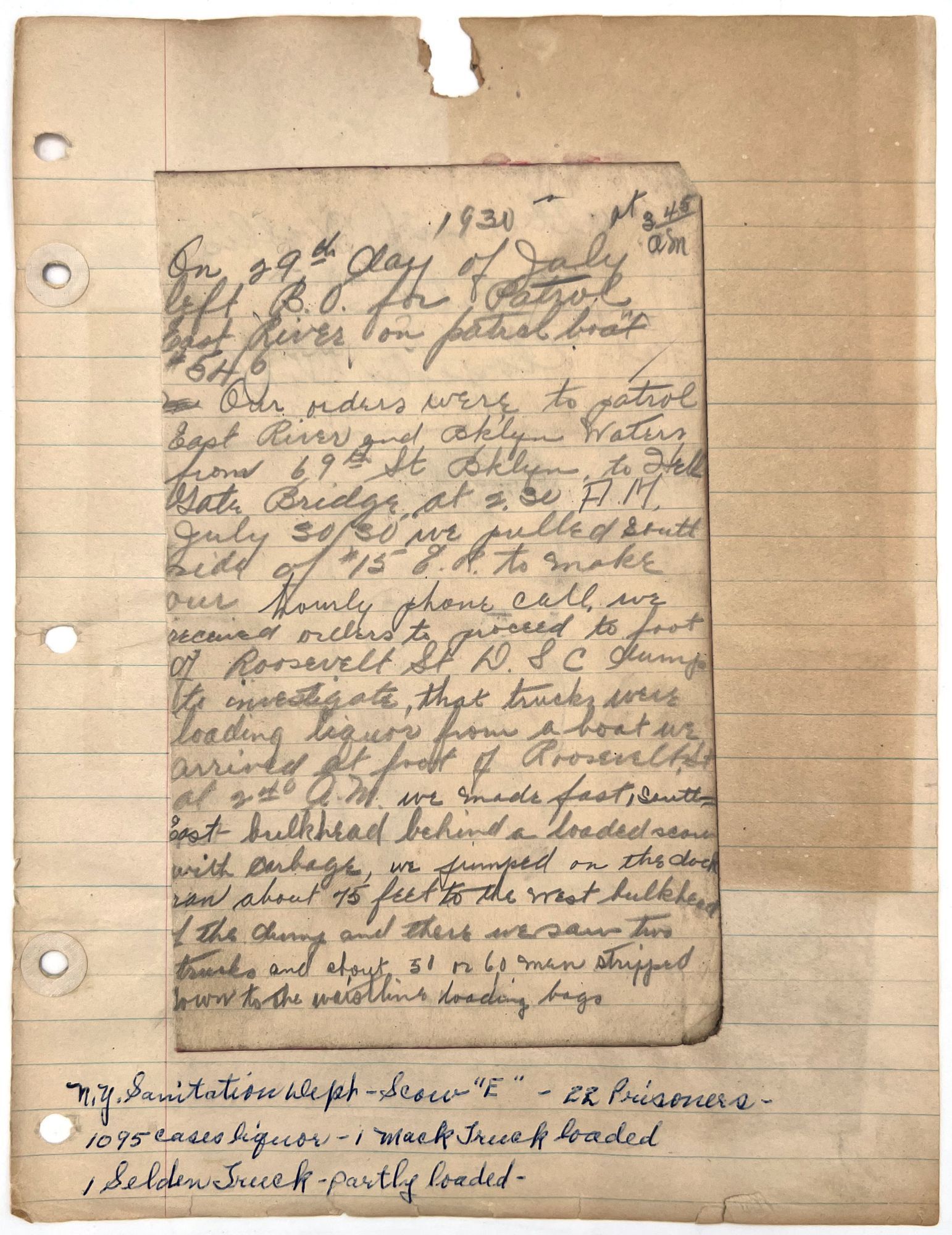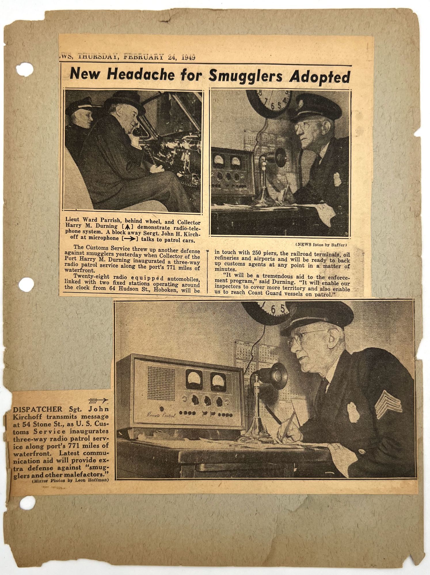 New York, New York, 1954. Very good. Toned, minor short tears, letter folds, or. An archive of original materials relating to customs seizures of alcohol, opium, and other illegal goods in New York City by customs guard John F. Kirschhoff between 1925 and 1954. Includes typewritten lists of harbor patrol raids, correspondence, subpoenas, newspaper clippings, and an original handwritten account of a 1930 liquor raid seizing 1,095 cases of liquor in the East River. At least one of the clippings depicts Kirschhoff in action. The archive appears to have been assembled by Kirschhoff himself, and includes letters to him praising the efforts of him and his colleagues from government officials. Also includes modern (1990s?) photographic reproductions of c.1920s photos of seizures/prohibition protests. An extraordinary archive spanning the entirety of a man's career fighting crime and smuggling in New York, begging for a Hollywood adaptation. Archive is housed in modern white binder. Includes approximately 100 different documents. Many of the accounts read like a dramatic Hollywood movie: "We took up position on the end of B.&O.R.R. Cinder Dock on Staten Island at dusk ... We passed a Tanker slowly ... A man appeared on dock, asked if we were coast guard. Wanted to speak to man in charge, Conroy stepped on dock and spoke to him. After a few minutes Kirchhoff jumped on dock, rubbed his hand on connection of electric pump and hose that was connected with Tanker and smelled alcohol, called engineer Warner and told him to smell my hand, he agreed it was alcohol. I turned around and called to Conroy 'You got it, it's alcohol-- grab him'. There was a scuffle ... I put twisters on his wrist and told Harrison to put him on Patrol boat" (Typewritten account of 1936 seizure of the Tanker Charles D. Leffler).