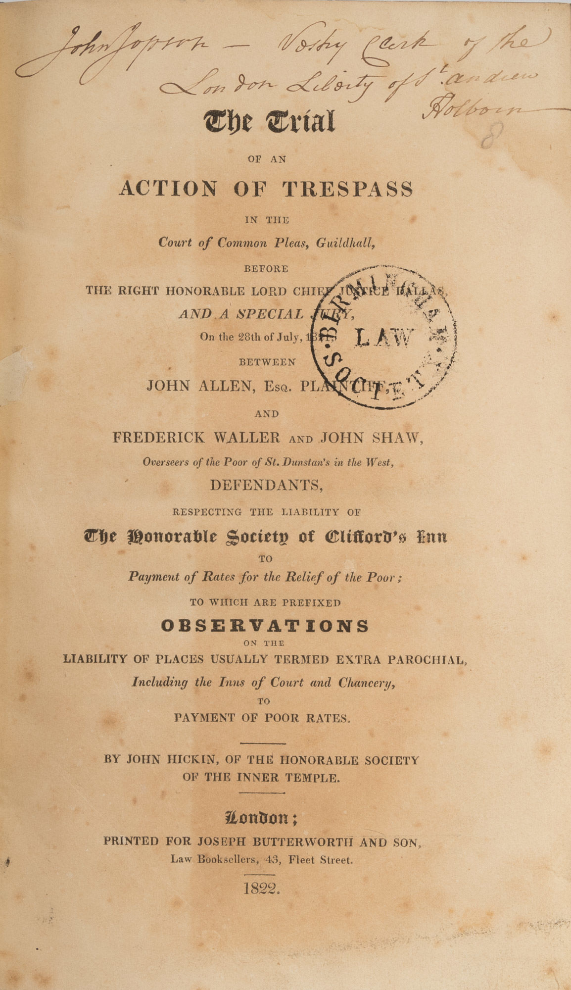 1822. Clifford's Inn Seeks an Exemption from Poor Rates [Trial]. Hickin, John. The Trial of an Action of Trespass in the Court of Common Pleas, Guildhall, Before the Right Honorable Lord Chief Justice Dallace and a Special Jury, On the 28th of July, 1821, Between John Allen, Esq., Plaintiff, And Frederick Waller and John Shaw, Overseers of the Poor of St. Dunstan's in the West, Defendants, Respecting the Liability of the Honorable Society of Clifford's Inn to Payment of Rates for the Relief of the Poor; To Which are Prefixed Observations on the Liability of Places Usually Termed Extra Parochial, Including the Inns of Court and Chancery, To Payment of Poor Rates. London: Printed for Joseph Butterworth and Son, 1822. [viii], lxxxix, [1], 79 pp. Octavo (8-1/2" x 5-1/4"). Near-contemporary pebbled cloth, institutional name and seal to boards, rebacked retaining existing spine with gilt title, endpapers renewed. Faint dampstain to upper outside corner of rear board, light rubbing to extremities, light wear to corners, library bookplate to front pastedown. Light toning to interior, occasional light foxing, faint dampstain to upper outside corner of first three leaves, early underlining and annotations in several places, a few affected by trimming, ownership signature (of John Jopson) to title page, which has a small ink library stamp along with a few other leaves. $450. * Only edition. Extra-parochial areas, such as universities and the Inns of Court, were geographically defined areas considered to be outside of ecclesiastical or civil parishes and thus exempt from certain payments such as tithes or poor rates. As these areas became populated, it became increasingly difficult to provide the governance and assistance to residents that parishes traditionally maintained. In 1822, Clifford's Inn sued after being assessed a poor rate. It was determined by the court that Clifford's Inn was functioning as part of the parish of St. Dunstan's in the West, and the case was dismissed as a nonsuit. OCLC locates 5 copies of this title, 3 in law libraries (Harvard, University of Pennsylvania, Social Law). Sweet & Maxwell, A Legal Bibliography of the British Commonwealth 2:165.