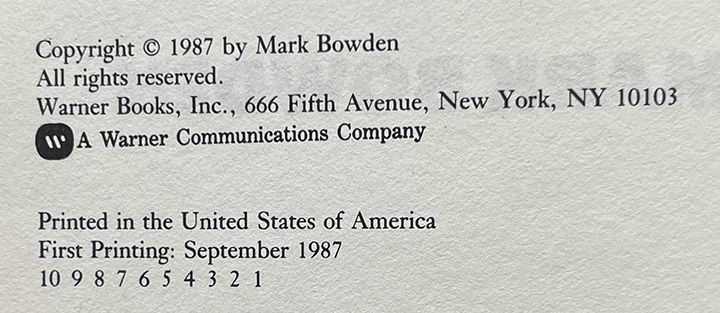 New York: Warner Books, 1987. First Edition. Hardcover. Very Good/Very Good. Very Good in a Very Good jacket, clipped, lightly rubbed at the edges, creased throughout the surface. Quarter black cloth with purple paper on the boards, stains and mottling throughout. Square and firmly bound, foxed at the edges, clean internally. The first book by the author of Black Hawk Down, the story of Larry Lavin and his life from Phillips Exeter Academy to running a $60-million-a-year cocaine empire.