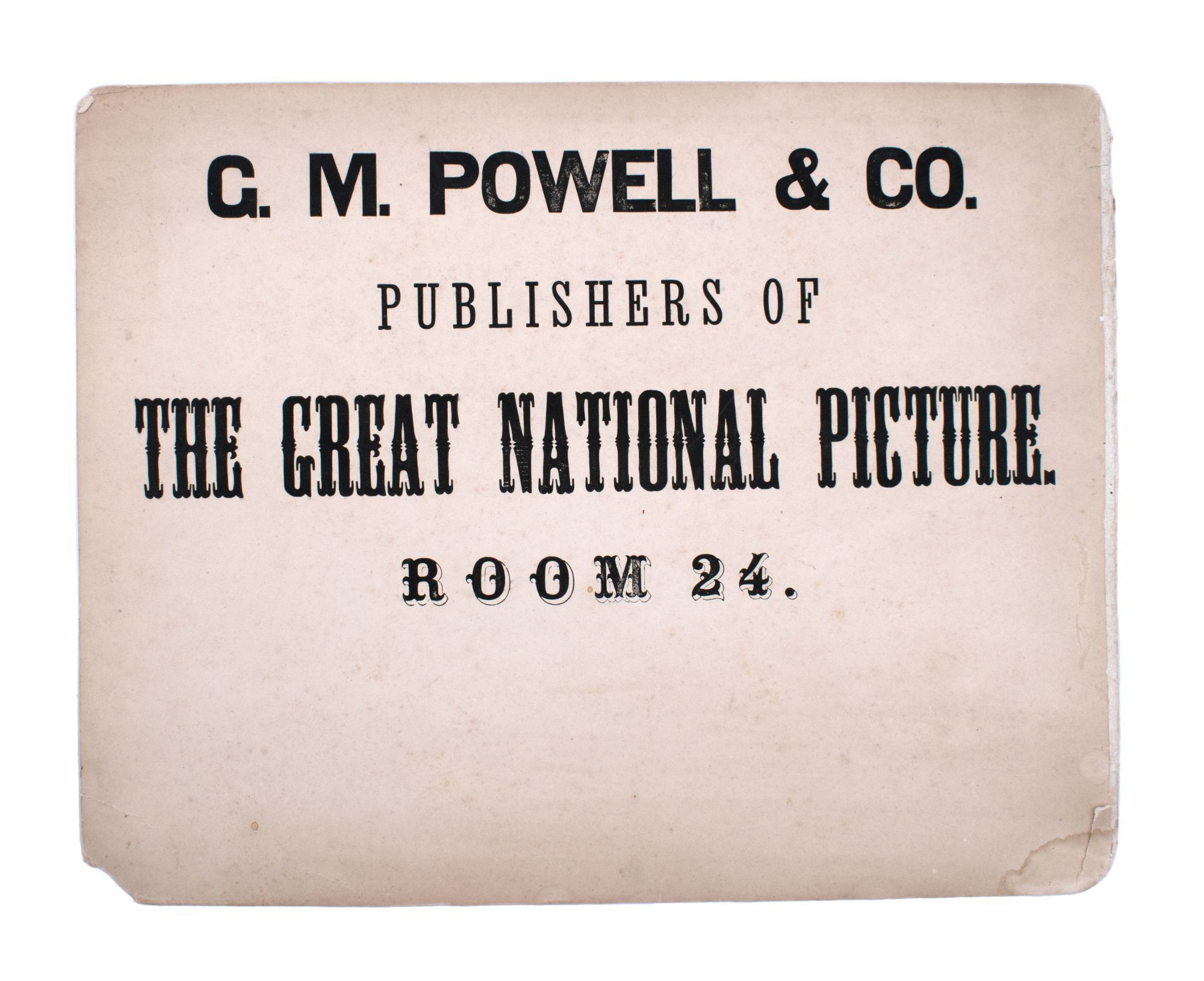 The creator of this montage, George May Powell, was a man of diverse talents and influence. He served as founder of the Evangelical Press Association and Oriental Topographical Corps (where he led an expedition through Egypt and North Africa to create educational maps of Palestine and the Holy Land for school children), was president of the National Forest Council and Intensive Agricultural Society, and ran unsuccessfully for congress on the Prohibition ticket. He was also a long-time supporter of President Lincoln and worked in the Treasury Department during the Civil War. The accompanying point-of-sale broadside for this "Great National Picture" scarce if not unique.