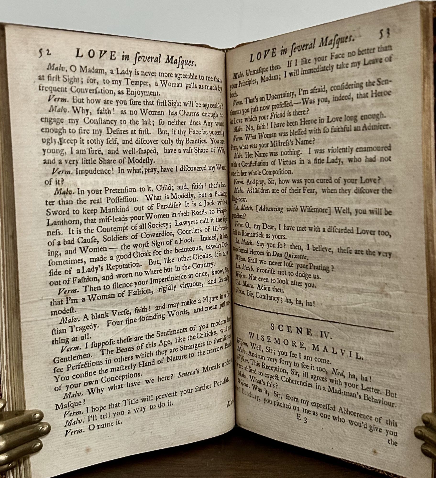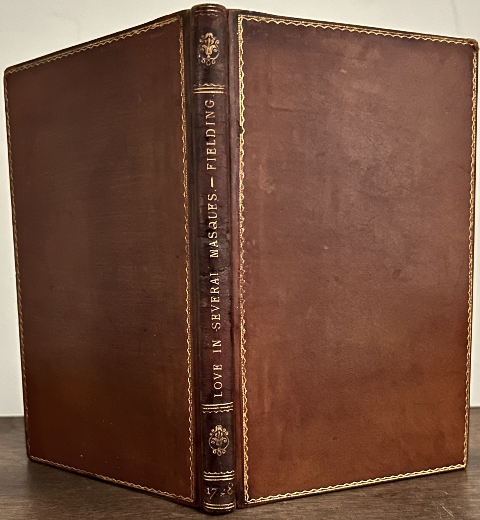 London: John Watts, 1728. First edition. leather_bound. Late 19th century polished brown calf backstrip lettered in gilt. Aeg. Near fine. 83 pages. 19 x 12 cm. First edition of Fielding's first play and second publication. Love in Several Masques was quite the triumph for the 20-year-old Fielding. It opened on February 16, 1728, in Drury Lane, with Colley Cibber and Mrs. Oldfield in the cast, and its competition was Gay's Beggar’s Opera and Vanburgh’s The Provok’d Husband. Very light toning throughout with reasonable text margins, uncommon in most rebindings of the period. Bookplate of Louis C. Asher, creator of the first Sears, Roebuck catalogue, father-in-law of Stanley Kunitz, and armorial bookplate of Viscount Birkenhead. Marbled endpapers, inner dentelles, gilt cover panels.