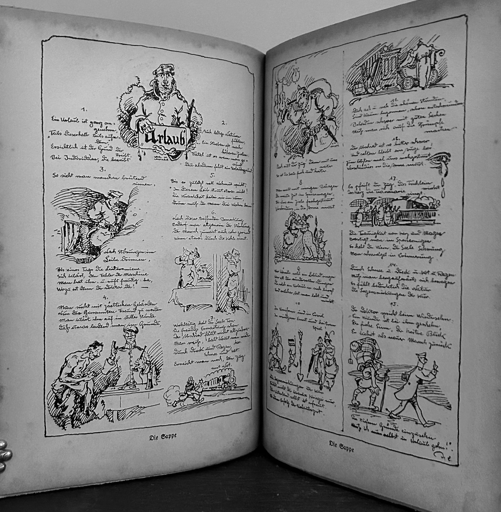 Munich: R. Piper & Co. Verlag, 1917. First edition. Stiff Wraps. Orig. illustrated stiff wrappers. Very good. 154 pages. 21 x 19.5 cm. With a 152 images and facsimiles. Satire and commentary on World War I with all the combatants included. Contemporary review with all participants skewered. Text slightly toned, front cover nick at foot. Text in German.