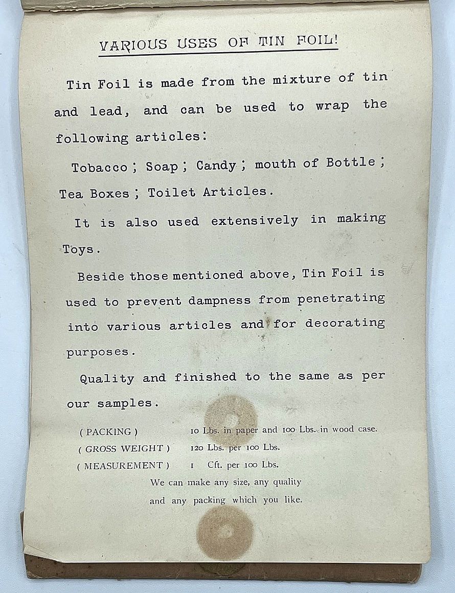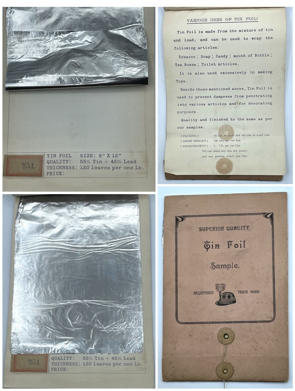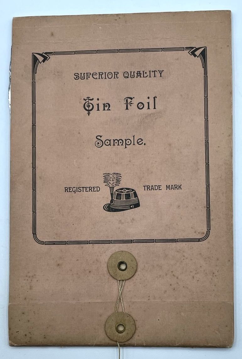 1930. Separations on the first 2 (thinnest) foil sheets. All present.. A scarce 7.5" x 5" bottom opening sample book for various grades of tin foil. Card wraps. The only indication of maker is a logo of a plumbed cap. Introductory page introduces the various uses for tin foil including tobacco, soap, candy, mouth of bottle, tea boxes and toilet articles. "Tin Foil is used to prevent dampness from penetrating into various articles and for decorating purpose."
