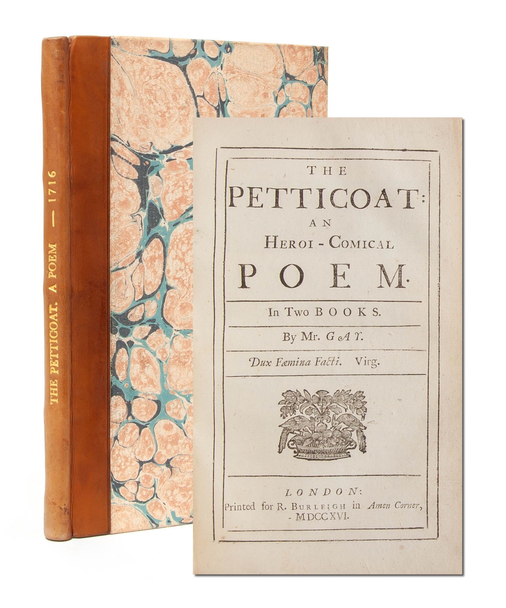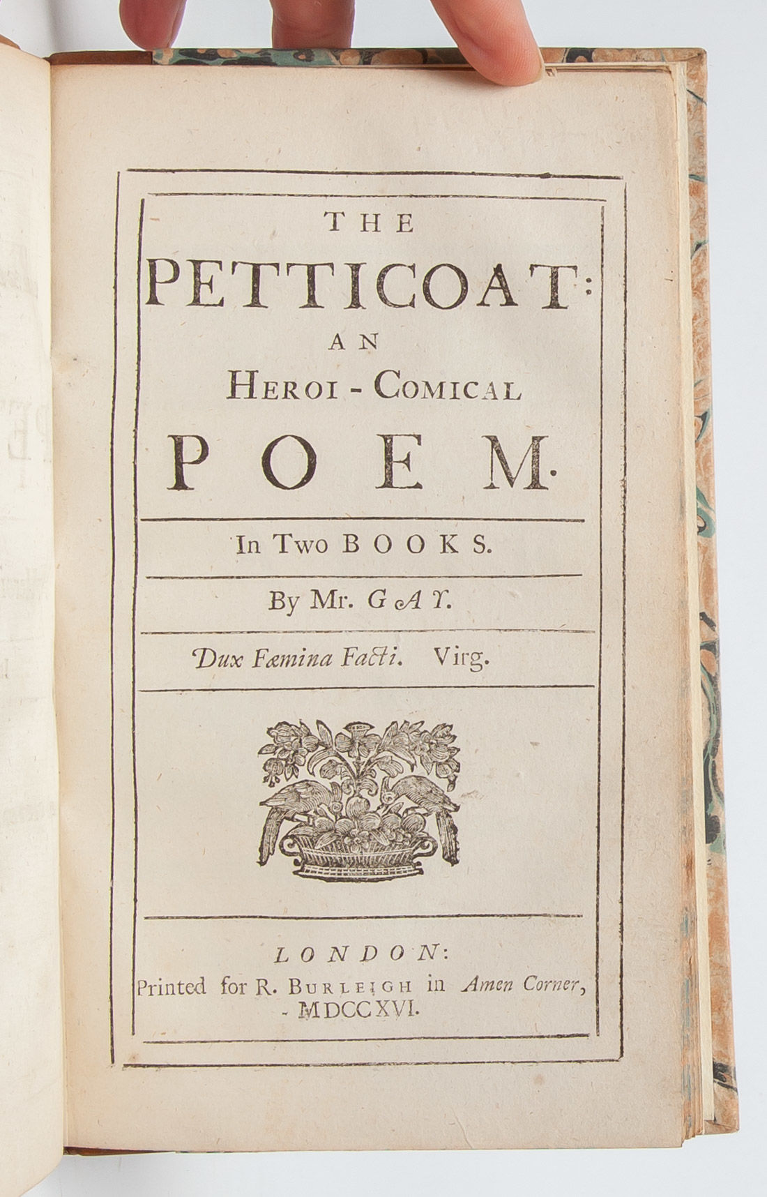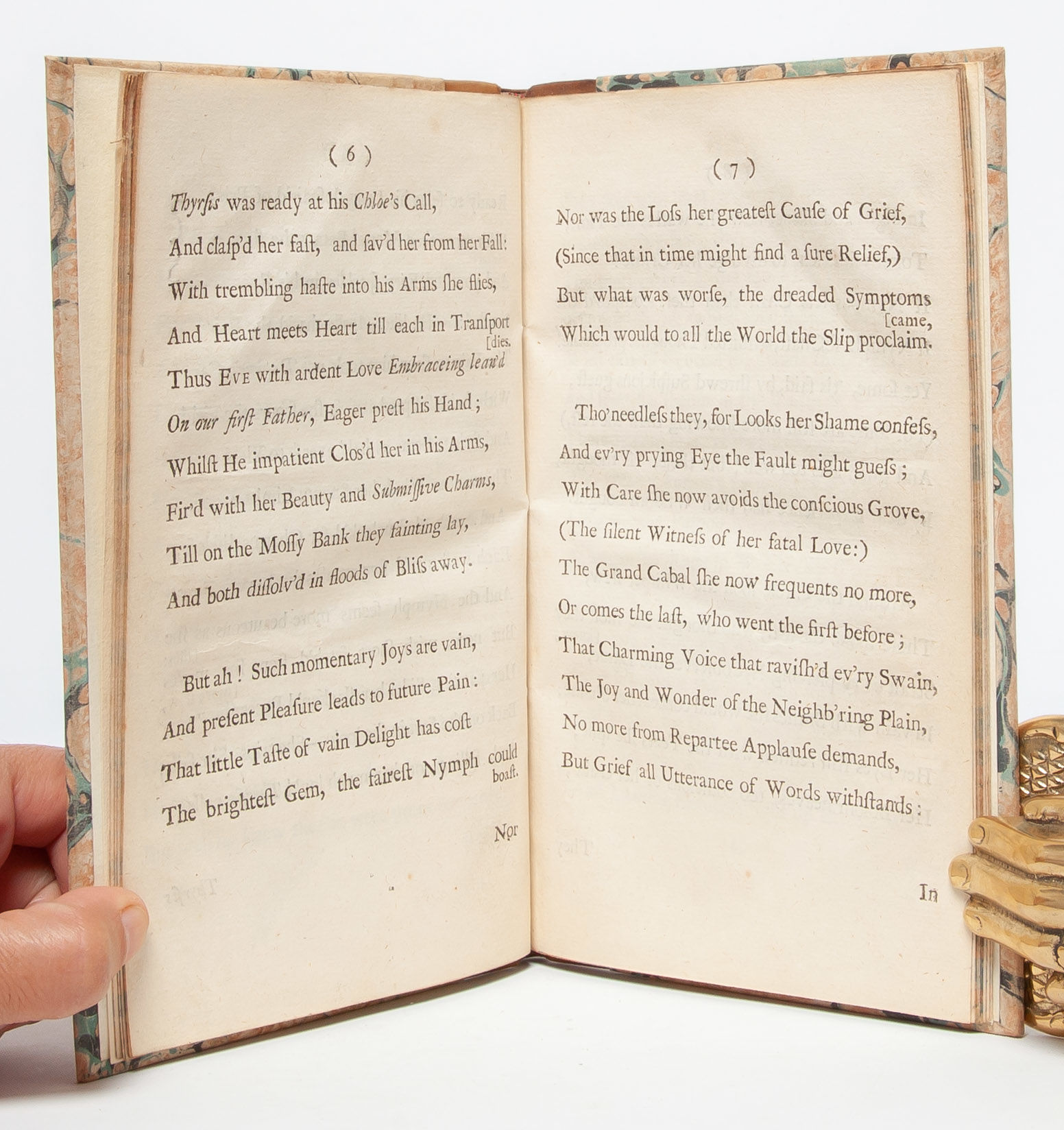 London: R. Burleigh [false imprint for E. Curll], 1716. First edition. Bound to style in quarter calf over marbled boards with gilt to spine. All edges marbled. Measuring 185 x 112mm and collating complete including half title: [4], iii, [1, blank], 39, [1, blank]. With catchword 'behold' on page 27 and floral ornament above 'Finis' on page 39 as called for. A Fine example, unmarked and fresh. A scarce piece of erotic satire, ESTC records copies at 11 U.S. institutions. It last sold at auction in 1929, and the present is the only first edition on the market.