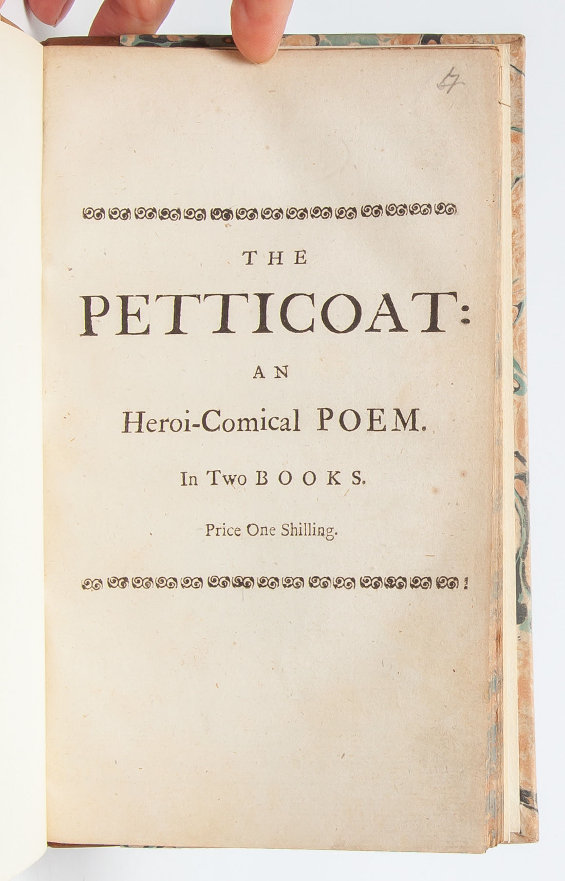 "Begin my Muse and sing in Epick train The Petticoat; Nor shall thou sing in vain, The Petticoat will sure reward thy pain!" So opens a satire composed under the pseudonym Mr. Gay (used by several of those hacks in Edmund Curll's employ), which traces how the amorous adventures of Thyrsis and Chloe were made possible by the latter's fashionable hooped skirt. Finding both humor and seriousness in women's fashion, The Petticoat points out how some of the clothing designed to hinder women's movement could actually be adapted to their advantage -- in this case, the pursuit and fulfillment of illicit sexual affairs. For just as Thyrsis is able to hide beneath his lover's skirt to conceal himself while pleasing her, Chloe is able to share this information with her female coterie (including the work's readers). Thus, women desirous of hiding lovers of any gender might deploy this ingenious method, allowing them to engage in affairs without traveling far from home. An acknowledgement of women's own sexual desire and agency.