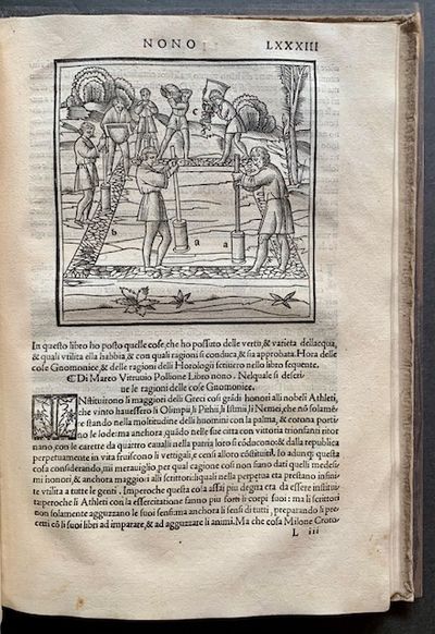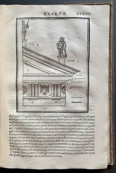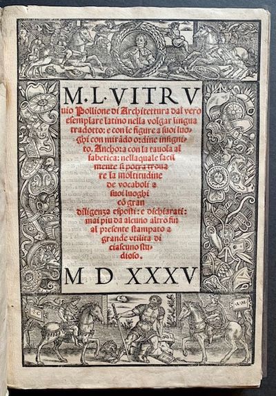 Venice: Niccolo Zoppino, 1535. Boards. Very Good. Vitruvius. Edited by F.L. Durantino. Venice: Niccolo Zoppino, March 1535. Tall 4to (290 x 200 mm). Title within an elaborate historiated woodcut border and printed in red and black, 136 woodcut illustrations and diagrams, figured initials. (Some pale marginal staining and light worming at end.) Early Italian boards, sewn (upper cover fragile but still firmly holding). "Duplicate" bookplate from The Metropolitan Museum of Art (Department of Prints) at the front pastedown. Second Durantino edition. The title border shows figures in battle array, among them Augustus Caesar, Julius Caesar, and Alexander the Great. The figures are labelled with initials. At the head of a border in a central medallion is a figure of Cicero. The 136 woodcuts "are close copies of the full set of blocks from the Giocondo edition of 1511 printed at Venice by Giovanni Tacuino. The copies were made for the first Duarntino edition (Venice, 1524) -- "Zoppino secured all of the 1524 blocks except one; that on leaf N1r is a recutting with the heads of the figures strangely enlarged" (Mortimer).