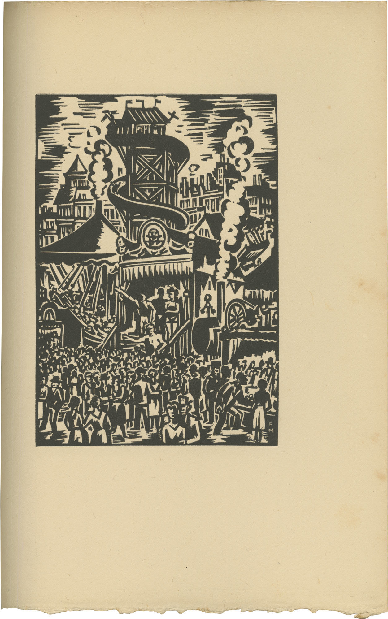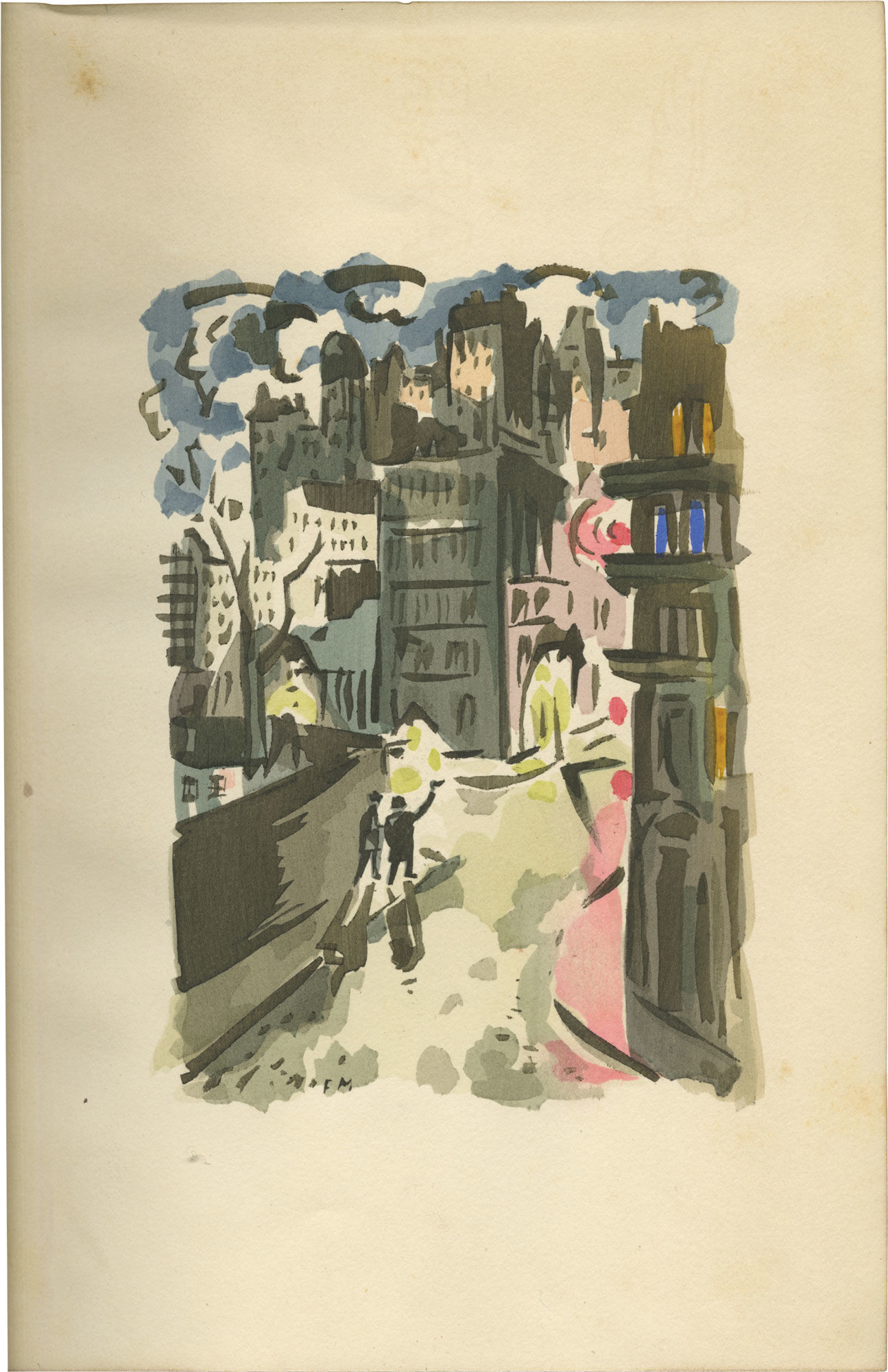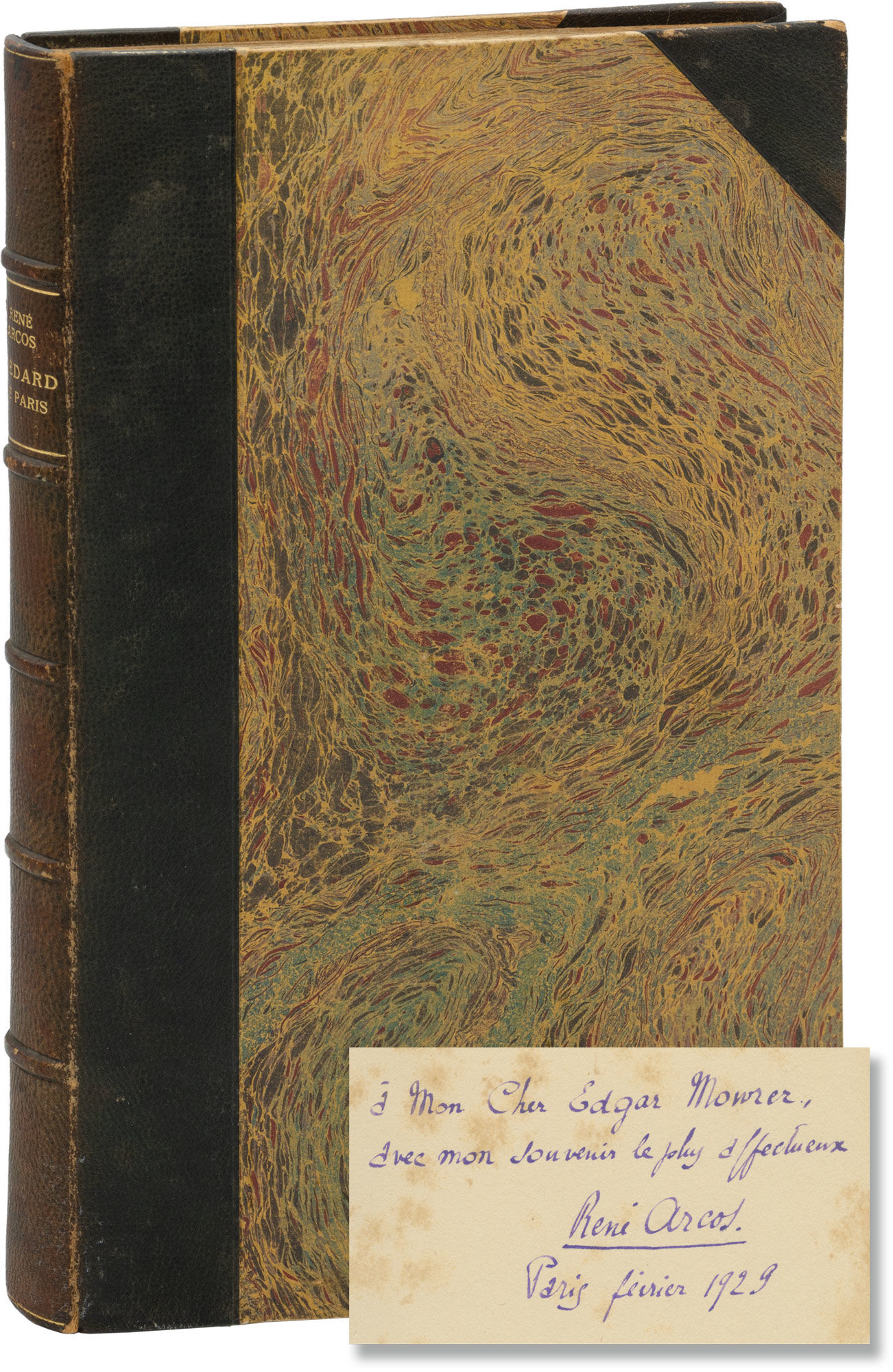 Paris: Éditions du Sablier, 1928. Limited Edition, one of nine hand-numbered copies (this being No. 7) on handmade paper, with a watercolor design by Frans Masereel. INSCRIBED in the year after publication by the author to American journalist Edgar Mowrer on the front endpaper: "À mon Cher Edgar Mowrer / avec mon souvenir le plus affectueux / René Arcos / Paris Février 1929" ("To my dear Edgar Mowrer / with my fondest remembrances / René Arcos / Paris February 1929"). Text and titles in French.