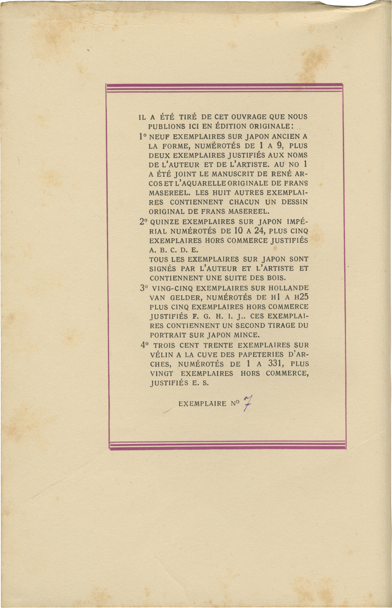 Laid in with the book is a single manuscript leaf of prose in Arcos' hand, dated "Aôut 1928" ("August 1928") and noted as being "A Charles Vildrac" ("To Charles Vildrac"). As with much of Arcos' work, the text largely deals with pacifist themes.