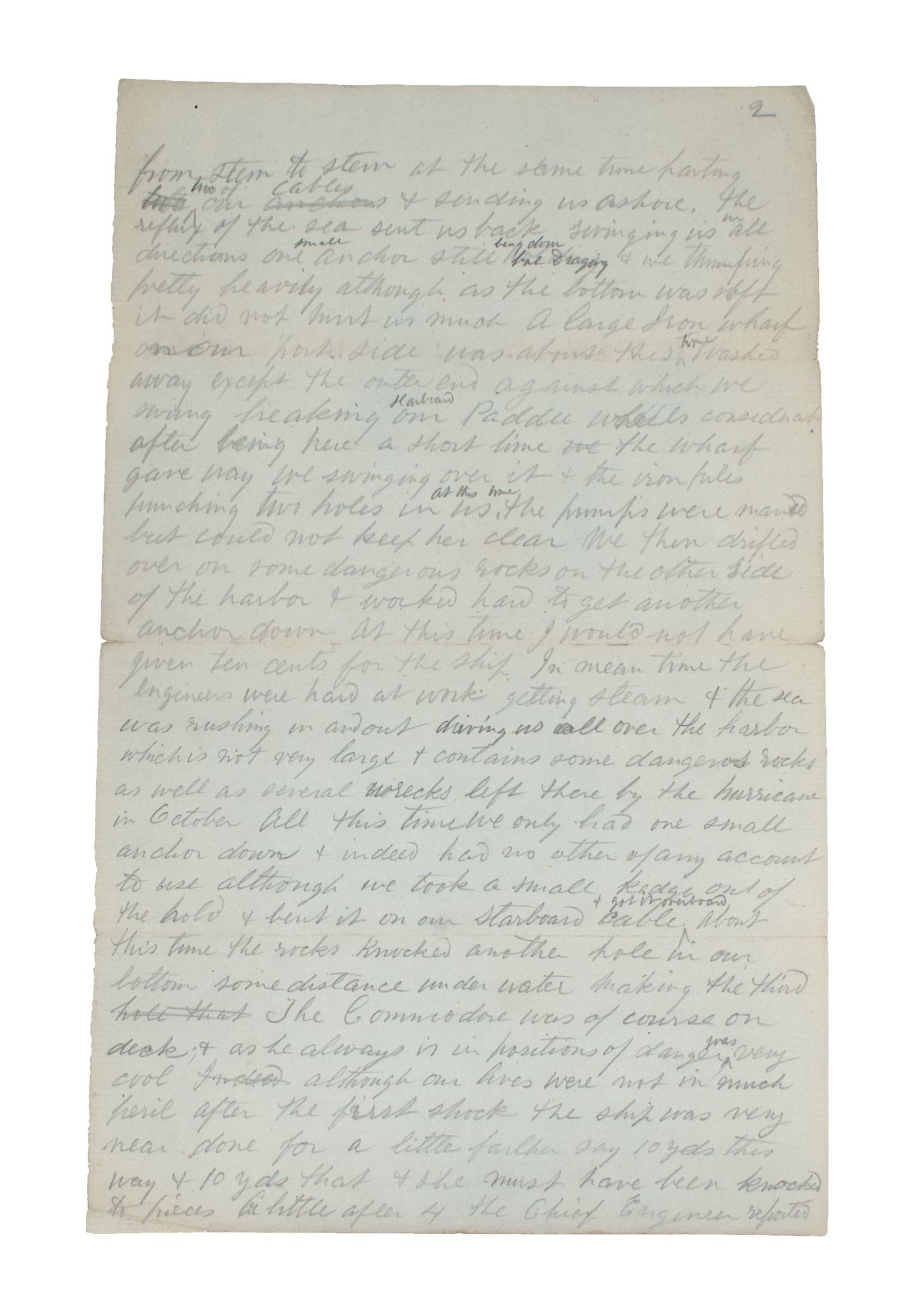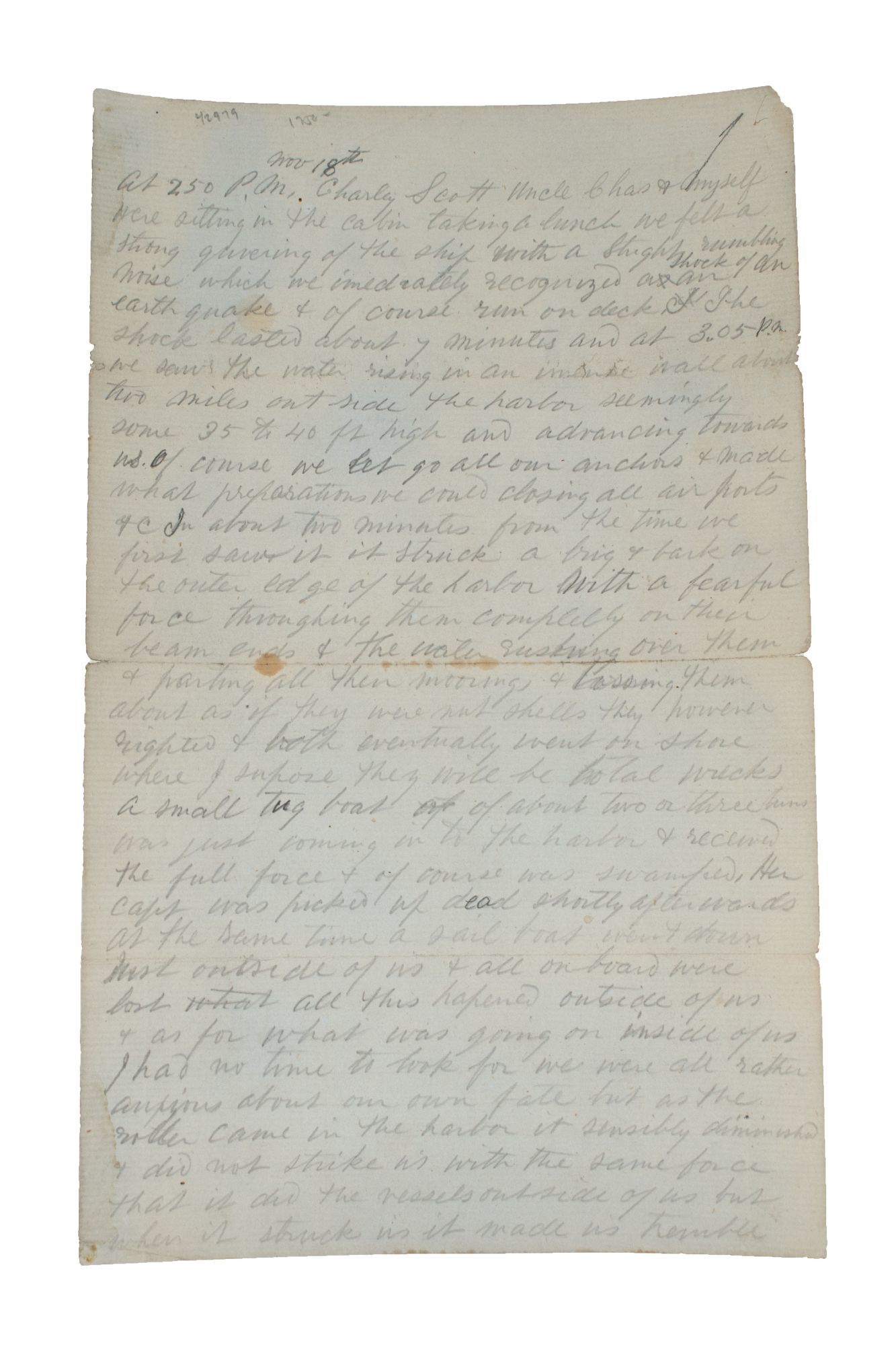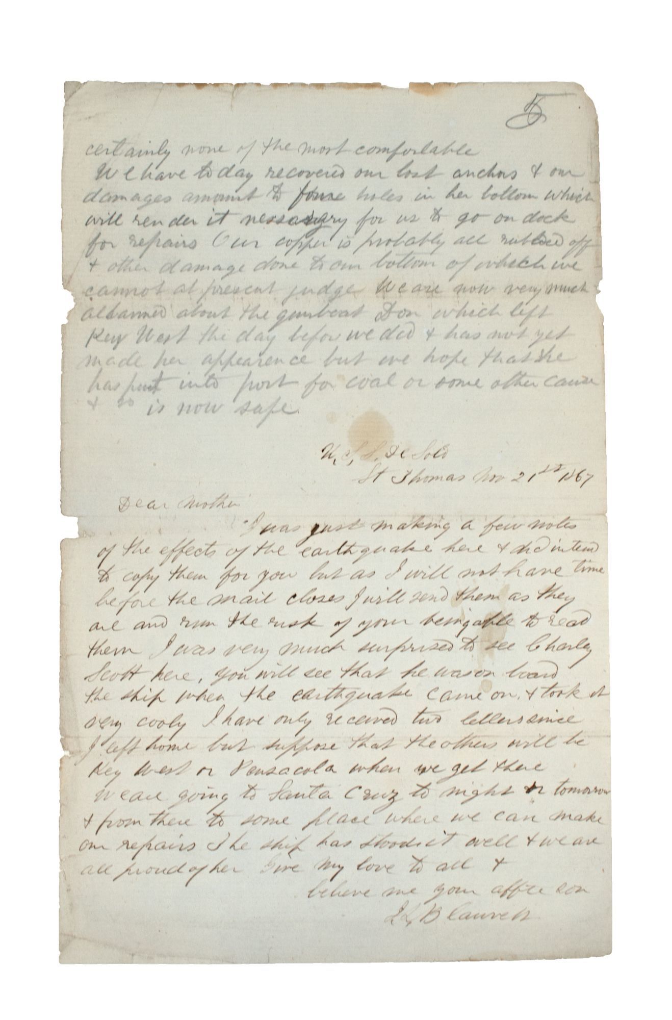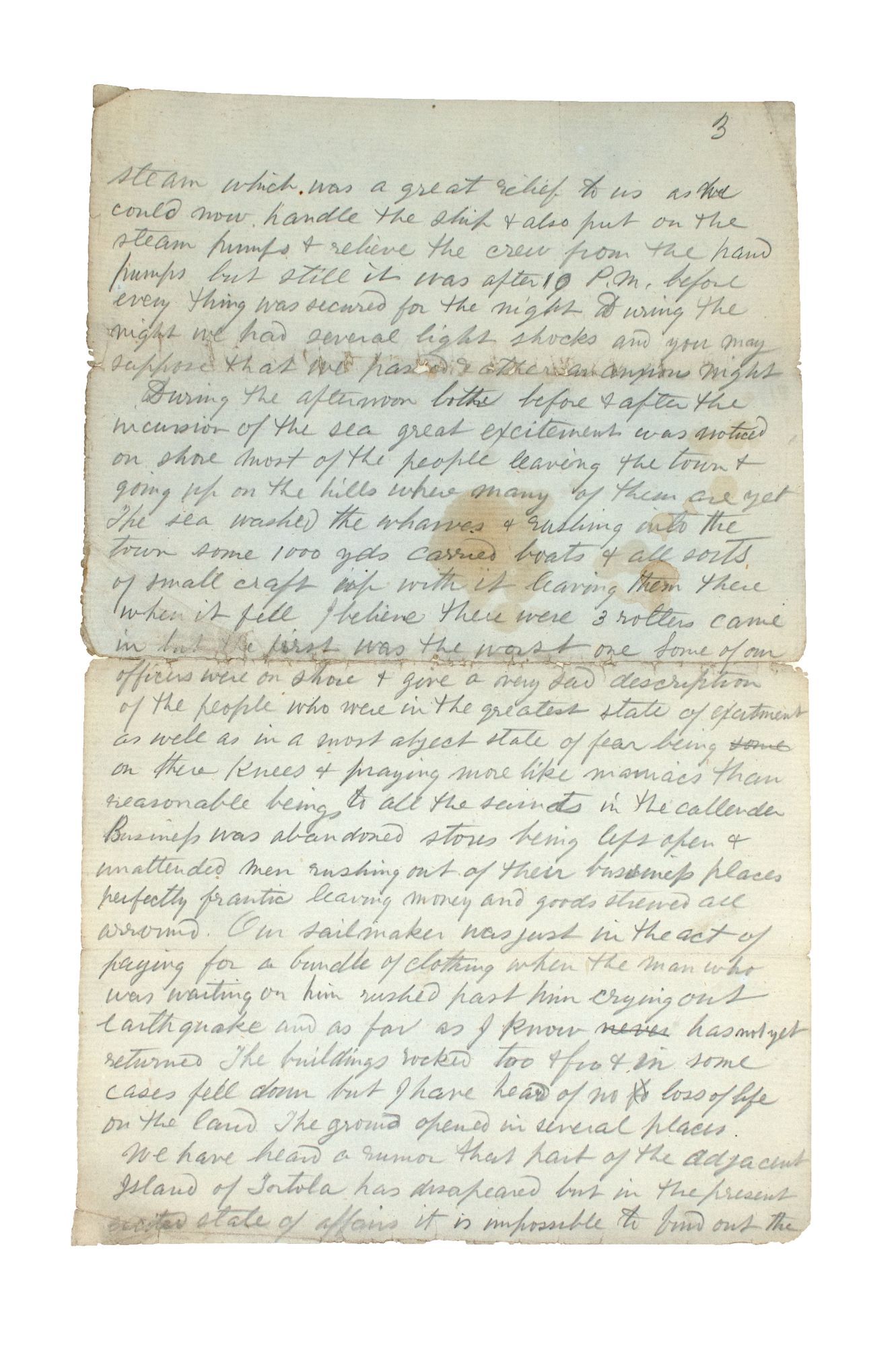 Autograph manuscript, written aboard the USS De Soto at St. Thomas, Virgin Islands, giving a first-hand account of the 1867 earthquake and tsunami that hit the island