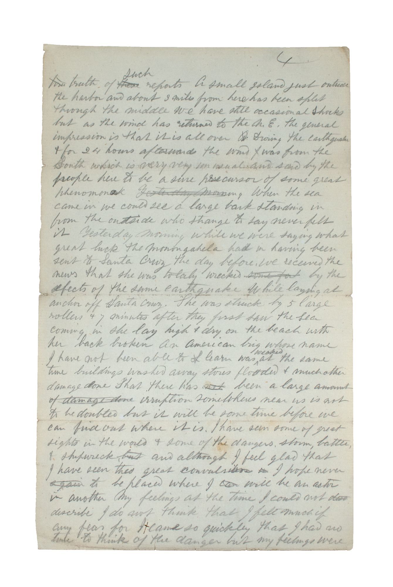 St. Thomas, Virgin Islands, 1867. 5pp. (written on rectos only) on folio sheets, with an autograph letter signed addressed to his mother on the fifth page sending the manuscript, following the description of events. A total of sum 1250 words. Folio. Sheets with wear around the edges. Each sheet neatly backed with paper, repairing small tears or separations. Overall, in good condition, and very readable. 5pp. (written on rectos only) on folio sheets, with an autograph letter signed addressed to his mother on the fifth page sending the manuscript, following the description of events. A total of sum 1250 words. Folio. An exciting firsthand account by an American sailor, describing the effects of the terrible earthquakes and tsunamis that hit the Virgin Islands on November 18, 1867. J.L.B. Cauvelt was a sailor aboard the U.S.S. De Soto, which was anchored in the harbor of St. Thomas when the earthquake hit. The ship was badly damaged in the resultant tsunamis caused by the earthquakes, which had an estimated 7.5 magnitude on the Richter scale. These are Cauvelt's original notes of his experiences, written shortly afterward and appended to a letter he wrote his mother on November 21.