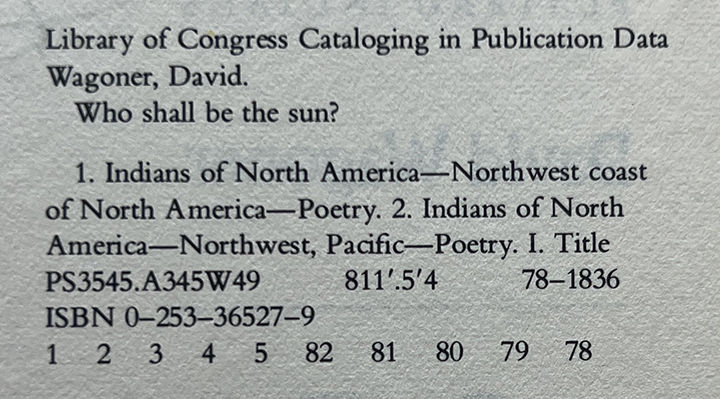 Bloomington: Indiana University Press, 1978. First Edition. Hardcover. Fine/Fine. Fine in a Fine jacket, unclipped (stickered at $9.95). Brown cloth with gilt lettering on the spine. Square and firmly bound, clean internally. A collection of poems that finds inspiration from the stories and songs of the Kutenai, Nez Perce, Coeur d'Alene, Lillooet, Cathlamet, Coos, Chinook, Nootka, Kwakiutl, Haida, Tsimashian, and Tlingit.