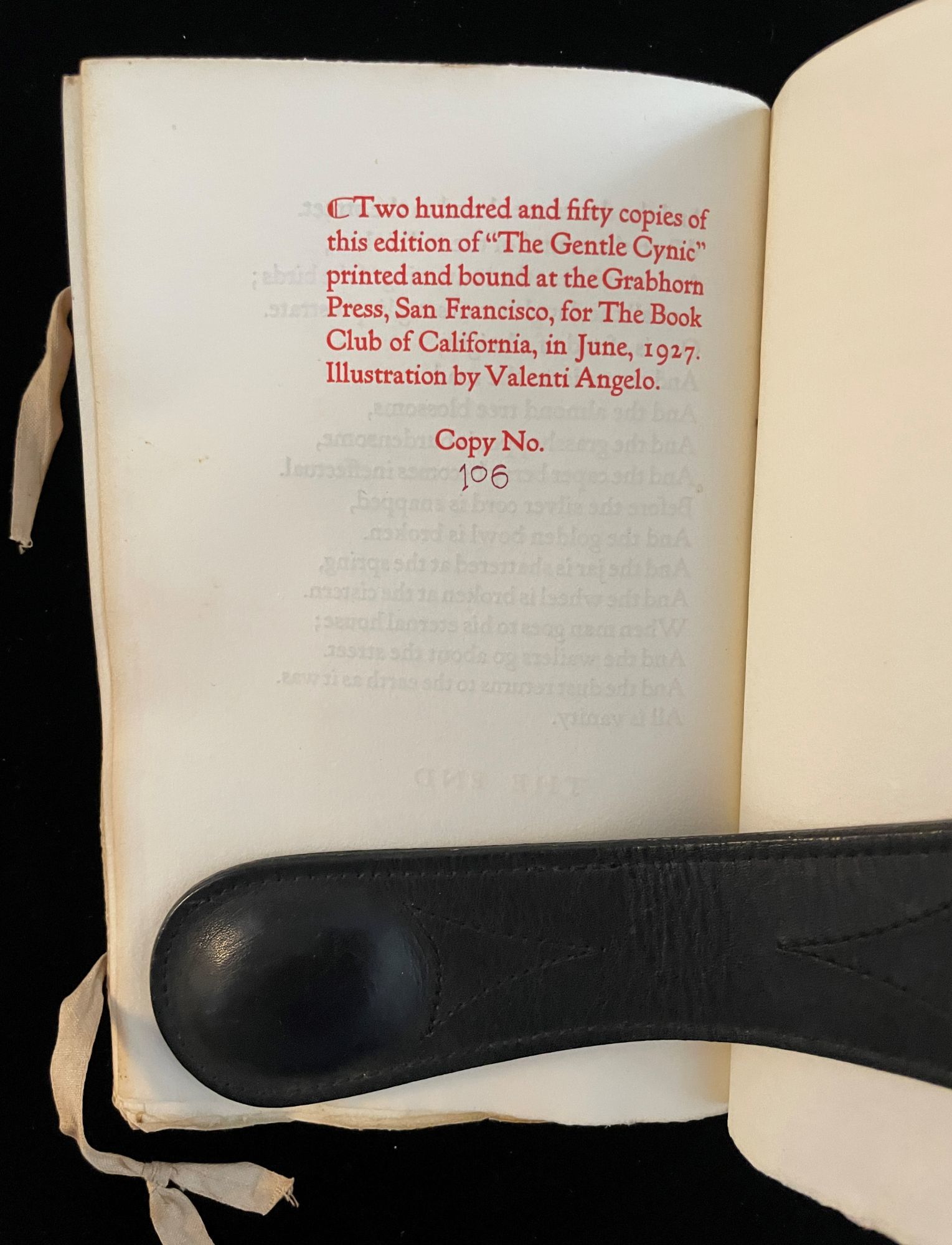 San Fransciso: Grabhorn Press, 1927. Hardcover. Very Good +. Limited edition, this hand-numbered 106 of 250 copies, printed and bound at the Grabhorn Press in San Francisco. Full vellum, somewhat tanned, two bands of ribbon ties, unpaginated. Illustrations by Valenti Angelo. Bookplate of an etching of a clipper ship from the library of William Searby, below which is a gift inscription dated 1928. With its original brown cardboard slipcase which is stained and missing its backstrip. Internals of the book are quite nice. An uncommon Grabhorn item.