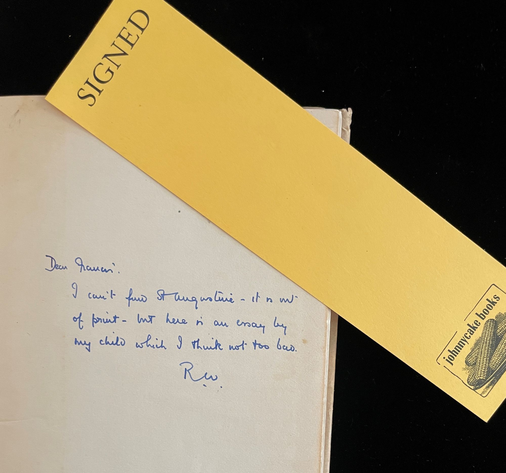 London: Routledge and Sons, 1946. 1st Edition. Hardcover. Very Good/Near Fine. Uncommon anthology, edited by Grigson, as an "international miscellany of humanism" with stories, poems and articles by the likes of WH Auden, Martin Buber and, most relevant in the case of this copy, a 7-page essay by Anthony West entitled "The Precious Myth", in which he ruminates on the nature of myths, beginning with a childhood memory. West is the only son of author Rebecca West, born out of her affair with H. G. Wells. Anthony West famously published "Heritage" in 1955, a fictionalized autobiography, which presents a particularly unflattering picture of his mother Rebecca, who successfully sued to halt publication in the UK. This title carries a telling inscription, most likely executed years before Anthony's revelatory novel (this title being printed in 1946) from Rebecca to a friend named Francis about her son: "Dear Francis, I can't find St. Augustine - it is out of print - but here is an essay by my child which I think not too bad. R. W." The inscription's reference to St. Augustine vis a vis Anthony might be snark; in any event, Rebecca calling her adult son - by 1946 already an accomplished writer himself - a "child" seems condescending; and then, there's Rebecca's characterizing Anthony's writing as "not too bad". Mother and son remained estranged until Rebecca's end; on her deathbed when asked whether he should be sent for, she answered: "perhaps not, if he hates me so much." 8vo, brown linen (a little worn at spine tips), xii, 220 in its original worn dustjacket with some loss at spine ends and around edges, but supplied with a near fine replacement jacketing the worn original.