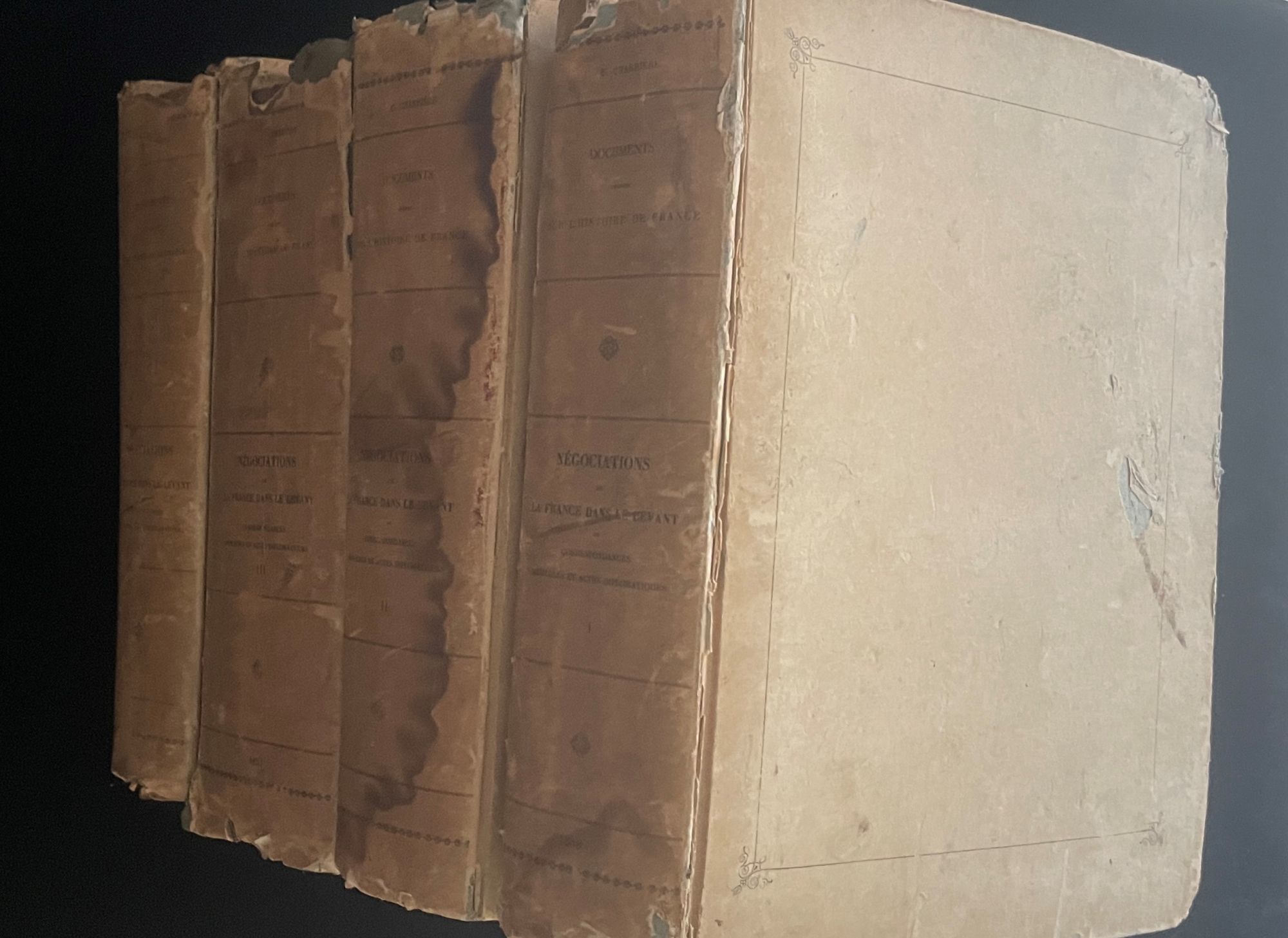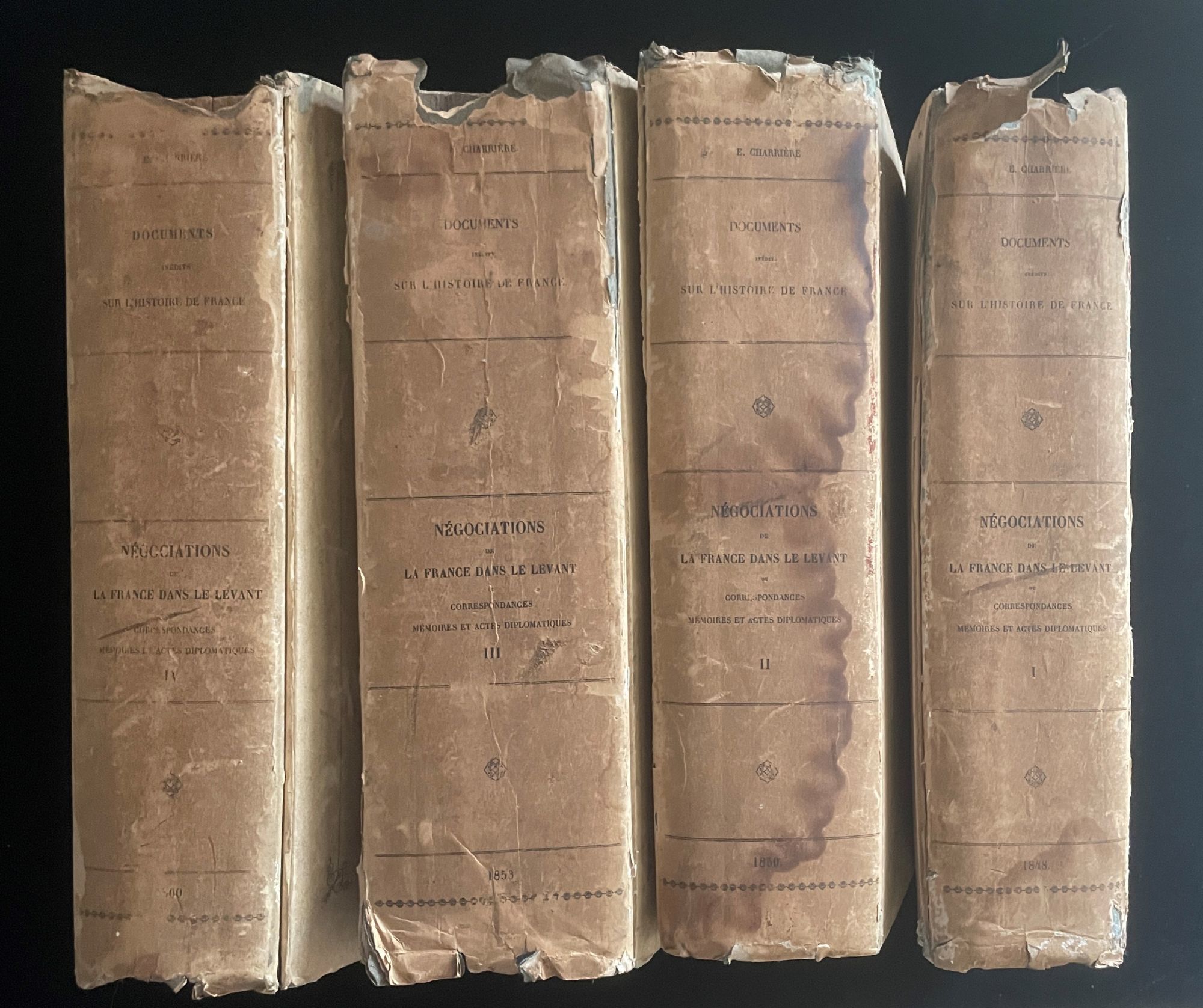 Négociations de la France dans le Levant, ou, Correspondances, mémoires et actes diplomatiques das ambassadeurs de France à Constantinople et des ambassadeurs, envoyés ou résidents à divers titres à Venise, Raguse, Rome, Malte et Jérusalem en Turquie, Perse, Géorgie, Crimée, Syrie, Égypte, etc. et dans les états de Tunis, d'Alger et de Maroc. (4 volumes,. complete)
