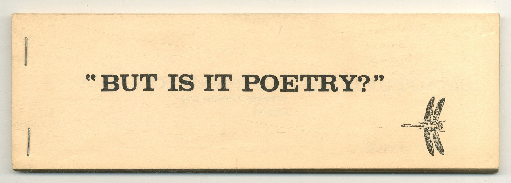 [No place]: The Dragonfly, 1972. Softcover. Near Fine. First edition. Edited by Duane Ackerson. Oblong octavo. 8.5" by 2.75". Stapled printed wrappers. Near fine. Collection of single-line poems. Contributions from Bill Zavatsky, Charles Simic, William Stafford, Robert Bly, and others.