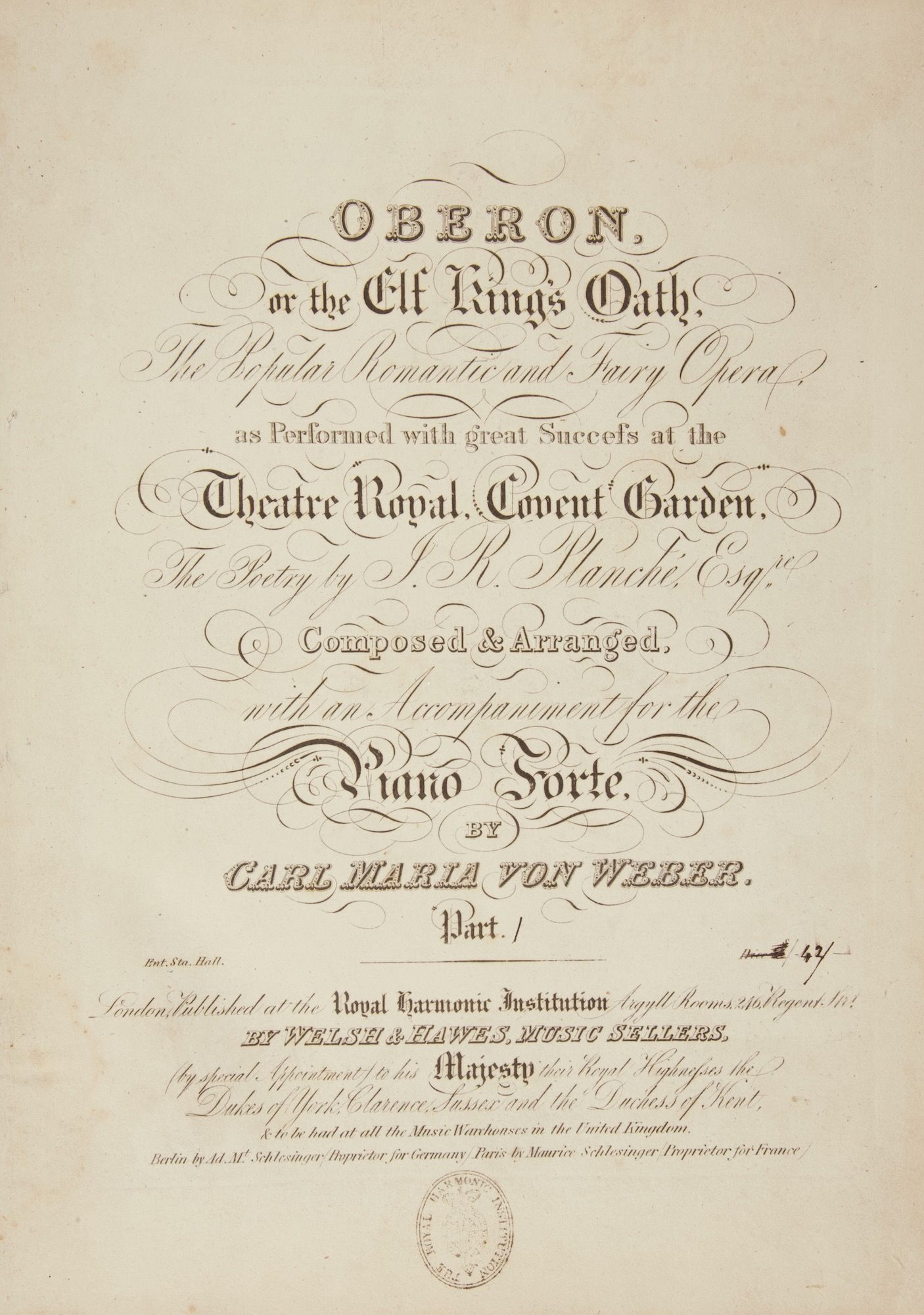 Title with price "42/" added in manuscript, with small oval handstamp of the Royal Harmonic Institution to lower margin.