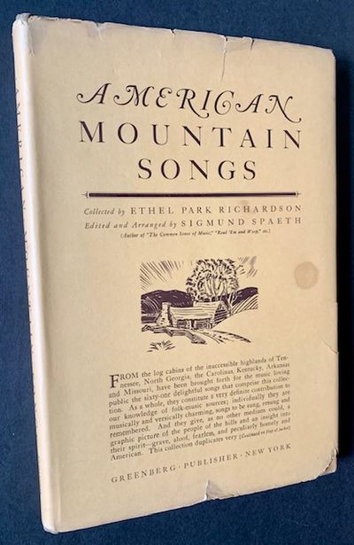 New York: Greenberg, 1927. Cloth. Very Good/Very Good -. A solid, very presentable copy of the uncommon 1927 1st edition, IN ITS SCARCE DUSTJACKET. Tight and VG+ to Near Fine in a crisp, bright, VG+ dustjacket, with several very small closed tears and a touch of mild chipping at the tips. Quarto, compiled by Ethel Park Richardson, edited and arranged by the formidable Sigmund Spaeth. "The songs are arranged in four groups: I: Ballads -- Americanized and American; II: Lonesome and Love Tunes; III: Spirituals; and IV: Nonsense Songs