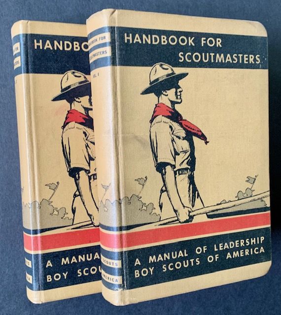 New York: Boy Scouts of America, 1936. Pictorial cloth. Very Good +. The Third Handbook for Scoutmasters, in 2 volumes. Vol. I is the Fall 1936 1st imprint and Vol. II is the December 1938 3rd imprint. Both volumes solid and VG+ in their light-brown pictorial cloth, with just a touch of very light soiling at the panels. Vol. II has a Boy Scout bookplate ("Boy Scout Foundation of Greater New York") at the front pastedown and its faint shadow at the opposite front free endpaper. Thick 16mos, wonderfully illustrated throughout in dozens and dozens of black-and-white photos and line-drawings and charts. Charming 2-vol Boy Scout handbooks from the 1930s.