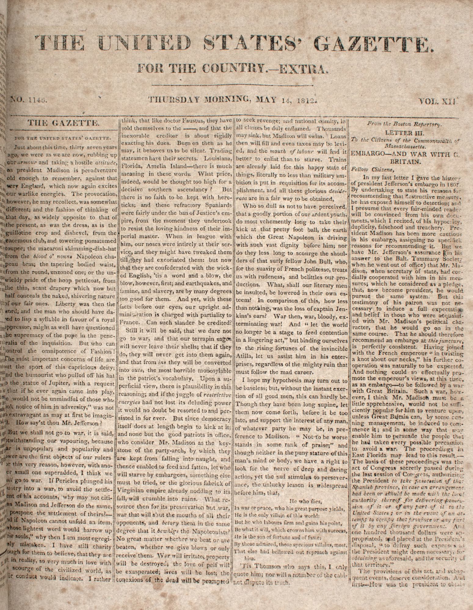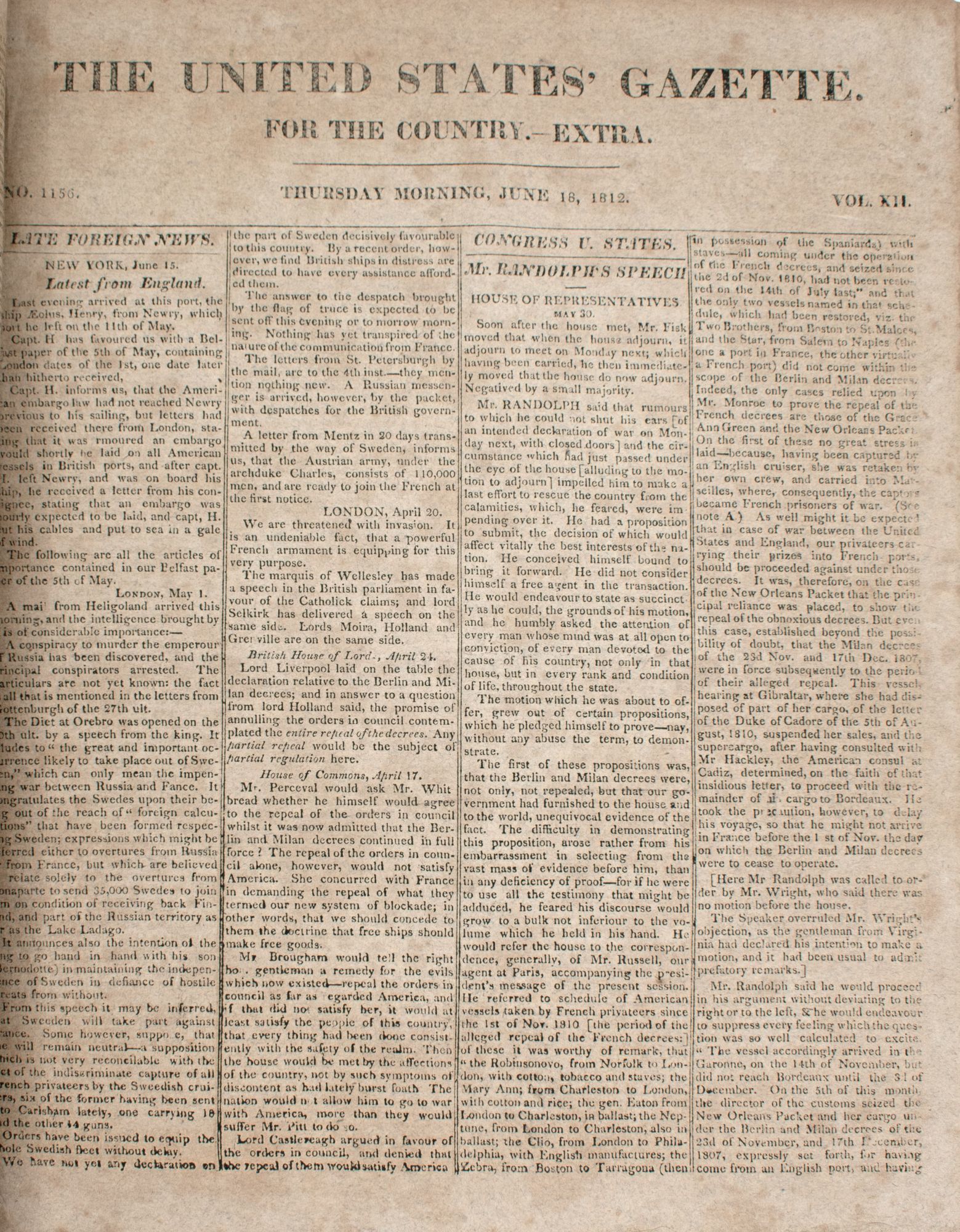 Philadelphia, 1812. Vol XII, Nos. 1134 to 1212 [lacking No. 1154]. plus newspaper extras dated April 16, May 14, June 1 and 18, August 17 and 24, Sept. 10 and 28. Together, 86 issues. 4to. Contemporary half calf and marbled paper boards, worn. Foxing. Vol XII, Nos. 1134 to 1212 [lacking No. 1154]. plus newspaper extras dated April 16, May 14, June 1 and 18, August 17 and 24, Sept. 10 and 28. Together, 86 issues. 4to. Among the newspaper extras is one dated June 18, 1812 on the Declaration of war. The following extra covers the June 20 attack by an angry mob on the offices of the Federal Republican in Baltimore for the newspaper's anti-war stance.