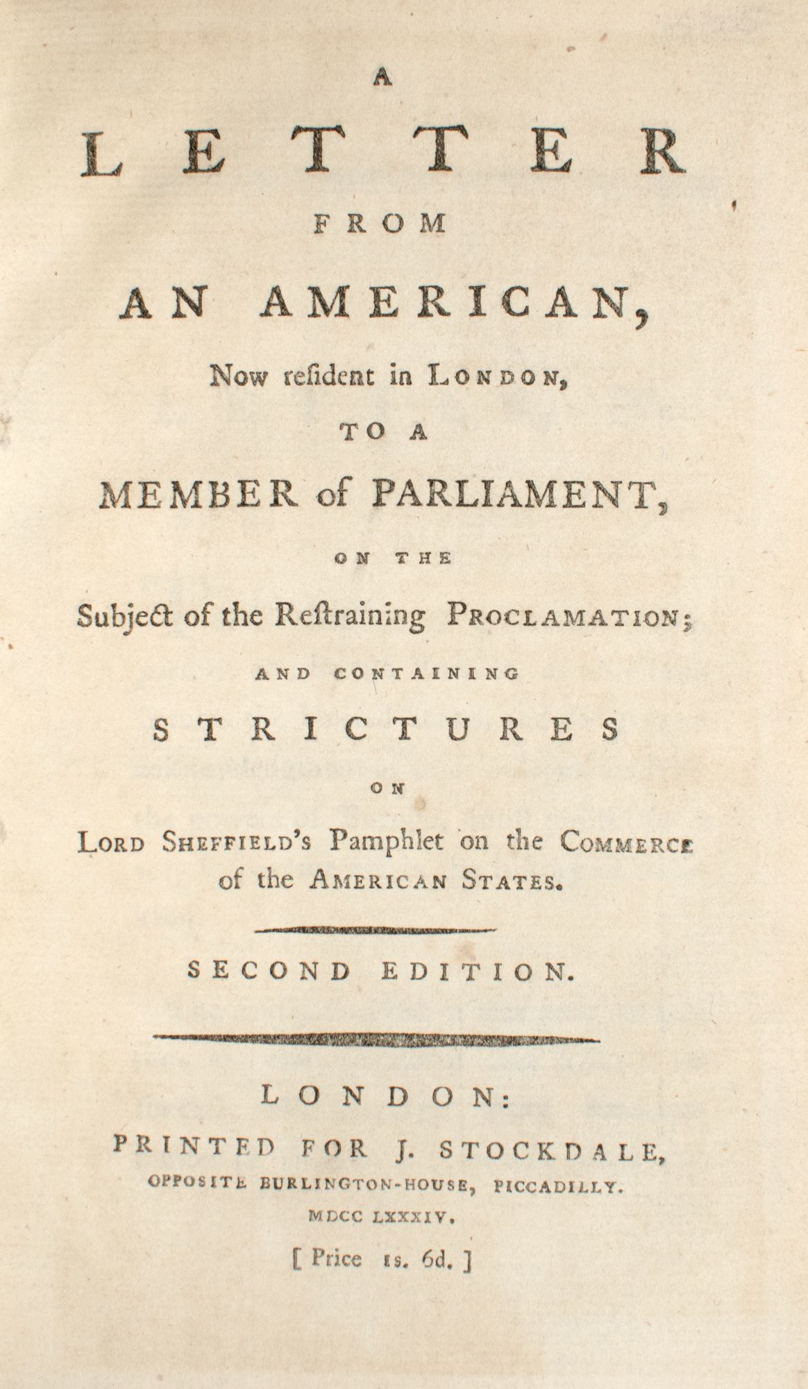 A Letter from an American, now Resident in London, to a Member of Parliament, on the Subject of the Restraining Proclamation; and Containing Strictures on Lord Sheffield's Pamphlet on the Commerce of the American States
