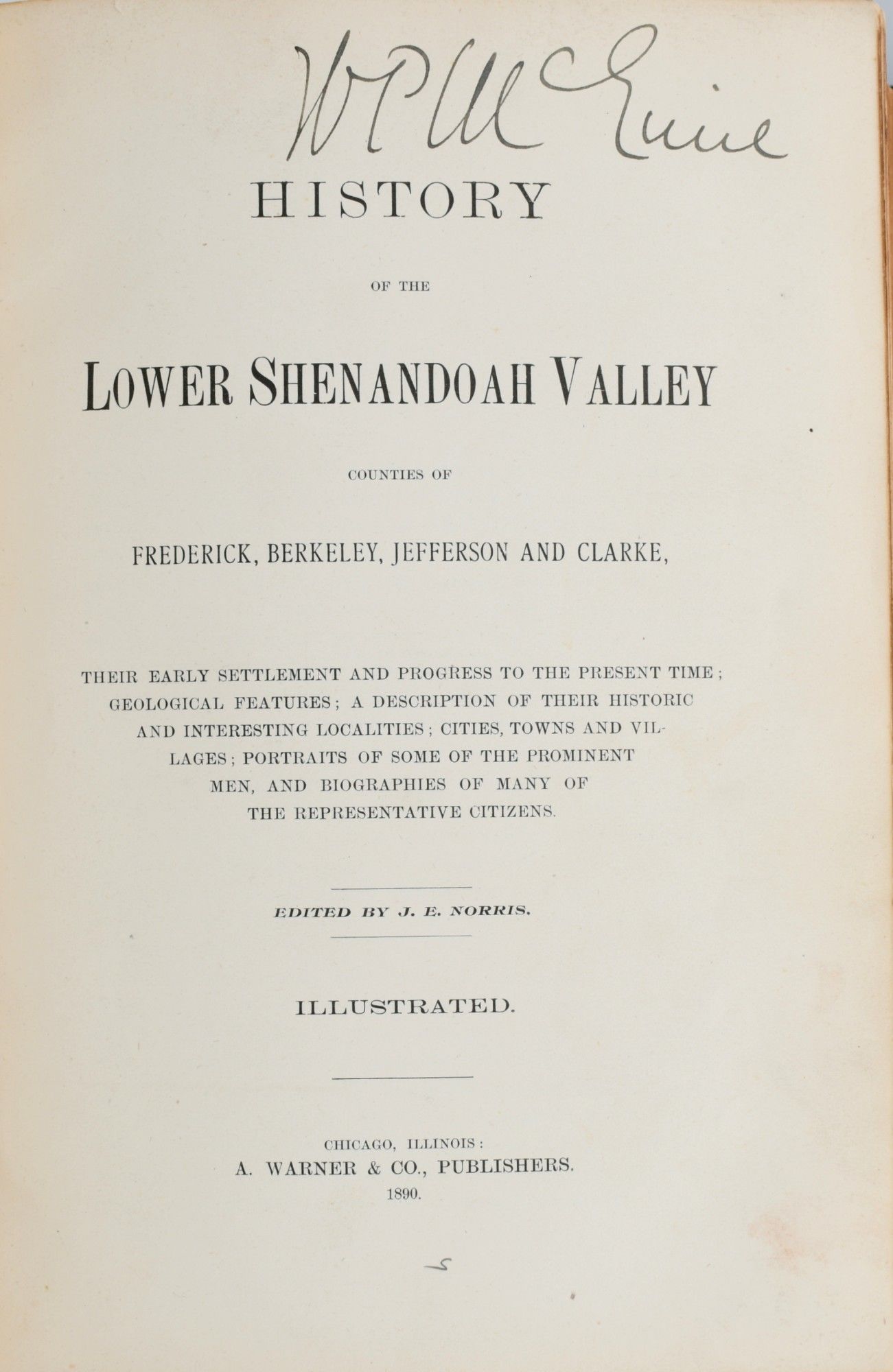 [VIRGINIA] HISTORY OF THE LOWER SHENANDOAH VALLEY COUNTIES OF FREDERICK, BERKELEY, JEFFERSON AND CLARKE, THEIR EARLY SETTLEMENT AND PROGRESS TO THE PRESENT TIME; GEOLOGICAL FEATURES; A DESCRIPTION OF THEIR HISTORIC AND INTERESTING LOCALITIES; CITIES, TOWNS AND VILLAGES; PORTRAITS OF SOME OF THE PROMINENT MEN, AND BIOGRAPHIES OF MANY OF THE REPRESENTATIVE CITIZENS