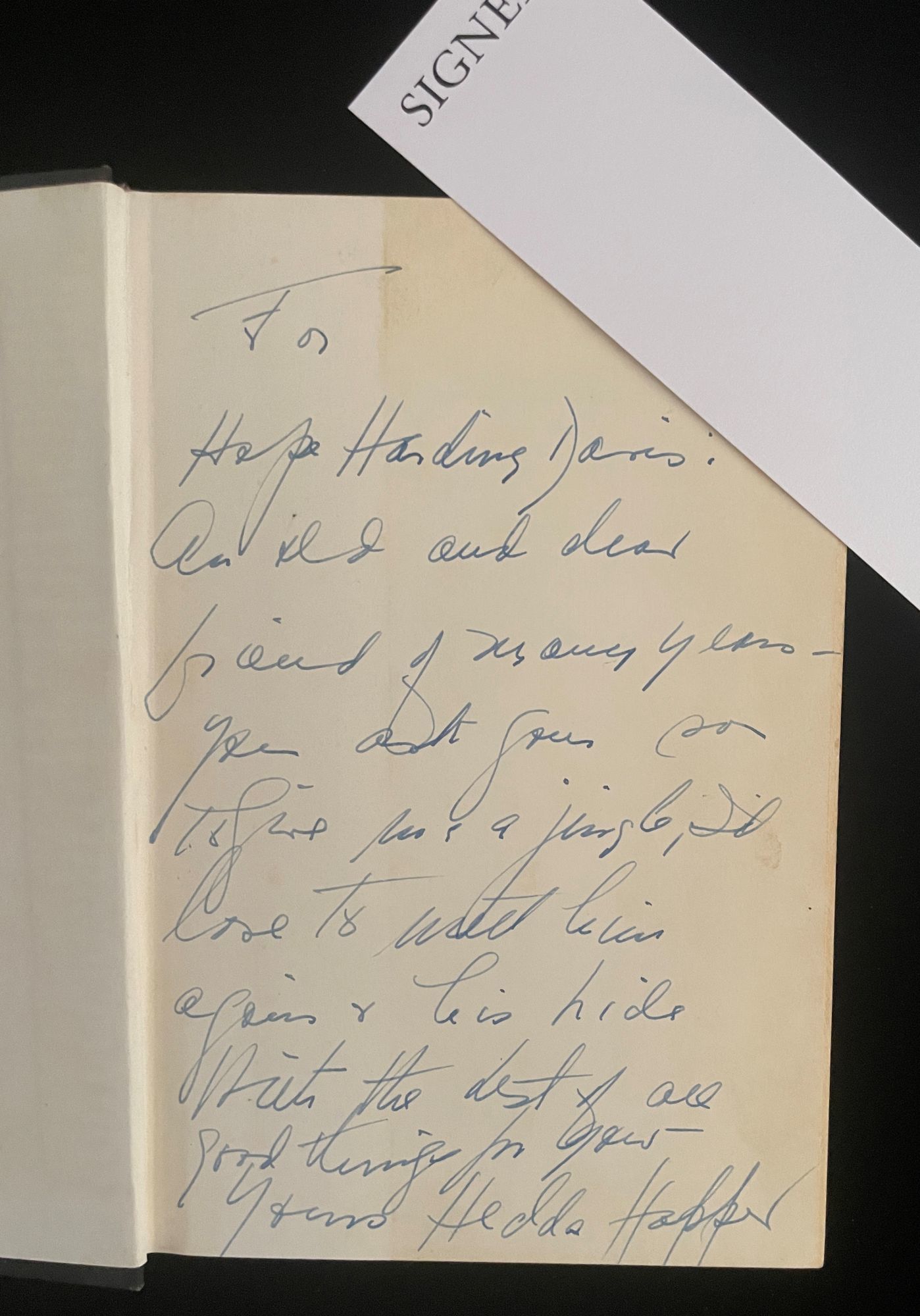 Garden City: Doubleday, 1963. 1st Edition. Hardcover. Very Good +/Very Good. Inscribed by famous Hollywood gossip columnist to Hope Harding Davis, artist and one-time MGM screenriter, and daughter of NYTimes war correspondent Richard Harding Davis and Bessie McCoy, famous Ziegfield Follies showgirl. "For Hope Harding Davis, An old and dear friend of many years - (indecipherable).and his hide. With the best of all good things for now. Yours, Hedda Hopper". The middle of the quotation is unreadable but perhaps amounts to Hedda's supportive words to her friend Hope who had weathered a divorce a few years before; Hope committed suicide in 1976 at the age of 61. Price-clipped dustjacket with a few closed tears and slightly sunned spine.