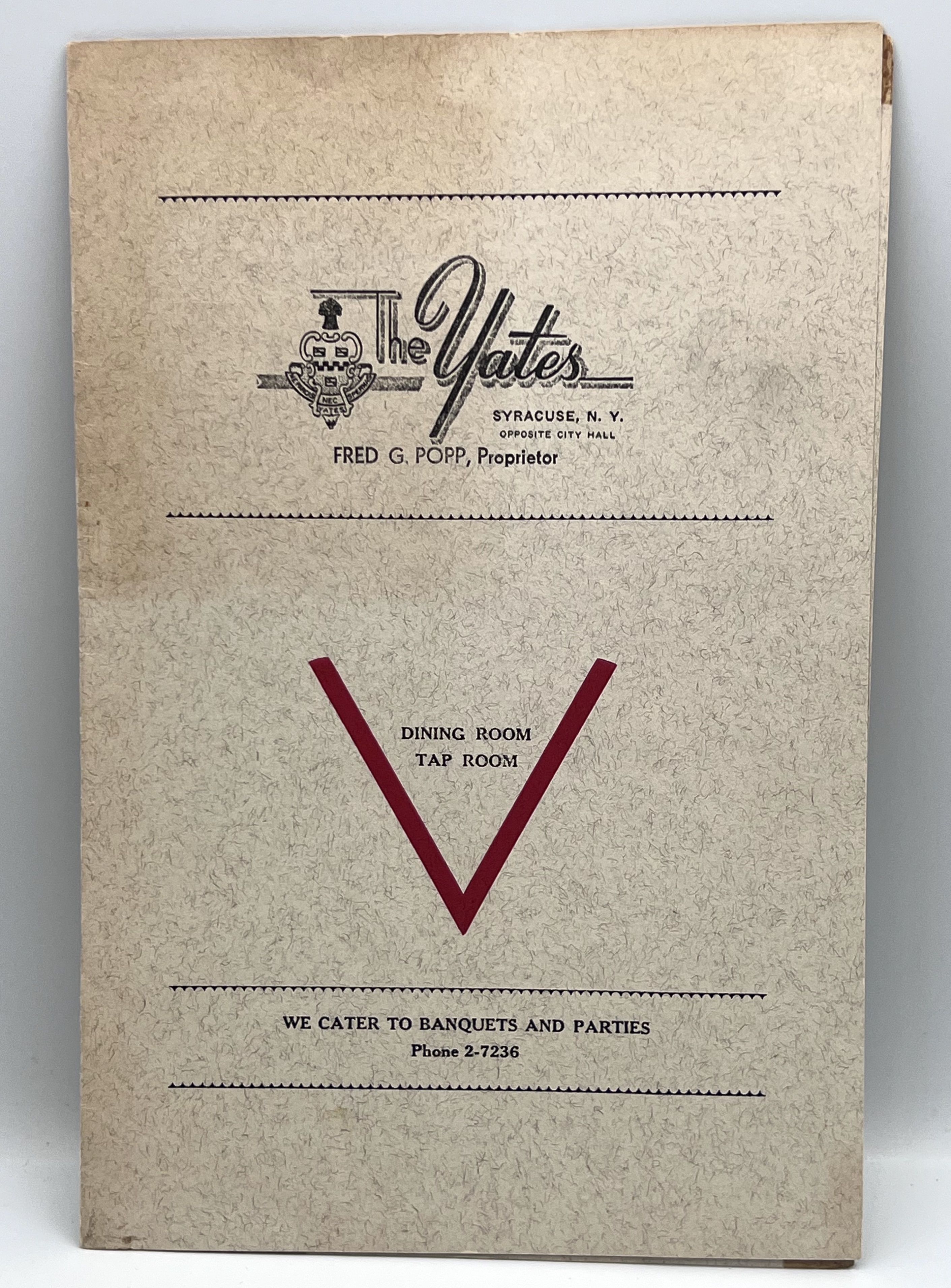 Syracuse, NY, 1950. Wraps. Cream wrap. Good. 10 x 6 1/2 in. La Carte Menu from The Yates Dining Room and Tap Room. States that they cater to banquets and parties. Items on the menu include; oysters, steaks, salads, desserts, and several alcoholic beverages. Tape residue on inside.