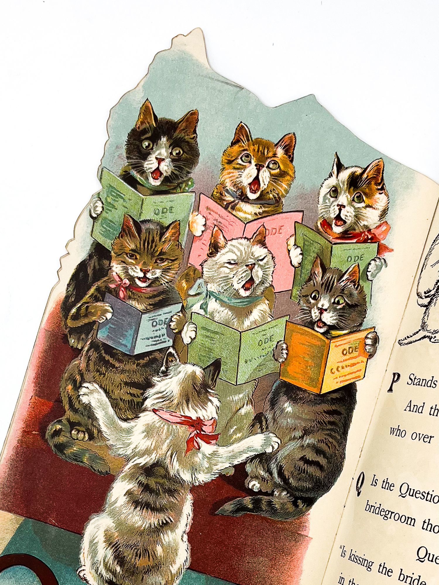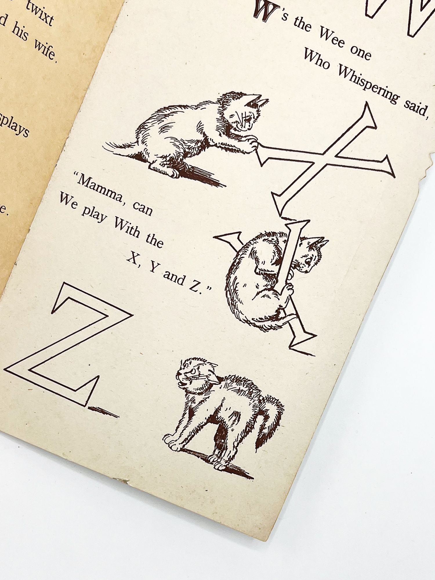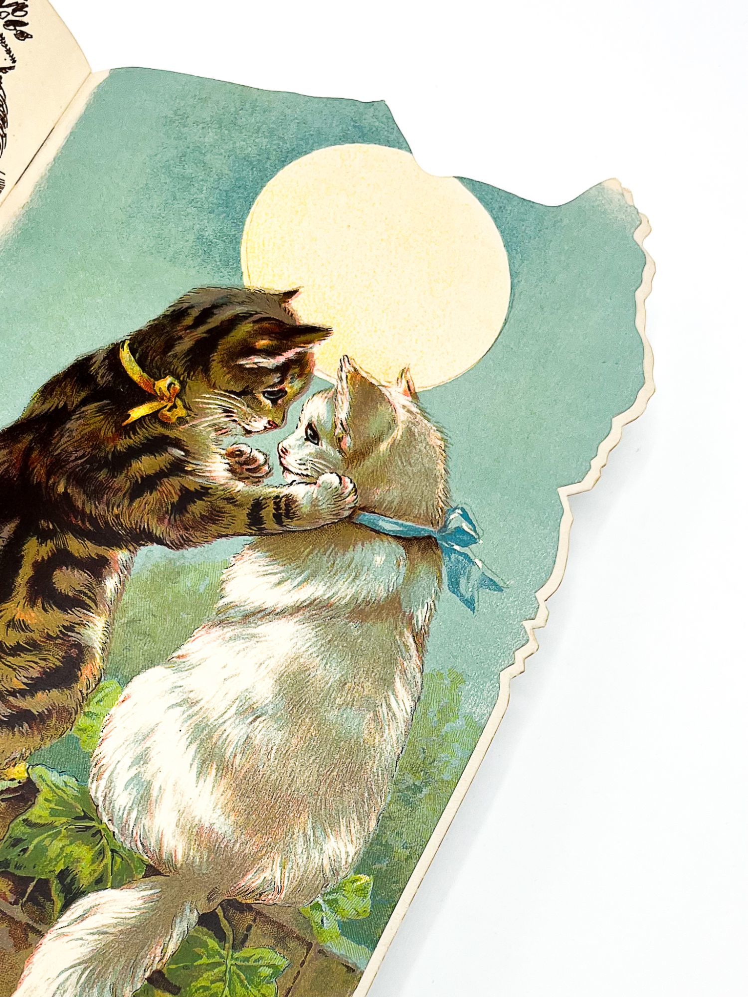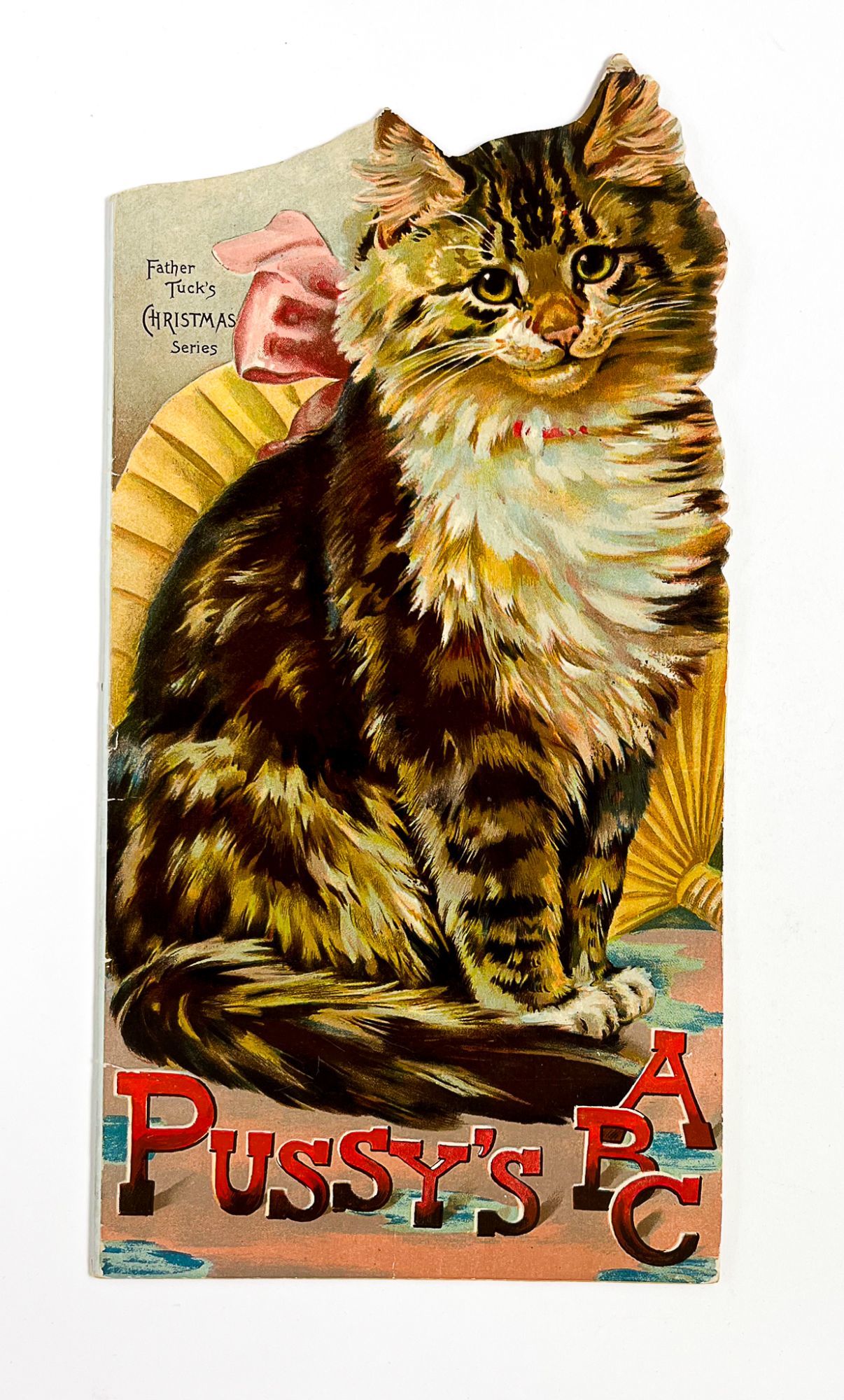 London: Raphael Tuck & Sons Ltd, 1890. Near fine.. Charming ABC book in the form of a handsome and fluffy cat, containing a feline love story told with each of the letters of the alphabet. The love story of Fluff the angora cat and Bob the local stray is as good as any romantic comedy, and their kittens playing with the X, Y, and Z at the end are simply adorable. 14.5'' x 7.5''. Original die-cut color pictorial wrapper. Illustrated with four color plates and in brown throughout. [12] pages. Wrapper with mild edgewear, a touch of rubbing to rear. Leaves with a hint of toning. Vibrant.