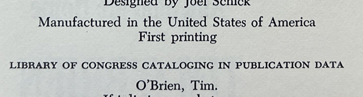 New York: Delacorte Press, 1973. First Edition. Hardcover. Very Good/Near Fine. Very Good in a Near Fine jacket, unclipped ($5.95), creased at the front and back flaps, a few small closed tears at the top edge. Quarter yellow cloth with green paper on the boards. Firmly bound with a slight forward lean, some remnants of tape on the endpapers, clean otherwise. O'Brien's first novel about his experiences as a soldier in Vietnam.