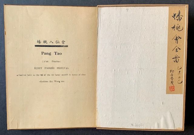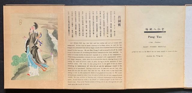 1940. Boards. Very Good +. The "Eight Fairies Festival" in Chinese folklore, " a festival held on the 3rd of the 3rd lunar month in honor of the Goddess Hsi Wang Mu". A bound collection of text (in both Chinese and English), unfolding like an accordion and including tipped-in color plates of different figures in ancient Chinese mythology. A clean, VG+ octavo in its plain wood-grained boards, with very light bowing along the edges.