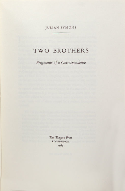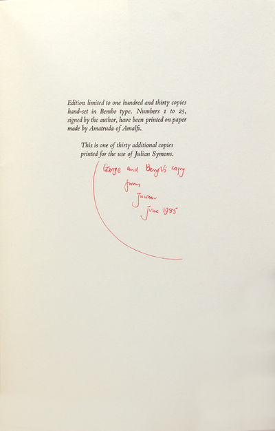 Edinburgh: The Tragara Press, 1985. One of 30 copies for the author’s use, specially printed on paper made by Amatruda of Amalfi. Signed by the author. Frontispiece portrait after Wyndham Lewis. 1 vols. 8vo. Original decorated wrappers, printed paper label. Fine. One of 30 copies for the author’s use, specially printed on paper made by Amatruda of Amalfi. Signed by the author. Frontispiece portrait after Wyndham Lewis. 1 vols. 8vo. Crime writer Julian Symons was the younger brother of A.J.A. Symons, noted bibliophile and author of the exemplary biography The Quest for Corvo