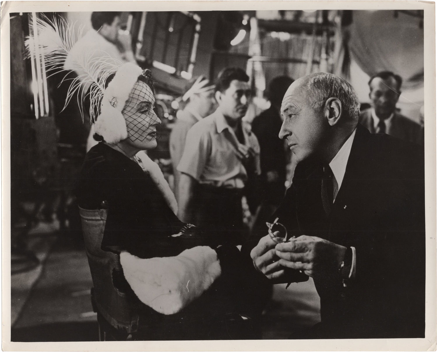 Hollywood: Paramount Pictures, 1949. Vintage studio still photograph from the 1950 film, showing actors Cecil B. DeMille and Gloria Swanson talking on the set.