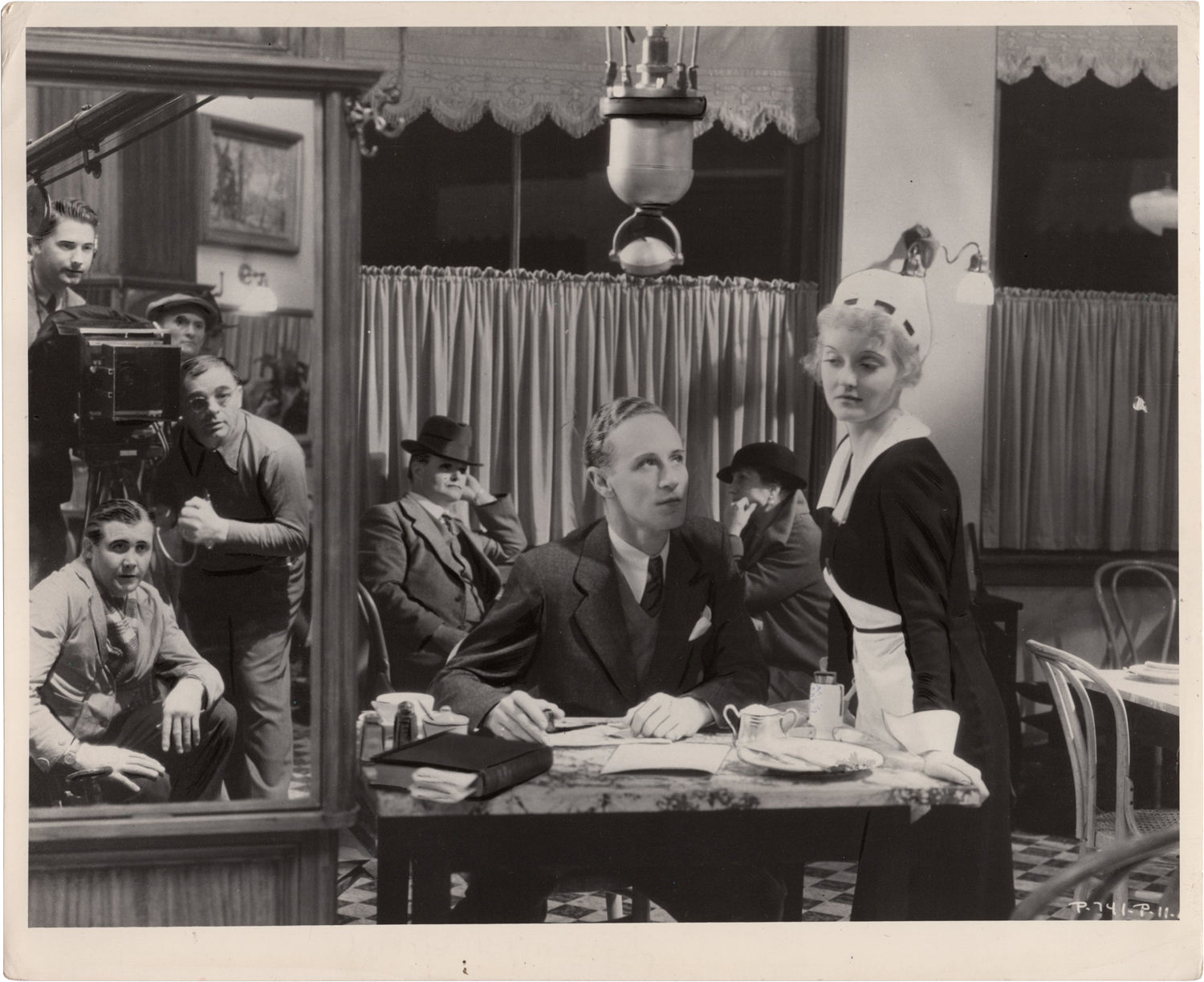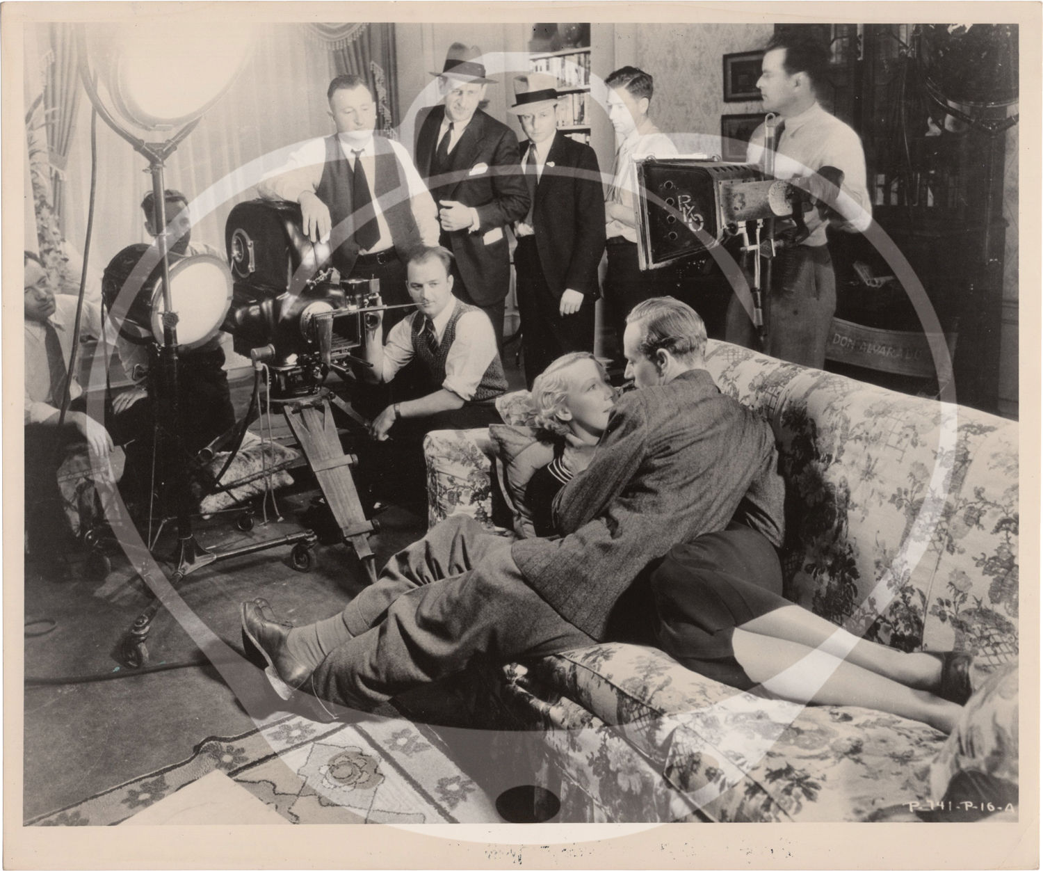 London: National Film Archive, 1934. Two vintage reference photographs from the 1934 film, one showing actors Bette Davis and Leslie Howard, the other showing director John Cromwell and a camera crew capturing a scene with Kay Johnson and Howard. Both with the stamp of National Film Archive on the verso.