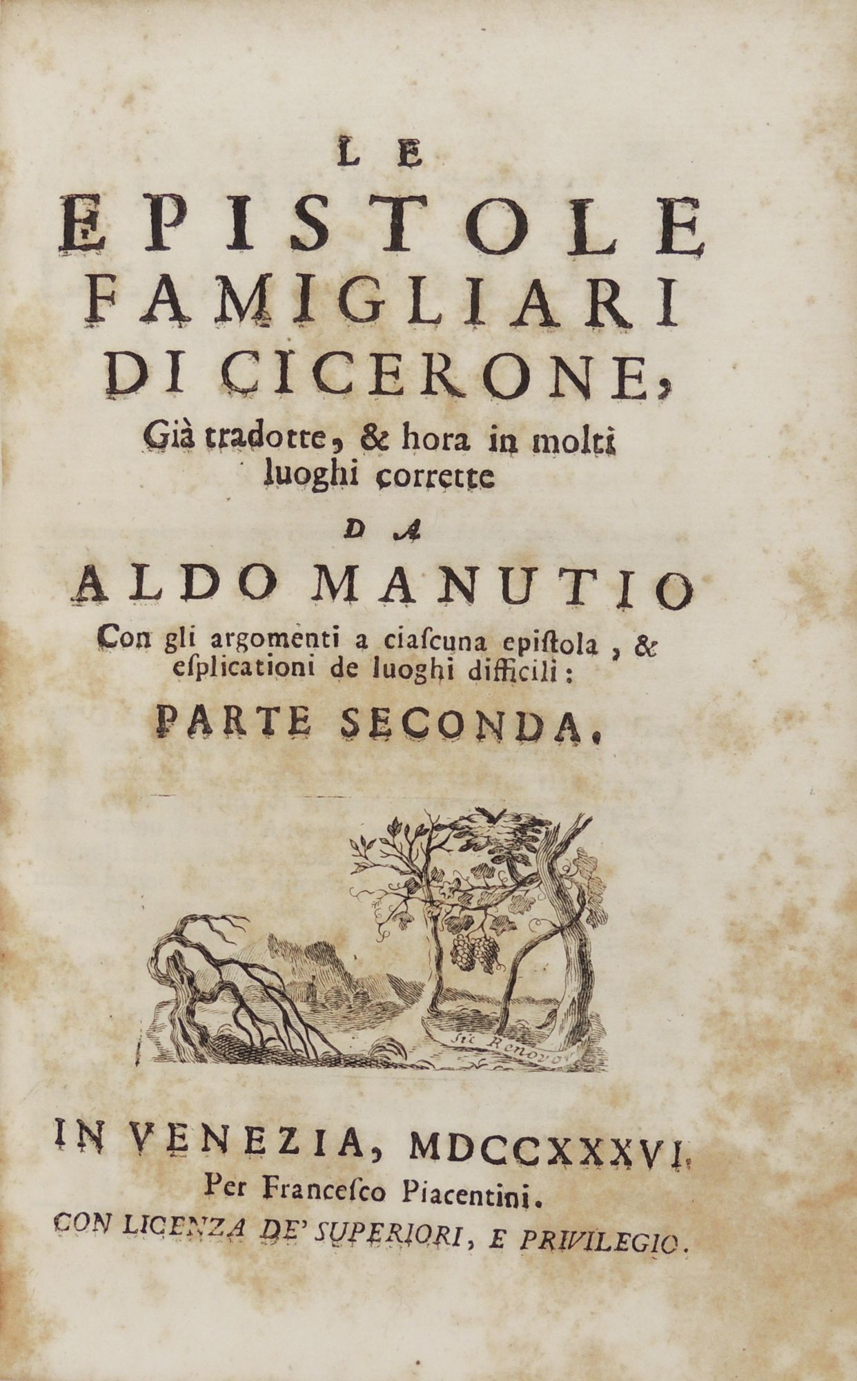 Le Epistole Famigliari di Cicerone, Già tradotte, & hora in molti luoghi corrette da Aldo Manutio. Con gli argomenti a ciaseuna epistola & esplicationi de luoghi difficili: Parte Seconda. [The Family Epistles of Cicero, Already translated, & now in many places corrected by Aldus Manutio. With arguments to each epistle & explanations of difficult places: Part Two]