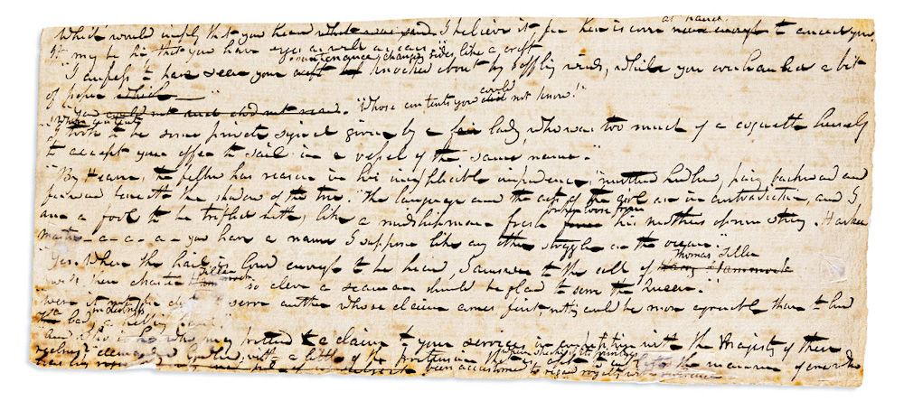 [1828]. Manuscript. A few small holes affecting text repaired with tissue, minor scattered foxing and soiling. Very Good. Unsigned handwritten fragment of his working draft of this novel about the abduction of a woman by a pirate. Two pages in dark ink in his small hand, approximately 600 words, on both sides of an 8" x 3-1/4" sheet. With a separate card SIGNED by the author's daughter, also an author, Susan Fenimore Cooper, dated Aug. 1889 and stating: "From the 'Water-Witch,' written at the 'Casa Tasso,' Sorrento, in 1828." Cooper manuscript material is scarce in the trade.