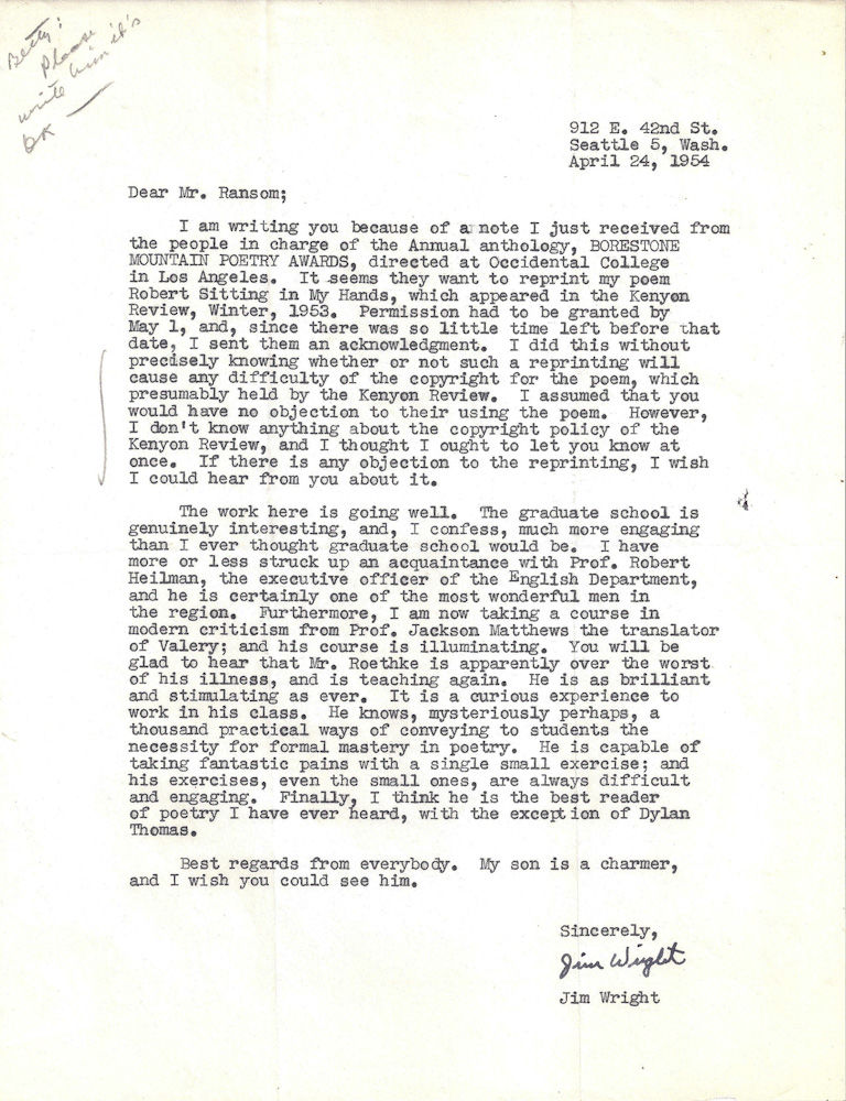 Seattle, 24 April 1954. Letter. About Fine. Fine, single-spaced typed letter on one side of a 8-1/2" x 11" sheet of paper to poet and teacher John Crowe Ransom SIGNED "Jim Wright" about permission to reprint a poem first published in THE KENYON REVIEW. Wright, 26 at the time, was a former student of Ransom's at Kenyon College and here talks about how engaging graduate school (the University of Washington) is. "You will be glad to hear that Mr. Roethke is apparently over the worst of his illness, and is teaching again. He is as brilliant and stimulating as ever. It is a curious experience to work in his class. He knows, mysteriously perhaps, a thousand practical ways of conveying to students the necessity for formal mastery in poetry. He is capable of taking fantastic pains with a single small exercise; and his exercises, even the small ones, are always difficult and engaging. Finally, I think he is the best reader of poetry I have ever heard, with the exception of Dylan Thomas." Pencil notation in upper blank margin by Ransom.