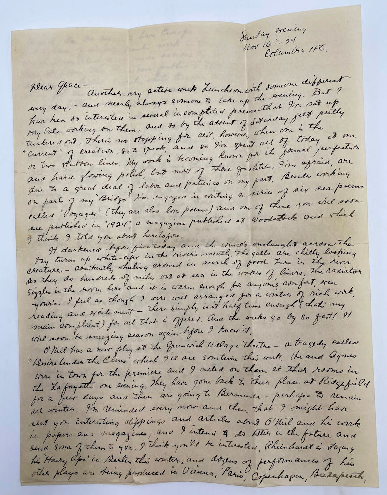 Columbia Hts [New York], 16 November 1924. Letter. Creases from folding, otherwise about Fine. Very scarce, closely written two-page AUTOGRAPH LETTER SIGNED with superb content two years before the publication of his first book, WHITE BUILDINGS, to his mother, addressed as "Dear Grace." In part: "Another very active week. Luncheon with someone different every day, -- and nearly always someone to take up the evening. But I have been so interested in several incompleted poems that I've sat up very late working on them, and so by the advent of Saturday felt pretty tuckered out. There's no stopping for rest, however, when one is the 'current' of creation, so to speak, and so I've spent all of today at one or two stubborn(?) lines. My work's becoming known for its formal perfection and hard glowing polish, but most of those qualities, I'm afraid, are due to a great deal of labor and patience on my part. Besides working on part of my BRIDGE I'm engaged in writing a series of six sea poems called VOYAGES (they are also love poems) and one of these you will soon see published in '1924,' a magazine published at Woodstock and which I think I told you about heretofore." Crane than writes a poetic paragraph describing the weather and the river before talking about Eugene O'Neill: "O'Neil [sic] has a new play at the Greenwich Village Theatre -- a tragedy called DESIRE UNDER THE ELMS which I'll see sometime this week. He and Agnes were in town for the premiere and I called on them at their rooms in the Lafayette one evening.... He seems to have Europe in applause more than America. That's true of Waldo Frank's work in France, also, where he has been much translated and more seriously considered, far more so, than here at home. The American public is still strangely unprepared for its men of higher talents, while Europe looks more and more to America for the renascence of a creative spirit." Crane is happy to get his mother's letters and rejoices in her having "a lyric evening," dancing and drinking. "I still like to think of those five o'clock booze parties we had in the office and how giddily I sometimes came home for dinner. You were very charming and sensible about it all, too, and I thank my stars that while you are naturally an inbred Puritan you also know and appreciate the harmless gambols of an exuberant nature like my own. It all goes to promise that we shall have many merry times together later sometime when we're a little closer geographically." He concludes: "My -- but how the wind is blowing. Rain, too, on the window now! There was a wonderful fog for about 18 hours last week. One couldn't even see the garden close behind the house -- to say nothing of the piers. All night long there were distant tinklings, buoy bells and siren warnings from river craft. It was like wakening into a dream land in the early dawn -- one wondered where one was with only a milky light in the window and that vague music from a hidden world. Next morning while I dressed it was clear and glittering as usual. Like champagne, or a cold [?] to look it. Such a world! Love, as always, your Hart." With the envelope hand-addressed by Crane to "Grace Hart Crane" and SIGNED by him with his address. Also with a 1964 invoice and letter from bookseller Henry W. Wenning. An especially significant piece of Crane's extensive family correspondence, this letter has often been reprinted, appearing specifically in Thomas S. W. Lewis (editor), LETTERS OF HART CRANE AND HIS FAMILY (NY: Columbia UP, 1974), on pages 371-373. And while Lewis's Calendar of Letters indicates that the original is owned by Columbia, recent correspondence with Columbia reveals that that published claim is incorrect: this letter somehow escaped Columbia's acquisition of the Crane archive in the 1950s. A key item of Crane's that has been off the market for nearly 60 years. For the four years preceding Crane's suicide in 1932, Grace Crane had not spoken to her son. She nevertheless became his literary executor and devoted her life to promoting his work.