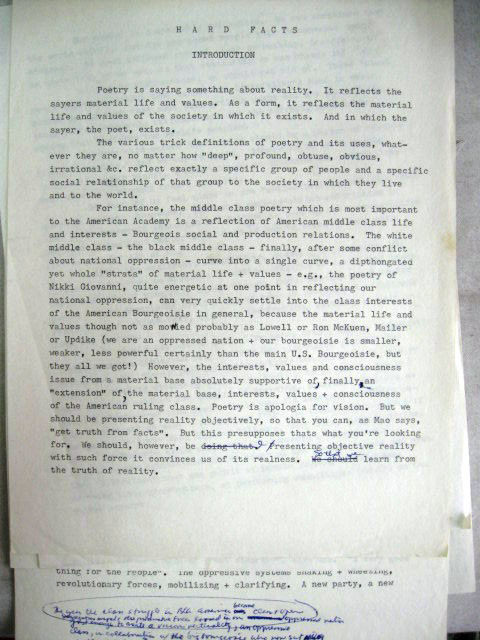 [1975]. Manuscript. Near Fine. TYPED MANUSCRIPT (5 pages) of the Introduction to his book of poetry HARD FACTS. Baraka has made several alterations and additions in the text including about 50 words in his hand at the bottom of the fourth page: "The year the class struggle in Blk America became clear & open Segregation [?] & the productive forces loosed in on oppressed [?] just enough to create a vicious verticality, an oppressive class, in collaboration w/ the big bourgeosie who now sat in the white house openly & picked their toes."