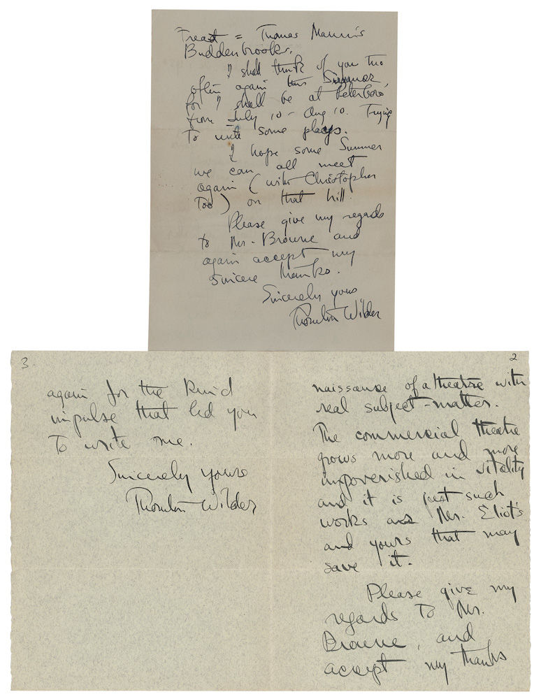 Hamden, CT, 1930 & 1935. Letter. Creases from folding, otherwise Fine. Two early AUTOGRAPH LETTERS SIGNED (ALSs) to Henzie Browne, the wife of British theater director E. Martin Browne on 5 total pages, 5-3/4" x 8-1/2" and 6" x 8", dated 20 June 1930 and 11 June 1935. The earlier handwritten letter, in full: "Indeed I am very happy that you did write me your generous and encouraging letter. And Im very glad that you were not disappointed in the book at that particular time: Ive taken potluck at ships libraries many times and only once had a real deck-chair treat = Thomas Manns BUDDENBROOKS. I shall think of you two often again this summer, for I shall be at Peterboro from July 10 - Aug 10. Trying to write some plays. I hope some summer we can all meet again (with Christopher too) on that hill. Please give my regards to Mr. Brown and again accept my sincere thanks. Sincerely yours Thornton Wilder." In the second letter, Wilder comments on T. S. Eliots plays and the impoverishment of commercial theatre. In full: "Indeed I remember you very well, and it was a great pleasure to receive your generous word about my book. It was a pleasure to know also that you have so large a part in a venture of such importance as the production of Mr. Eliots plays. I should like to think that those plays will some day be seen to have had a large part in the renaissance of a theatre with real subject-matter. The commercial theatre grows more and more impoverished in vitality and it is just such works as Mr. Eliots and yours that may save it. Please give my regards to Mr. Browne, and accept my thanks again for the kind impulse that led you to write me. Sincerely yours Thornton Wilder." E. Martin Browne collaborated for many years with T. S. Eliot and was the first producer of many of Eliots plays, including MURDER IN THE CATHEDRAL.